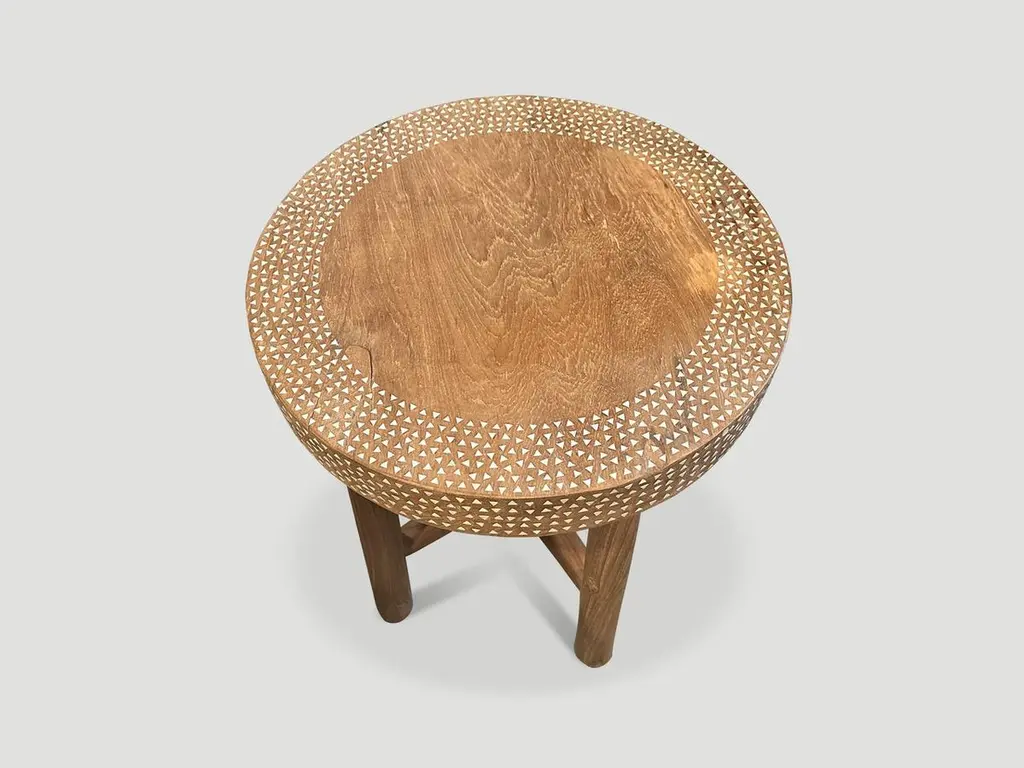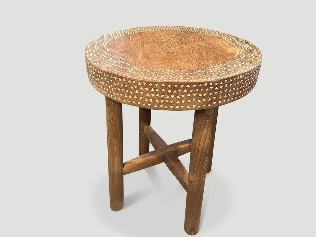 Beautiful shell inlaid side table or pedestal hand made from reclaimed teak wood. Each piece of white shell is carefully hand cut and applied to create this stunning table with a 3.5” thick top. We added a minimalist cross base. It’s all in the details. Custom sizes available. Own an Andrianna Shamaris original.Andrianna Shamaris. The Leader In Modern Organic Design.