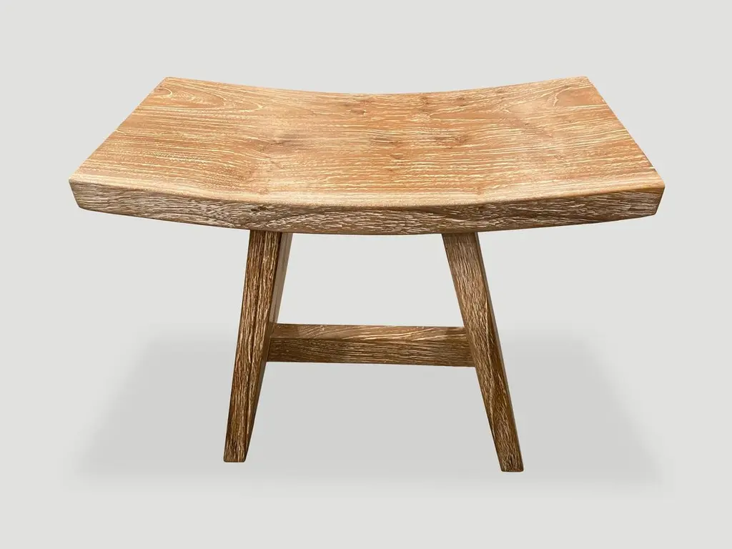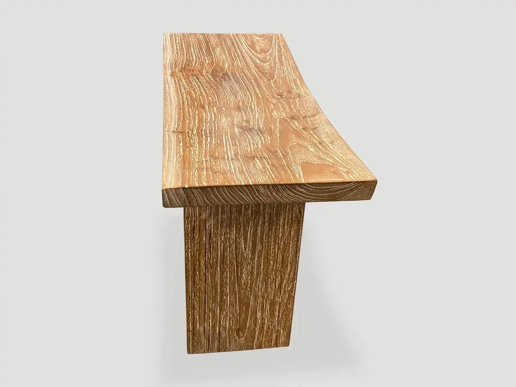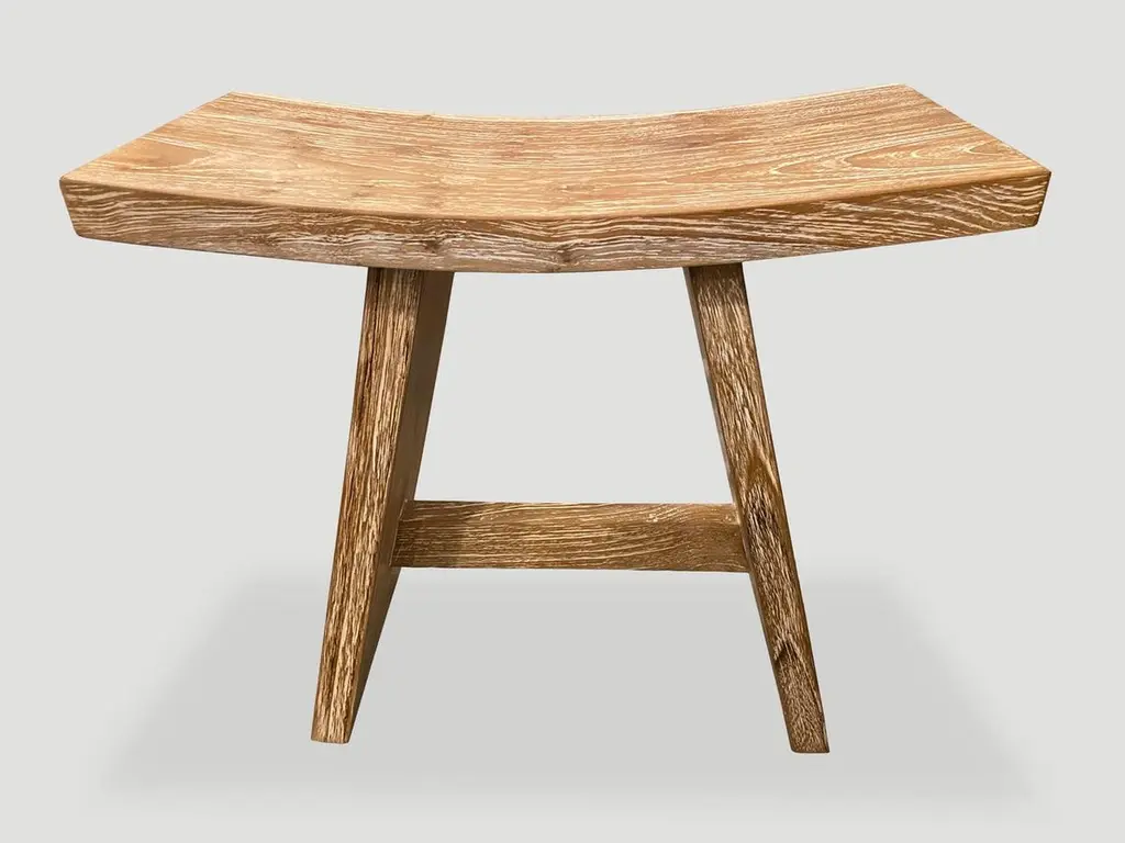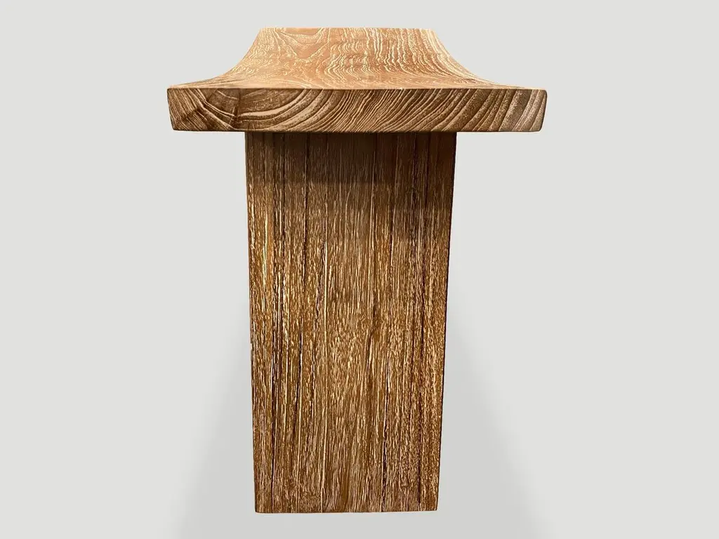 Minimalist reclaimed teak bench perfect anywhere from a bathroom, kitchen or bedroom. The top section is made from a single teak slab. We added a cerused finish which enhances the grain of the wood. Own an Andrianna Shamaris original.Andrianna Shamaris. The Leader In Modern Organic Design.