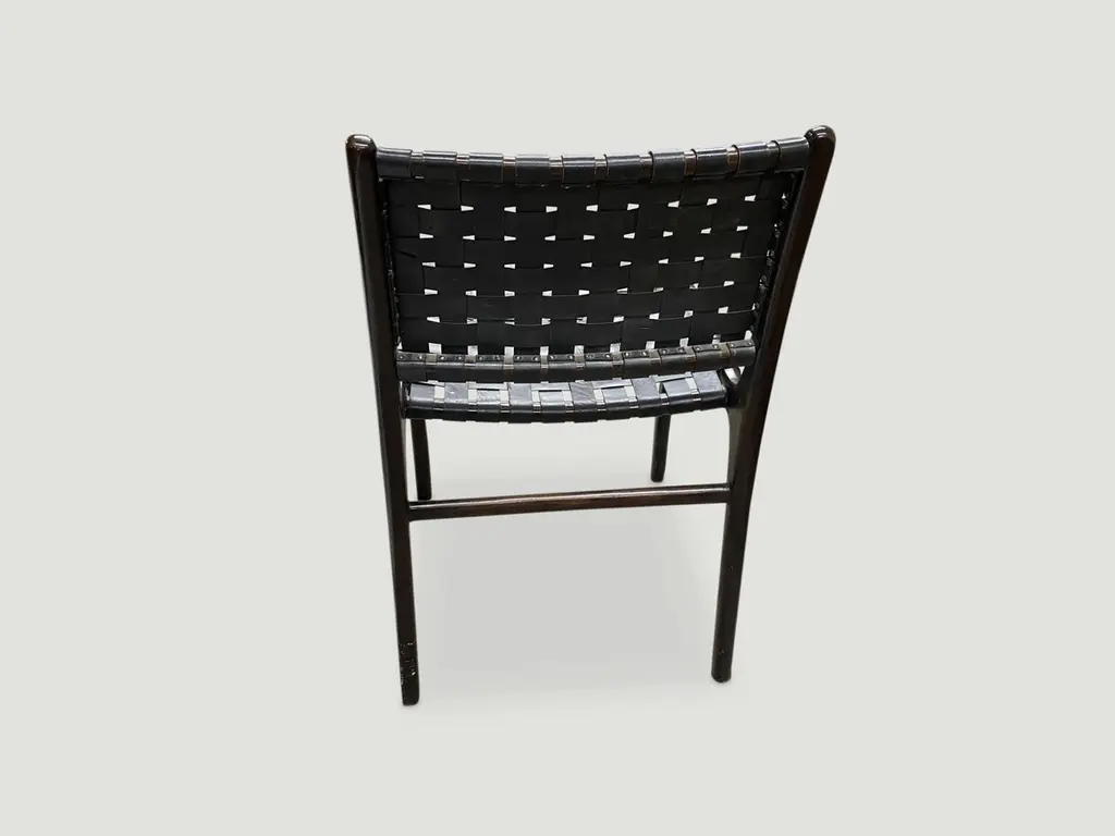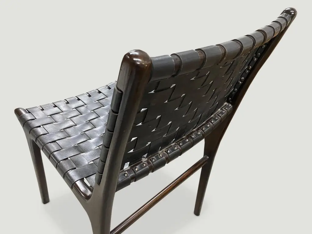 Premium quality leather with teak frame. Custom teak wood stains and leather available.Premium Quality Leather Chair with reclaimed teak frame. We utilize the finest quality leather for our modern series chairs. The hand selected leather is carefully woven to cover the seat and backrest to achieve a perfect balance between aesthetics and comfort.Own an Andrianna Shamaris original.Andrianna Shamaris. The Leader In Modern Organic Design.