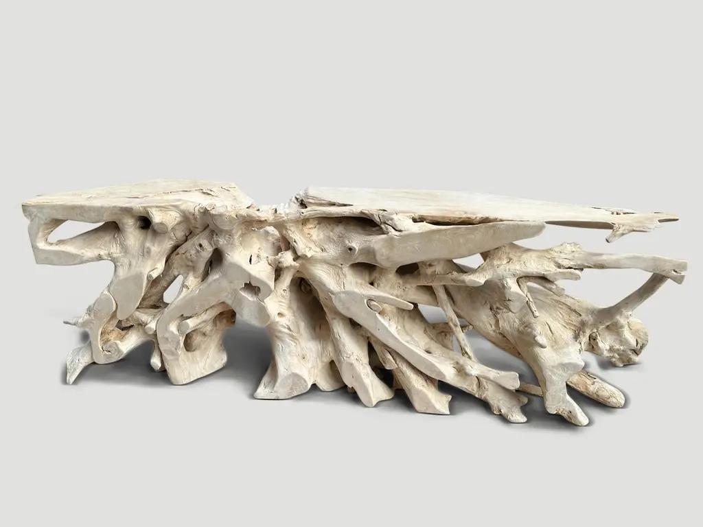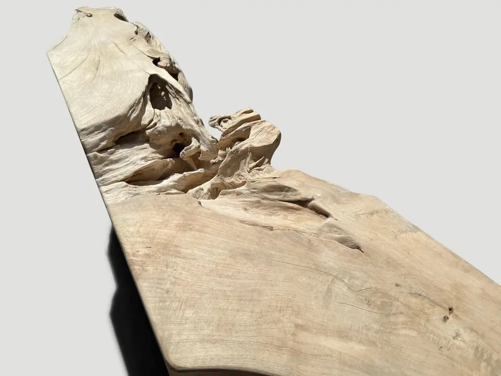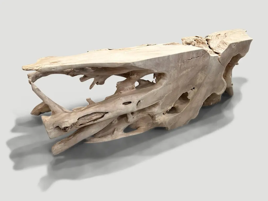 Impressive natural organic formed console table made from a hundred year old reclaimed teak root. Fabulous on both sides. Glass or lucite can be added, if preferred on the top section. Finished with a light white wash revealing the beautiful wood grain. It’s all in the details.The St. Barts Collection features an exciting line of organic white wash, bleached and natural weathered teak furniture. The reclaimed teak is bleached and left to bake in the sun and sea salt air for over a year to achieve this unique finish. Select pieces are infused with a brilliant aqua resin that is cracked to achieve a unique quartz crystal effect. The final result evokes imagery of the white sand beaches and brilliant aqua waters of the famous French Caribbean Island.Own an Andrianna Shamaris original.Andrianna Shamaris. The Leader In Modern Organic Design.
