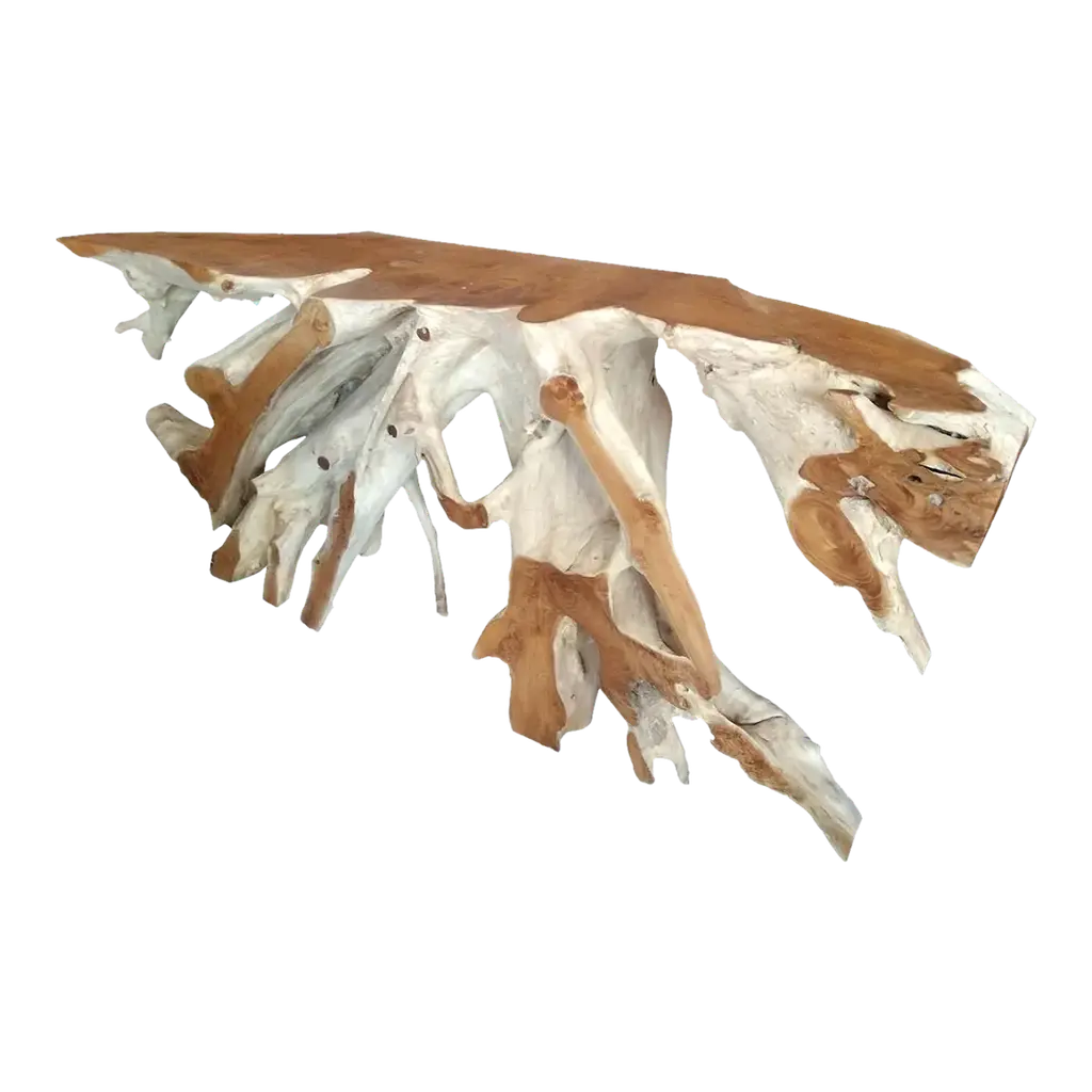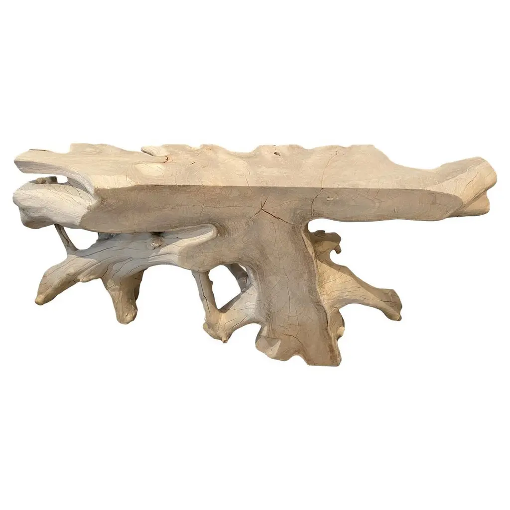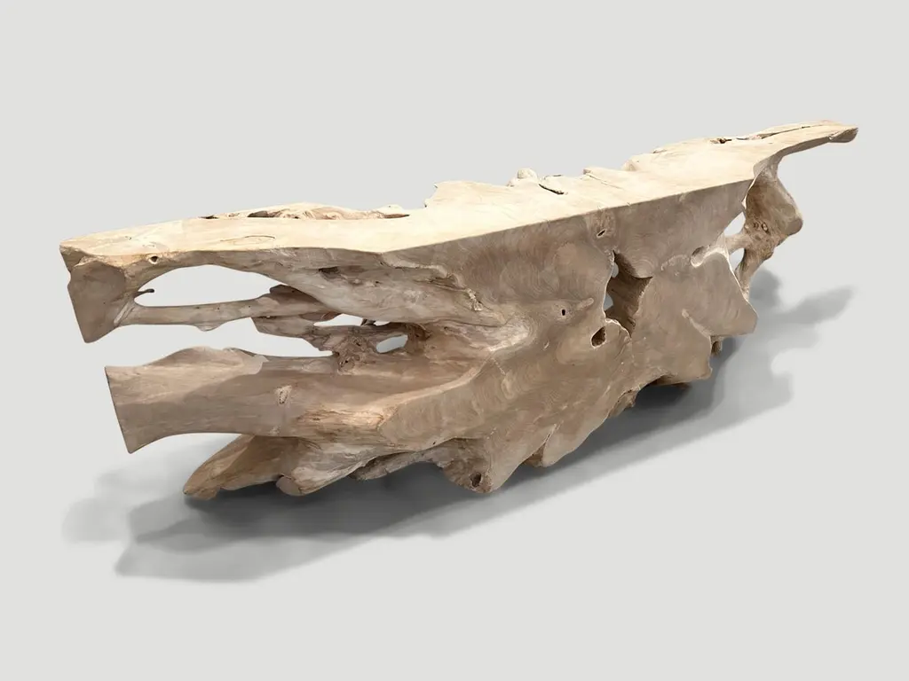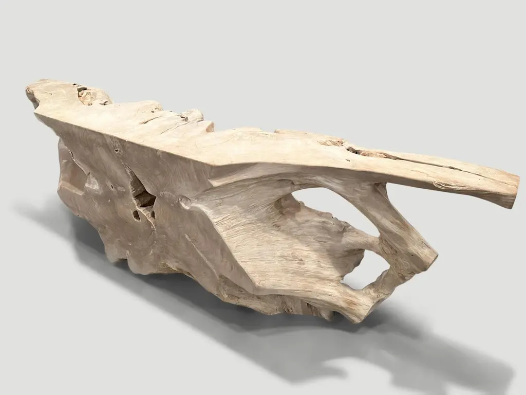 Impressive natural organic formed console table made from a hundred year old reclaimed teak root. Fabulous on both sides. Glass or lucite can be added, if preferred on the top section. Finished with a light white wash revealing the beautiful wood grain. It’s all in the details.The St. Barts Collection features an exciting line of organic white wash, bleached and natural weathered teak furniture. The reclaimed teak is bleached and left to bake in the sun and sea salt air for over a year to achieve this unique finish. Select pieces are infused with a brilliant aqua resin that is cracked to achieve a unique quartz crystal effect. The final result evokes imagery of the white sand beaches and brilliant aqua waters of the famous French Caribbean Island.Own an Andrianna Shamaris original.Andrianna Shamaris. The Leader In Modern Organic Design.