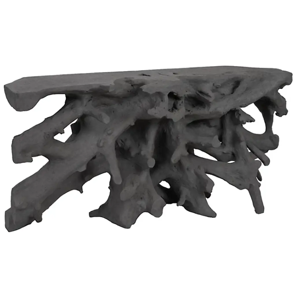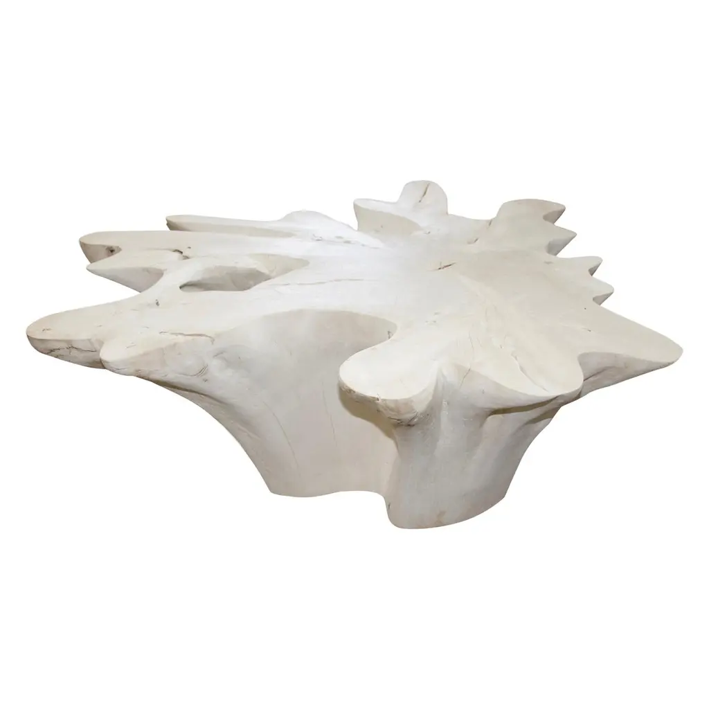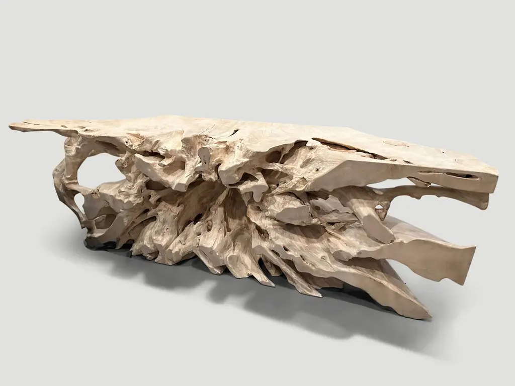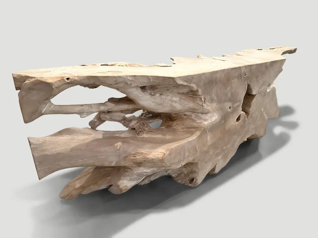 Impressive natural organic formed console table made from a hundred year old reclaimed teak root. Fabulous on both sides. Glass or lucite can be added, if preferred on the top section. Finished with a light white wash revealing the beautiful wood grain. It’s all in the details.The St. Barts Collection features an exciting line of organic white wash, bleached and natural weathered teak furniture. The reclaimed teak is bleached and left to bake in the sun and sea salt air for over a year to achieve this unique finish. Select pieces are infused with a brilliant aqua resin that is cracked to achieve a unique quartz crystal effect. The final result evokes imagery of the white sand beaches and brilliant aqua waters of the famous French Caribbean Island.Own an Andrianna Shamaris original.Andrianna Shamaris. The Leader In Modern Organic Design.