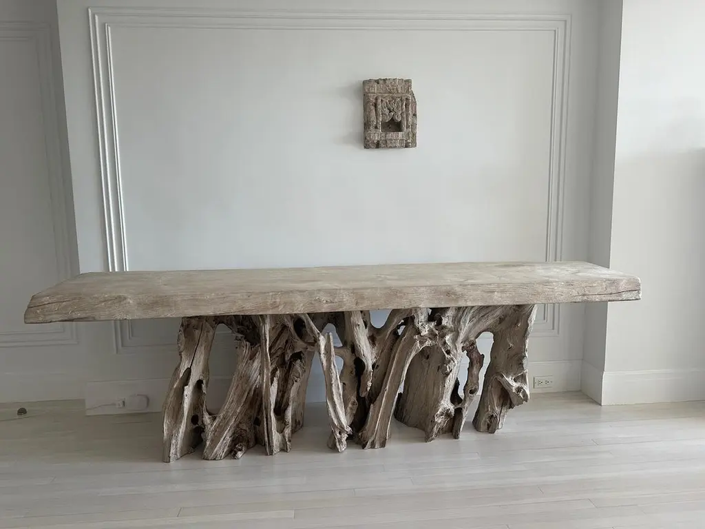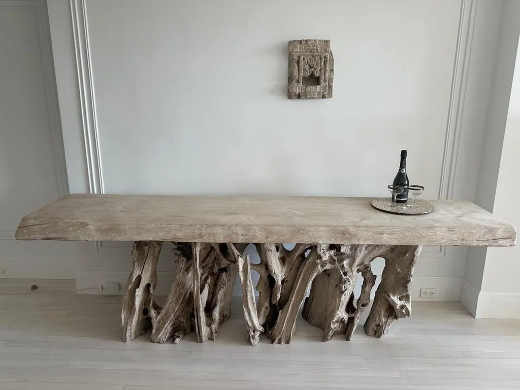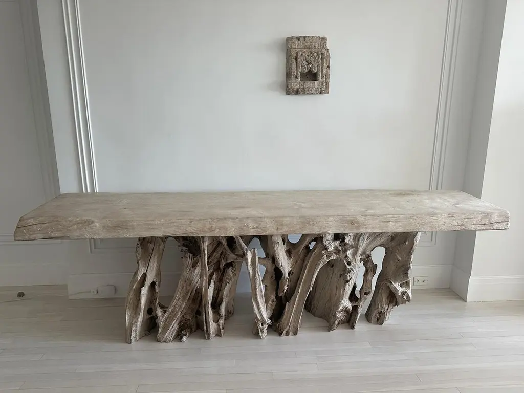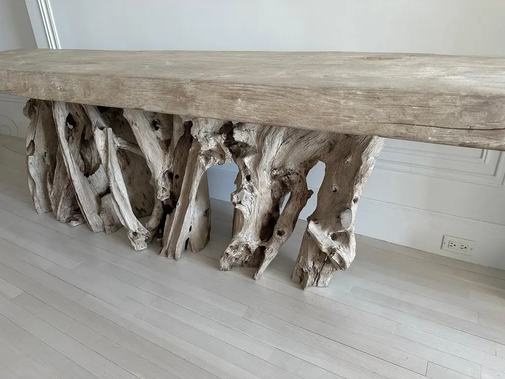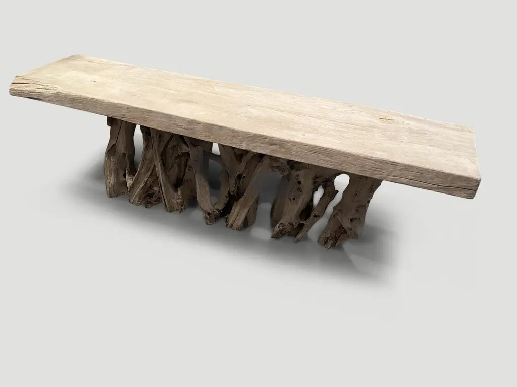 Impressive long console with a fantastic teak root base. This century old teak root resembles stone and is extremely rare and so sculptural. The live edge top is made from two long four inch thick reclaimed slabs. We bleached the top and added a light white wash revealing the beautiful wood grain. The base was cleaned and left to bake in the sun revealing the original grey tone. Both sides are simply stunning.The console embodies the Wabi Sabi philosophy that beauty can be found in imperfection and impermanence. It is a beauty of things modest and humble. A beauty of things unconventional. It is the opposite of vulgarity. The costs of achieving this kind of minimalism are seemingly inconsistent with its mission of aesthetic humility. This kind of luxury is for a select few: The Emperor of Japan had a Wabi garden. Wabi is for people who already have a lot.The St. Barts Collection features an exciting line of organic white wash, bleached and natural weathered teak furniture. The reclaimed teak is bleached and left to bake in the sun and sea salt air for over a year to achieve this unique finish. Select pieces are infused with a brilliant aqua resin that is cracked to achieve a unique quartz crystal effect. The final result evokes imagery of the white sand beaches and brilliant aqua waters of the famous French Caribbean Island.Own an Andrianna Shamaris original.Andrianna Shamaris. The Leader In Modern Organic Design.
