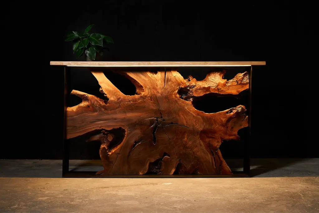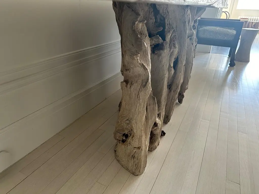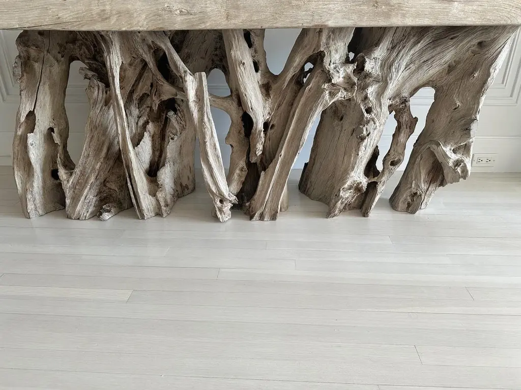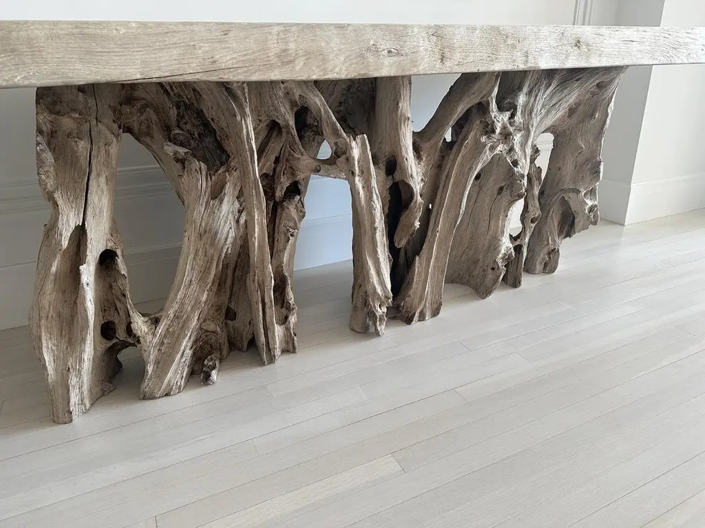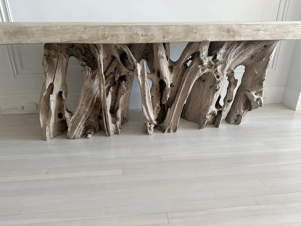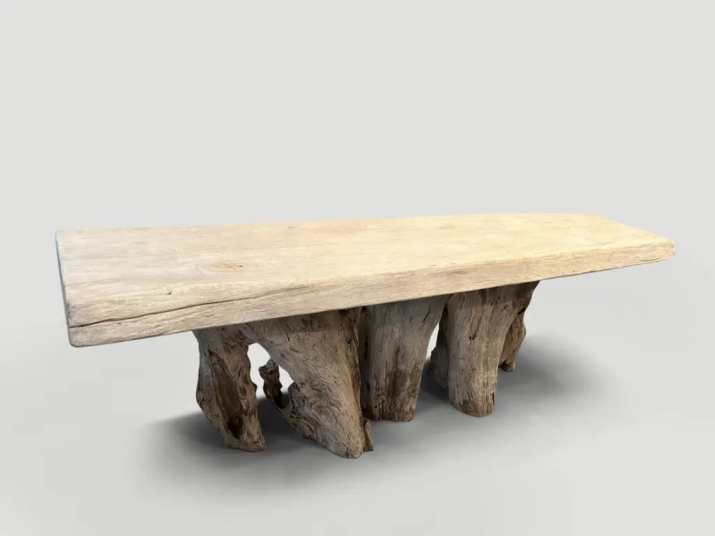 Impressive long console with a fantastic teak root base. This century old teak root resembles stone and is extremely rare and so sculptural. The live edge top is made from two long four inch thick reclaimed slabs. We bleached the top and added a light white wash revealing the beautiful wood grain. The base was cleaned and left to bake in the sun revealing the original grey tone. Both sides are simply stunning.The console embodies the Wabi Sabi philosophy that beauty can be found in imperfection and impermanence. It is a beauty of things modest and humble. A beauty of things unconventional. It is the opposite of vulgarity. The costs of achieving this kind of minimalism are seemingly inconsistent with its mission of aesthetic humility. This kind of luxury is for a select few: The Emperor of Japan had a Wabi garden. Wabi is for people who already have a lot.The St. Barts Collection features an exciting line of organic white wash, bleached and natural weathered teak furniture. The reclaimed teak is bleached and left to bake in the sun and sea salt air for over a year to achieve this unique finish. Select pieces are infused with a brilliant aqua resin that is cracked to achieve a unique quartz crystal effect. The final result evokes imagery of the white sand beaches and brilliant aqua waters of the famous French Caribbean Island.Own an Andrianna Shamaris original.Andrianna Shamaris. The Leader In Modern Organic Design.