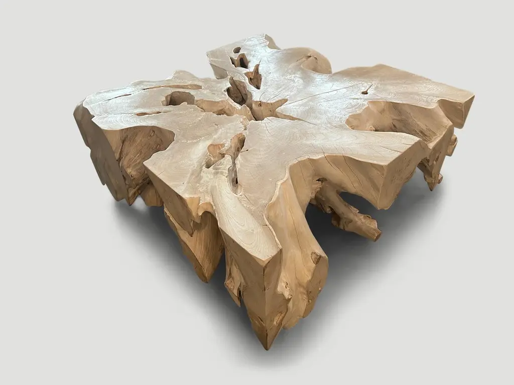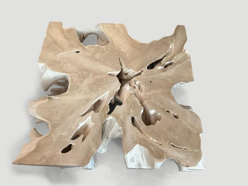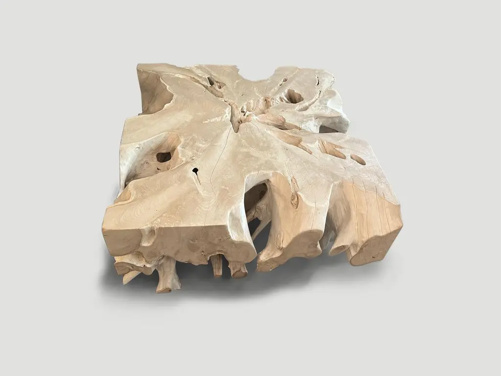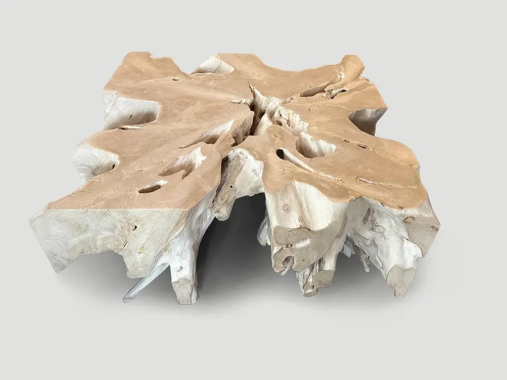 Impressive teak root coffee table. Hand carved into this beautiful shape whilst respecting the natural organic wood. We added a polish to the top and the flat sections on the side for a slight bone contrast and protection. It’s all in the details. The St. Barts Collection features an exciting line of organic white wash, bleached and natural weathered teak furniture. The reclaimed teak is bleached and left to bake in the sun and sea salt air for over a year to achieve this unique finish. Select pieces are infused with a brilliant aqua or soft blue resin that is cracked to achieve a unique quartz crystal effect. The final result evokes imagery of the white sand beaches and brilliant aqua waters of the famous French Caribbean Island.Own an Andrianna Shamaris original.Andrianna Shamaris. The Leader In Modern Organic Design.