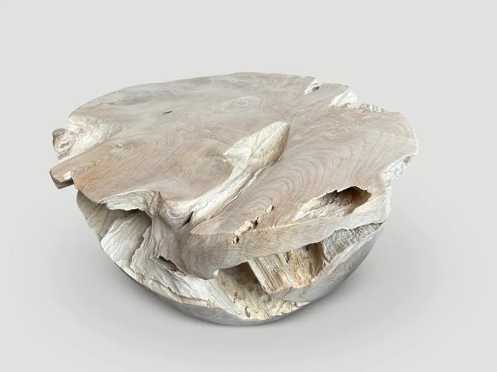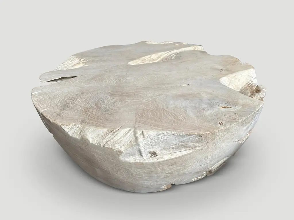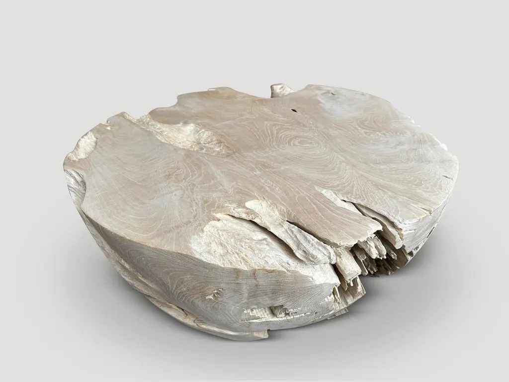 Organic reclaimed teak wood drum shaped coffee table bleached with a light white washed revealing the beautiful wood grain. We can also produce this shape charred or natural teak. Please inquire.The St. Barts Collection features an exciting line of organic bleached, white wash and natural weathered teak furniture. The reclaimed teak is bleached and left to bake in the sun and sea salt air for over a year to achieve this unique finish. Select pieces are infused with a brilliant aqua or soft blue resin that is cracked to achieve a unique quartz crystal effect. The final result evokes imagery of the white sand beaches and brilliant aqua waters from the famous French Caribbean Island.Own an Andrianna Shamaris original.Andrianna Shamaris. The Leader In Modern Organic Design.