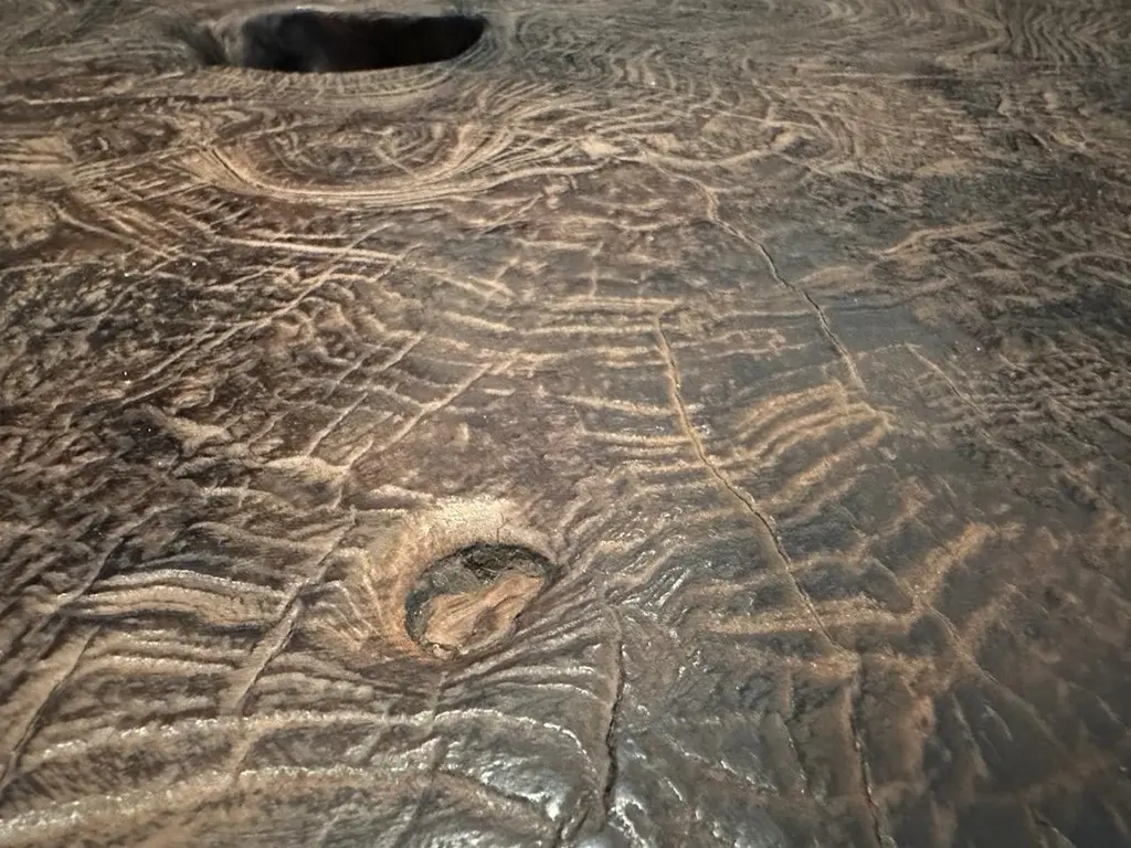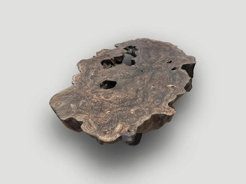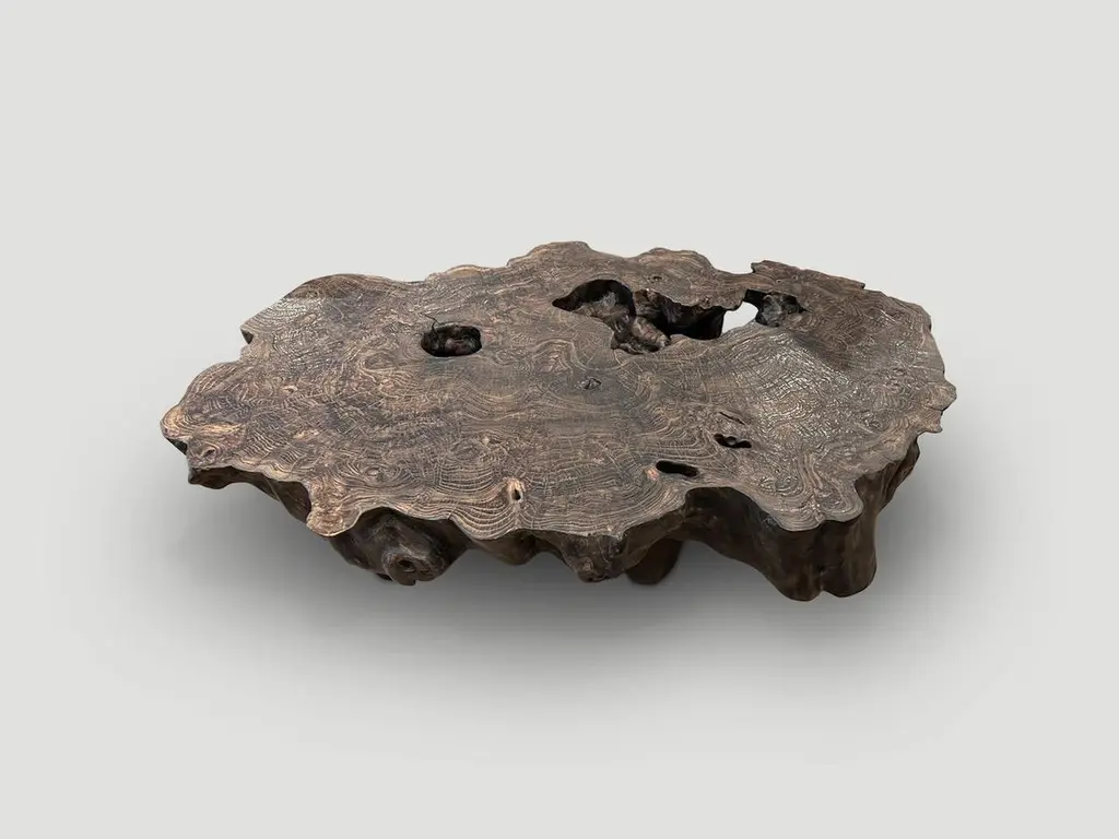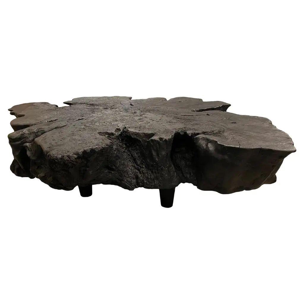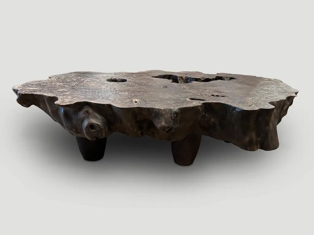 Natural organic formed reclaimed teak root coffee table. We added cone style legs and charred this impressive six inch slab lightly to a rich brown. Finally we rubbed the top with a wire brush revealing the beautiful wood grain. It’s all in the details.The Triple Burnt Collection represents a unique line of modern furniture made from solid organic wood. Burnt three times to produce a rich, charcoal finish with impressive depth-a result unachievable using standard stains and finishes. A perfect combination of modern and organic. This side table was burnt one time therefore not as dark as the Triple Burnt. This one is single burnt to a beautiful rich brownOwn an Andrianna Shamaris originalAndrianna Shamaris. The leader in modern organic design.