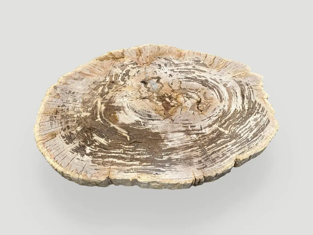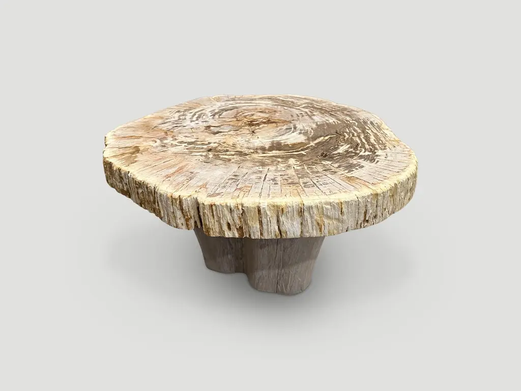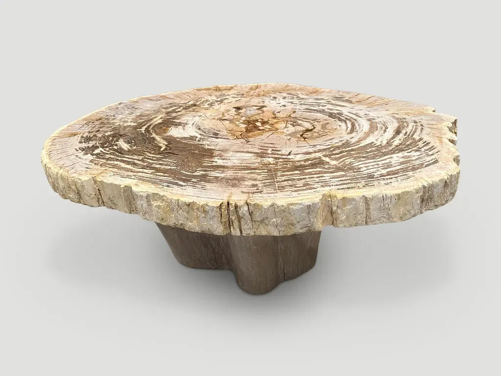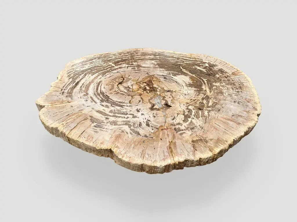 Impressive two inch thick, high quality petrified wood slab coffee table, resting on an organic white washed base. It’s fascinating how Mother Nature produces these stunning 40 million year old petrified teak logs with such contrasting colors and natural patterns throughout. Modern yet with so much history.As with a diamond, we polish the highest quality fossilized petrified wood, using our latest ground breaking technology to reveal its natural beauty and contrasting tones. It is then transformed into a unique piece of furniture, unlike any other petrified wood you might find.We source the highest quality petrified wood available. Each piece is hand selected and highly polished. Petrified wood is extremely versatile. Perfect as a cocktail table, side table or clustered as a coffee table. We can also custom large slabs for counter tops, dining tables or coffee tables.We have an ever-evolving collection of High Quality Petrified Wood. We only select the best.Own an Andrianna Shamaris originalAndrianna Shamaris. The Leader In Modern Organic Design.