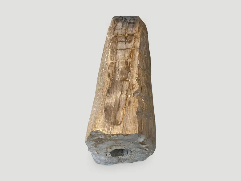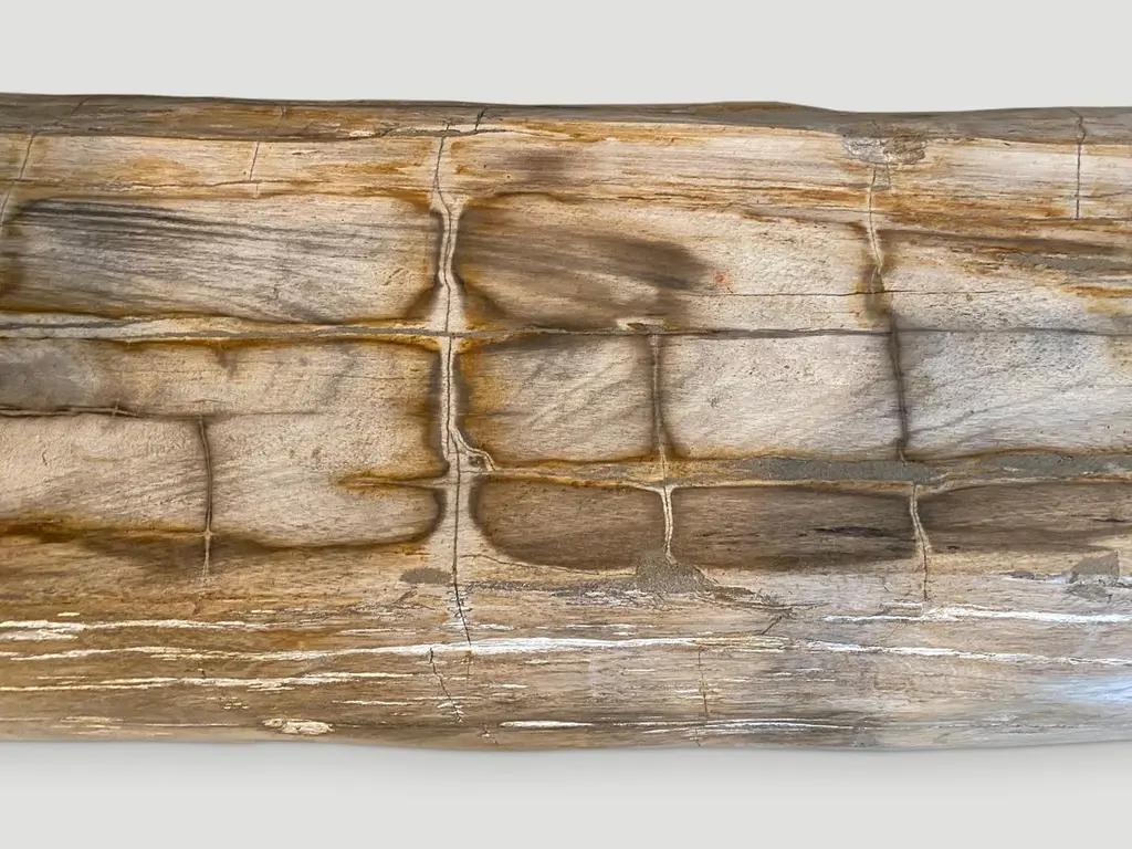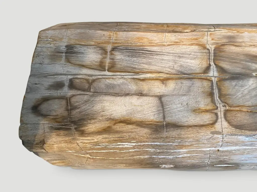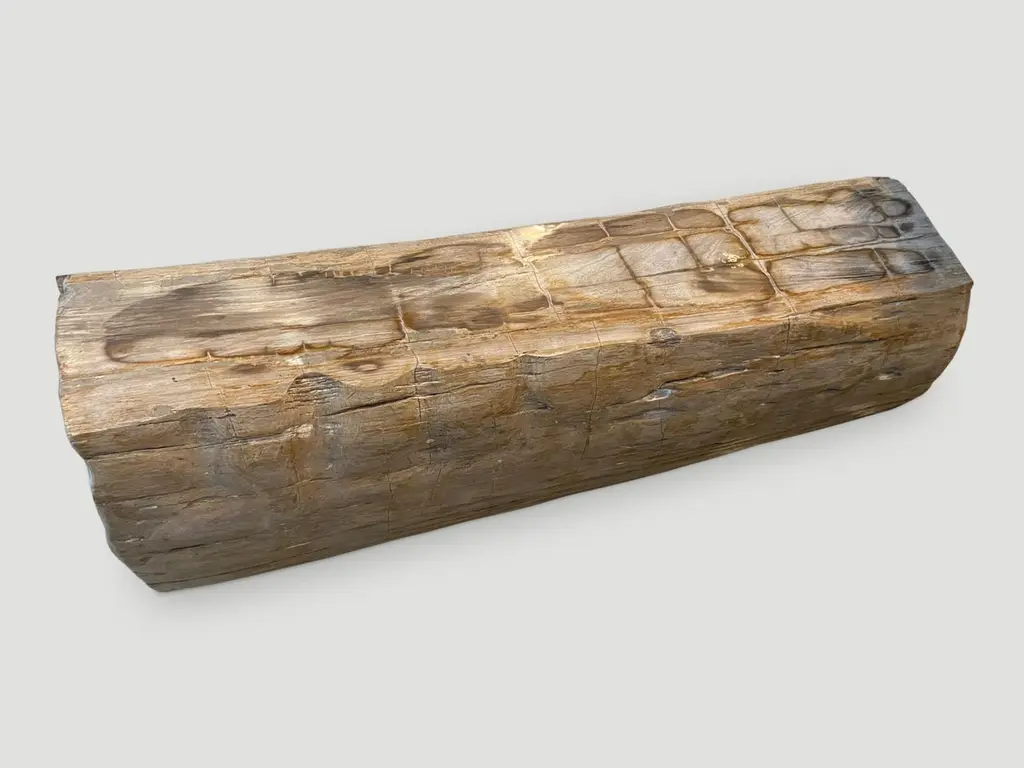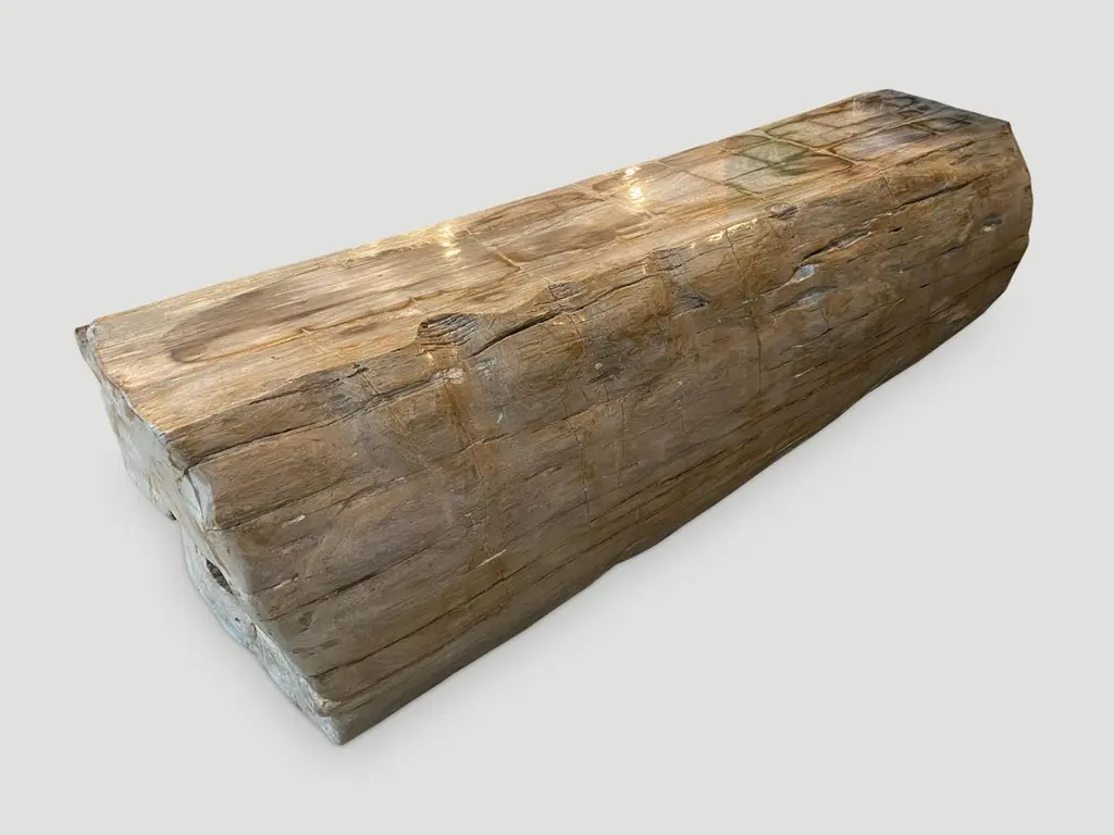 Impressive, high quality petrified wood log bench. It’s fascinating how Mother Nature produces these exquisite 40 million year old petrified teak logs with such beautiful colors and natural patterns throughout. Modern yet with so much history. Stunning neutral tones make this an impressive piece for any space. Fantastic in a lobby, hotel project or residence.As with a diamond, we polish the highest quality fossilized petrified wood, using our latest ground breaking technology, to reveal its natural beauty and contrasting tones. It is then transformed into a unique piece of furniture, unlike any other petrified wood you might find.We source the highest quality petrified wood available. Over 40 million years old. Each piece is hand selected and highly polished. Petrified wood is extremely versatile – even great inside a bathroom shower. Perfect as a cocktail table, side table or clustered as a coffee table. We can also custom large slabs for counter tops, dining tables or coffee tables.We have an ever-evolving collection of High Quality Petrified Wood. We only select the best.Own an Andrianna Shamaris original.Andrianna Shamaris. The Leader In Modern Organic Design.