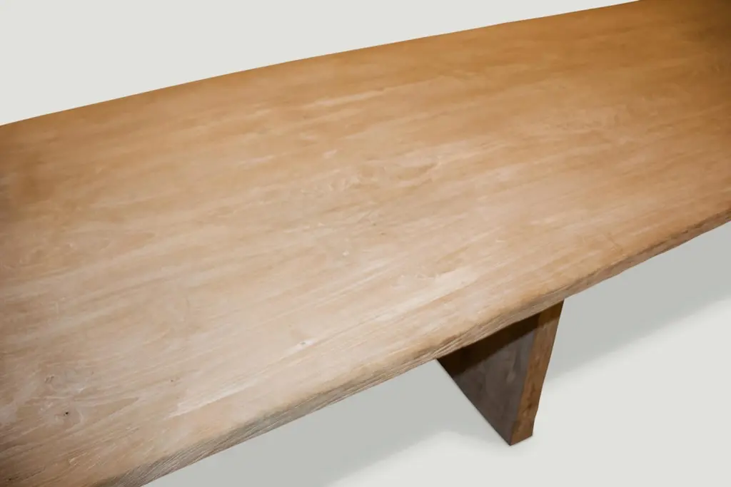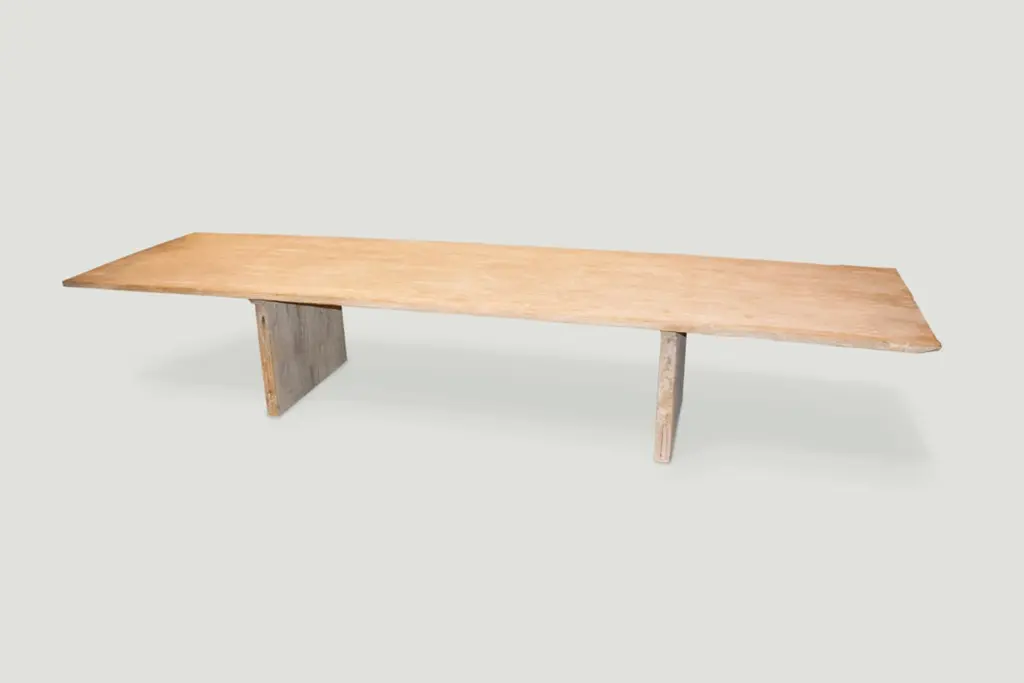Reclaimed teak dining table comprising of four 1.5″ slabs joined. We added a light white wash finish allowing the grain of the teak wood to show. Floating on a 3” thick base. Custom stains available.The St. Barts Collection features an exciting new line of organic white wash, bleached and natural weathered teak furniture. The reclaimed teak is bleached and left to bake in the sun and sea salt air for over a year to achieve this unique finish. Select pieces are infused with a brilliant aqua or soft blue resin that is cracked to achieve a unique quartz crystal effect. The final result evokes imagery of the white sand beaches and brilliant aqua waters of the famous French Caribbean Island.Own an Andrianna Shamaris original.Andrianna Shamaris. The Leader In Modern Organic Design.