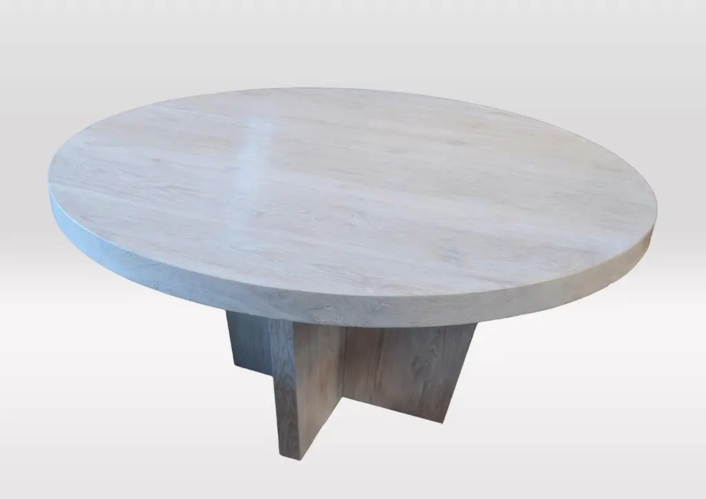 Impressive reclaimed teak dining table or entrance table with a light white wash finish. Shown on a modern cross base.The St. Barts Collection features an exciting line of organic white wash, bleached and natural weathered teak furniture. The reclaimed teak is bleached and left to bake in the sun and sea salt air for over a year to achieve this unique finish. Select pieces are infused with a brilliant aqua resin that is cracked to achieve a unique quartz crystal effect. The final result evokes imagery of the white sand beaches and brilliant aqua waters of the famous French Caribbean Island.Own an Andrianna Shamaris original.Andrianna Shamaris. The Leader In Modern Organic Design™.
