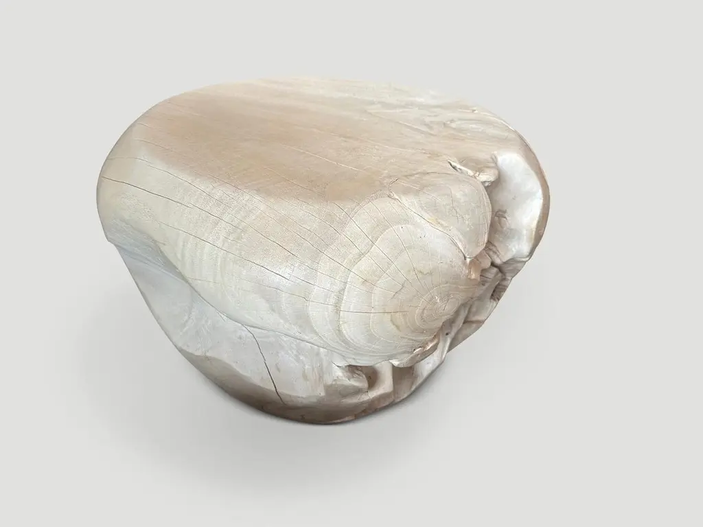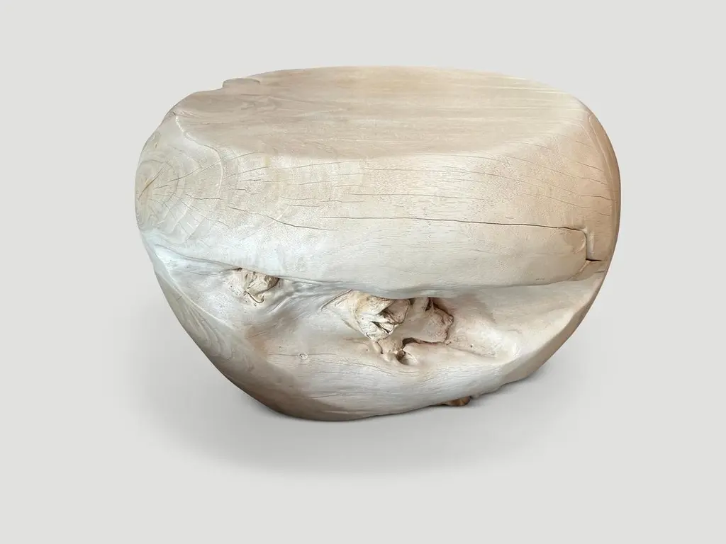 Beautiful reclaimed teak wood, hand carved into a one of a kind drum shape coffee table or oversized side table, whilst respecting the natural organic wood. Bleached to a bone finish. Both usable and sculptural. Full dimensions; Top 18” diameter x center 24″ diameter x 16″ high.The St. Barts Collection features an exciting new line of organic white wash, bleached and natural weathered teak furniture. The reclaimed teak is bleached and left to bake in the sun and sea salt air for over a year to achieve this unique finish. Select pieces are infused with a brilliant aqua or soft blue resin that is cracked to achieve a unique quartz crystal effect. The final result evokes imagery of the white sand beaches and brilliant aqua waters of the famous French Caribbean Island.Own an Andrianna Shamaris original.Andrianna Shamaris. The Leader in Modern Organic Design.