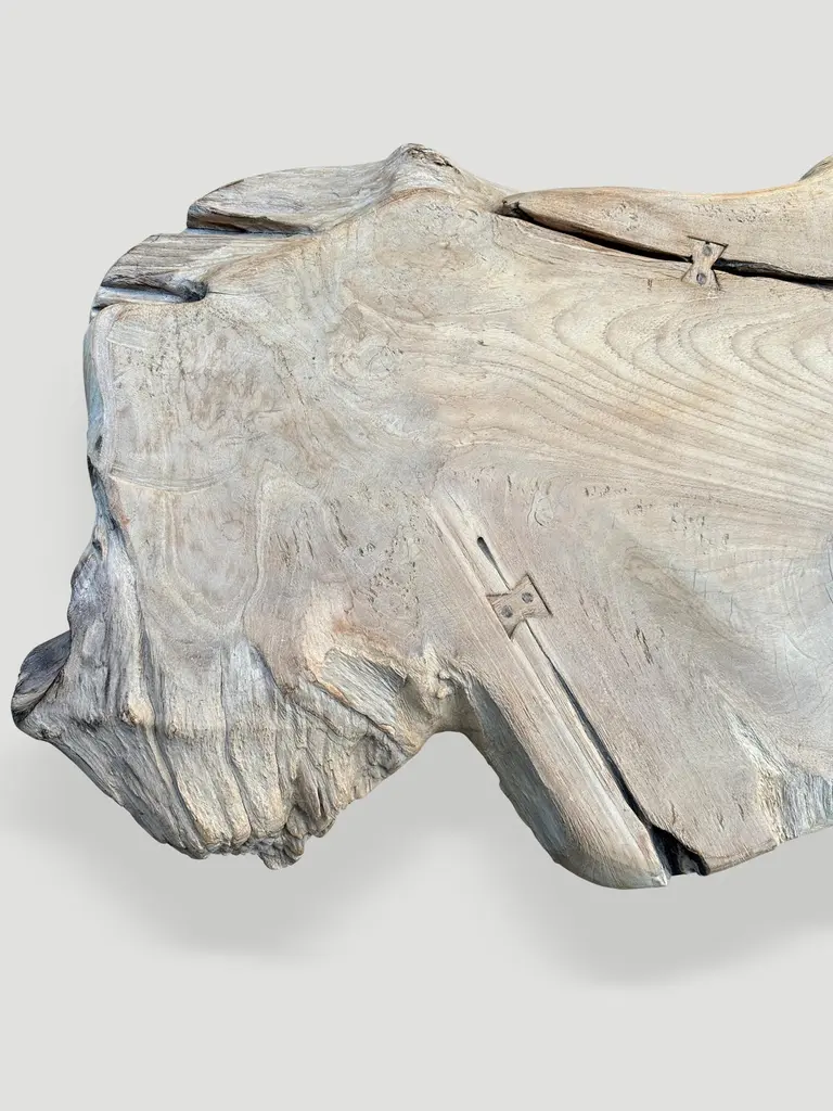 An impressive three inch thick single slab coffee table with butterflies inlaid into the top. Hand made from beautiful reclaimed teak wood, this stunning piece floats on mid-century style legs. Finished with a light white wash revealing the stunning wood grain. It’s all in the details. The sculptural live edge varies from 18” to 28” wide.The St. Barts Collection features an exciting line of organic white wash, bleached and natural weathered teak furniture. The reclaimed teak is bleached and left to bake in the sun and sea salt air for over a year to achieve this unique finish. Select pieces are infused with a brilliant aqua resin that is cracked to achieve a unique quartz crystal effect. The final result evokes imagery of the white sand beaches and brilliant aqua waters of the famous French Caribbean Island.Own an Andrianna Shamaris original.Andrianna Shamaris. The Leader In Modern Organic Design.