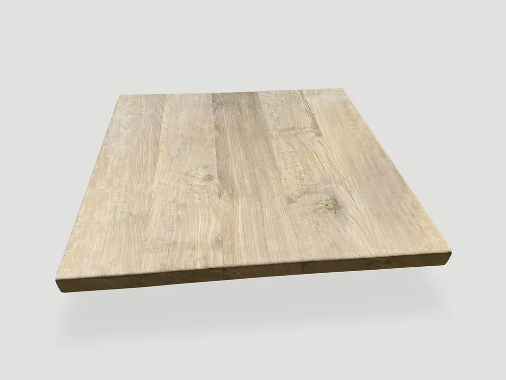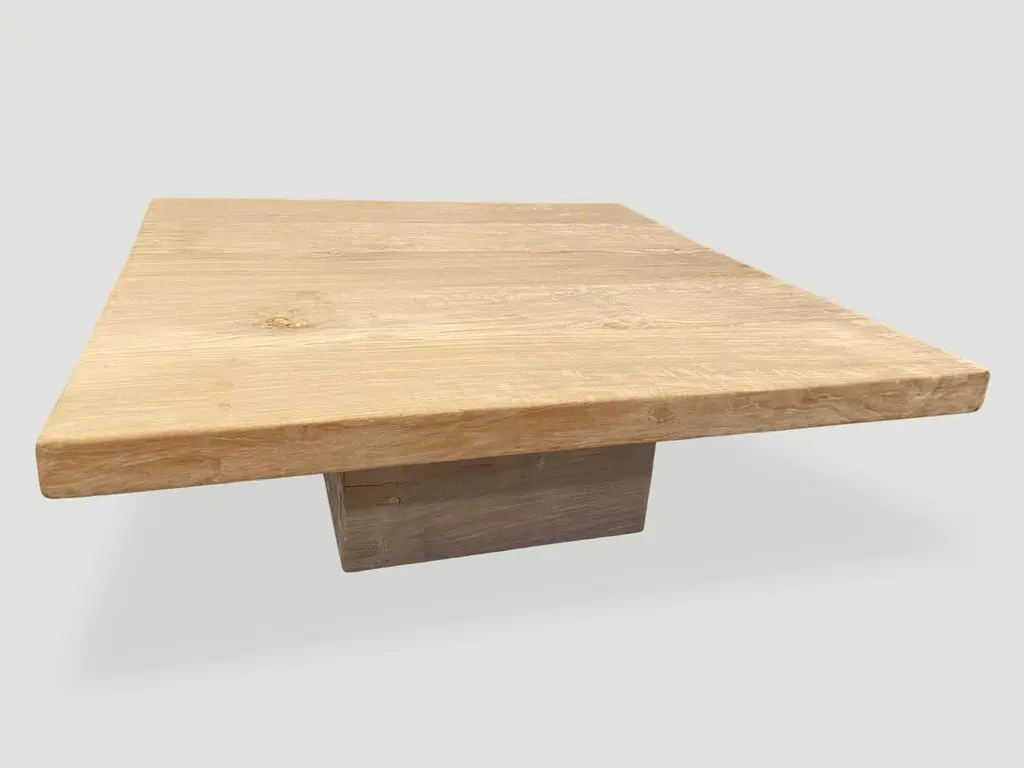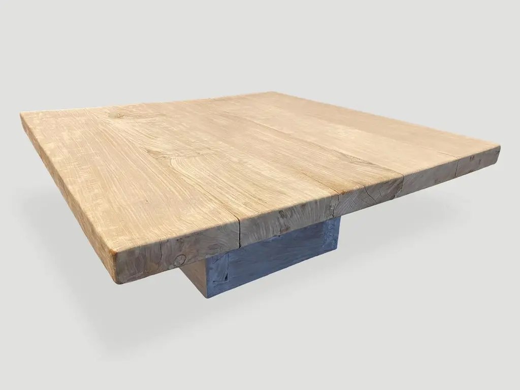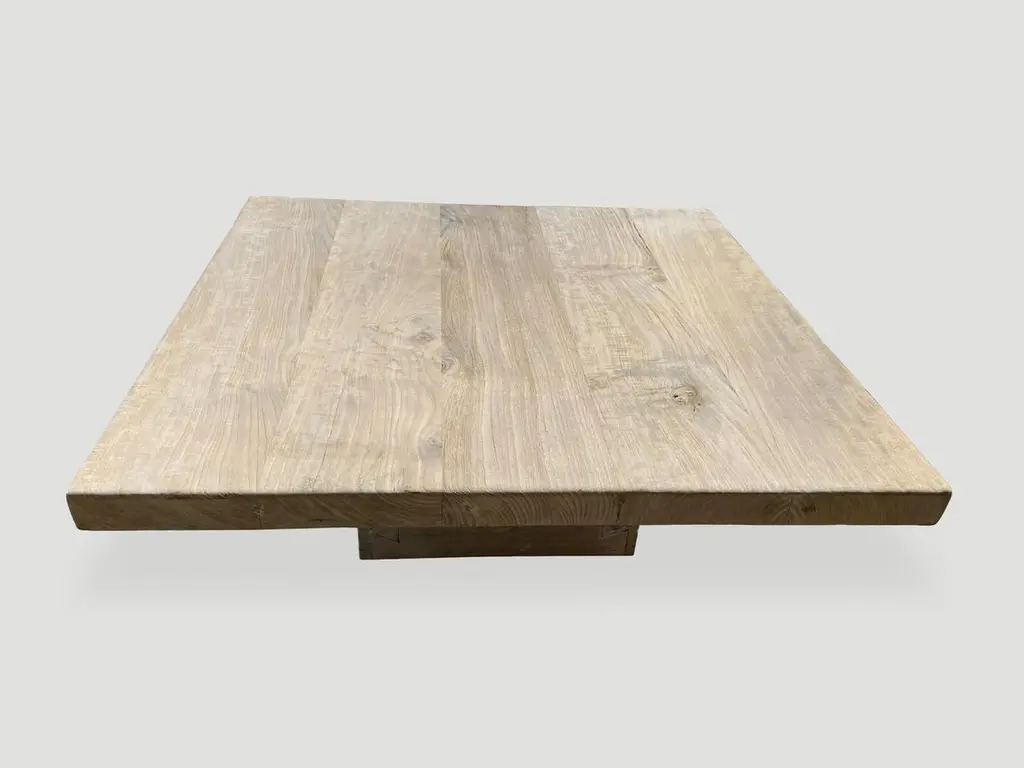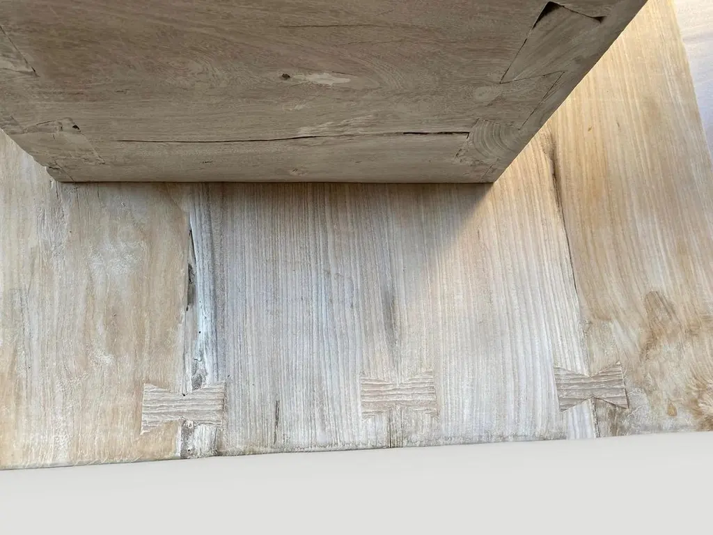 Beautiful bleached reclaimed teak wood coffee table with a fine white wash finish. We added butterfly inlays into the wood to join the 2.5” thick teak slabs for this impressive coffee table.The St. Barts Collection features an exciting new line of organic white wash, bleached and natural weathered teak furniture. The reclaimed teak is bleached and left to bake in the sun and sea salt air for over a year to achieve this unique finish. Select pieces are infused with a brilliant aqua resin that is cracked to achieve a unique quartz crystal effect. The final result evokes imagery of the white sand beaches and brilliant aqua waters of the famous French Caribbean Island.Own an Andrianna Shamaris original.Andrianna Shamaris. The Leader In Modern Organic Design.