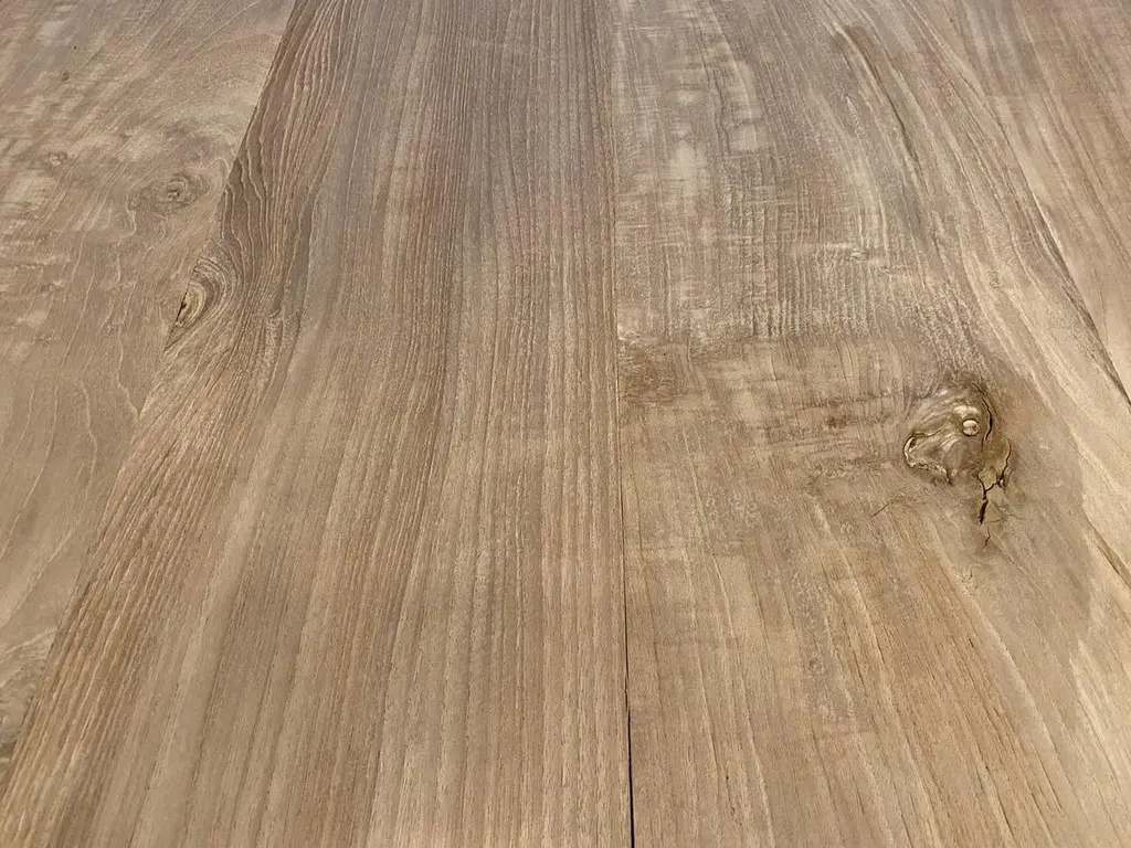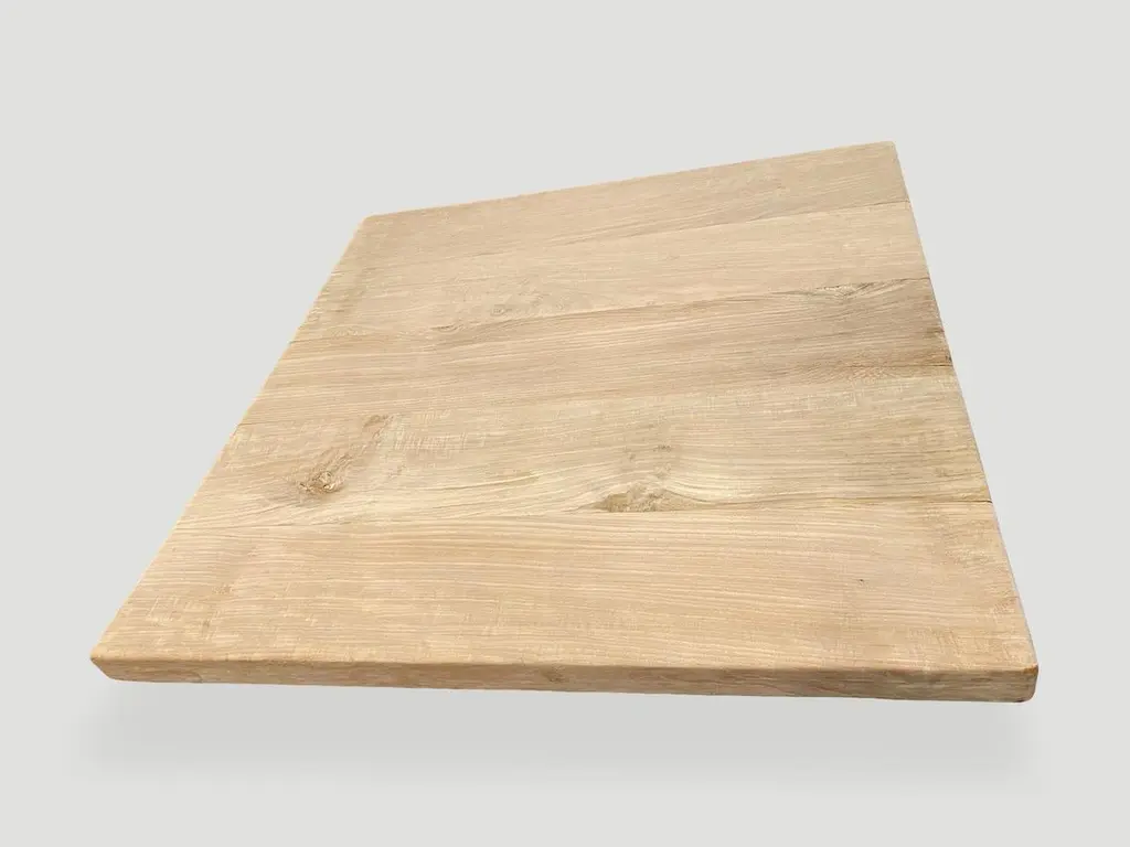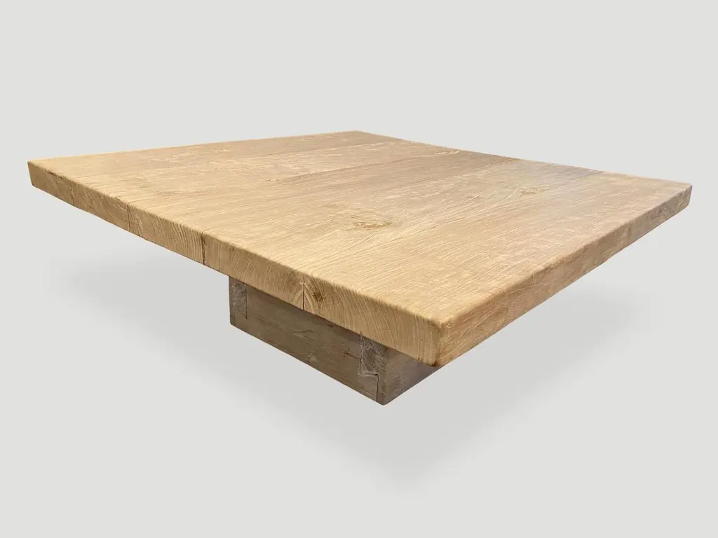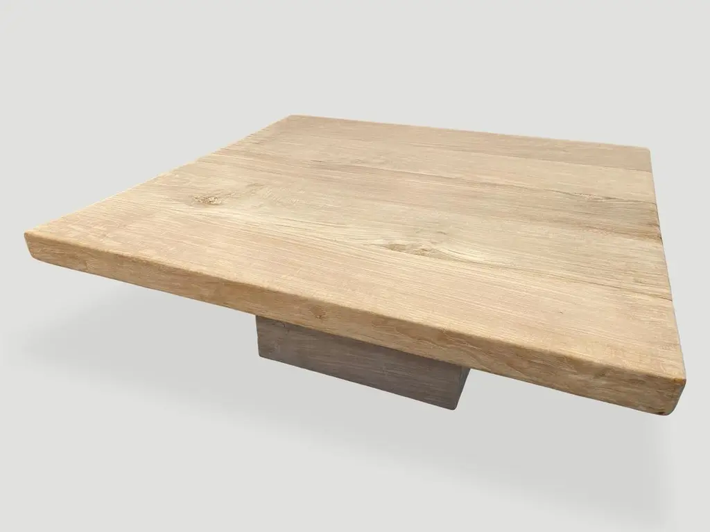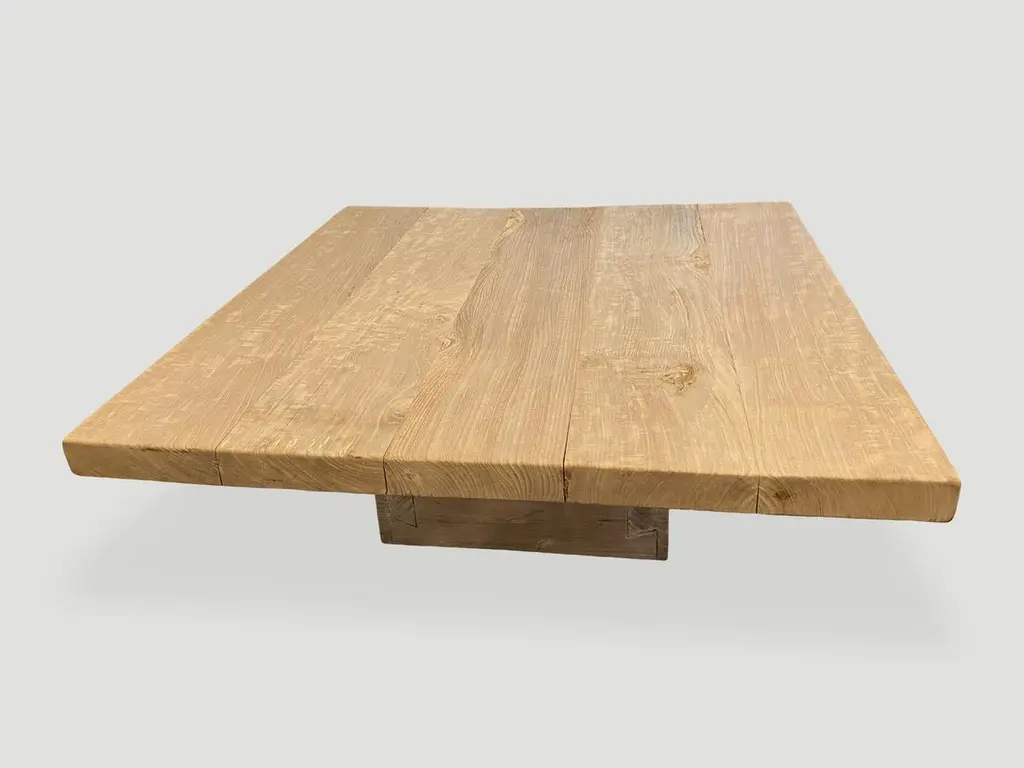 Beautiful bleached reclaimed teak wood coffee table with a fine white wash finish. We added butterfly inlays into the wood to join the 2.5” thick teak slabs for this impressive coffee table.The St. Barts Collection features an exciting new line of organic white wash, bleached and natural weathered teak furniture. The reclaimed teak is bleached and left to bake in the sun and sea salt air for over a year to achieve this unique finish. Select pieces are infused with a brilliant aqua resin that is cracked to achieve a unique quartz crystal effect. The final result evokes imagery of the white sand beaches and brilliant aqua waters of the famous French Caribbean Island.Own an Andrianna Shamaris original.Andrianna Shamaris. The Leader In Modern Organic Design.