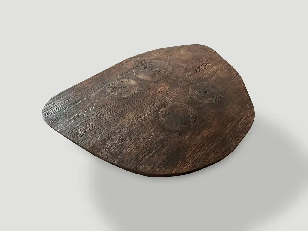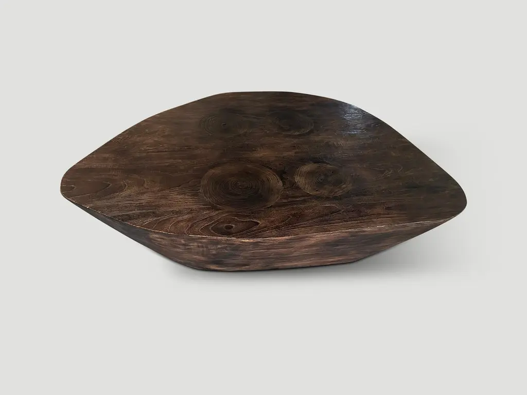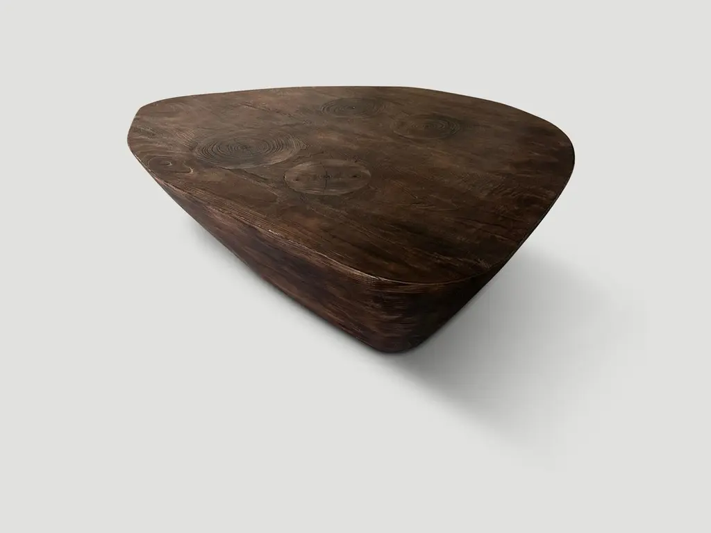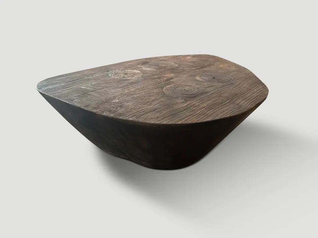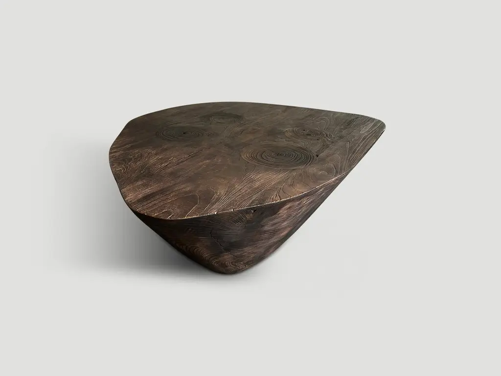 Beautiful reclaimed teak wood minimalist coffee table. Charred one time revealing the unique wood grain. Hand carved with a dramatic graduation from the bottom to the top. Both sculptural and usable. It’s all in the details. The Triple Burnt Collection represents a unique line of modern furniture made from solid organic wood. Burnt three times to produce a rich, charcoal finish with impressive depth-a result unachievable using standard stains and finishes. A perfect combination of modern and organic. This coffee table is single burnt to a beautiful rich brown.Own an Andrianna Shamaris originalAndrianna Shamaris. The Leader In Modern Organic Design.