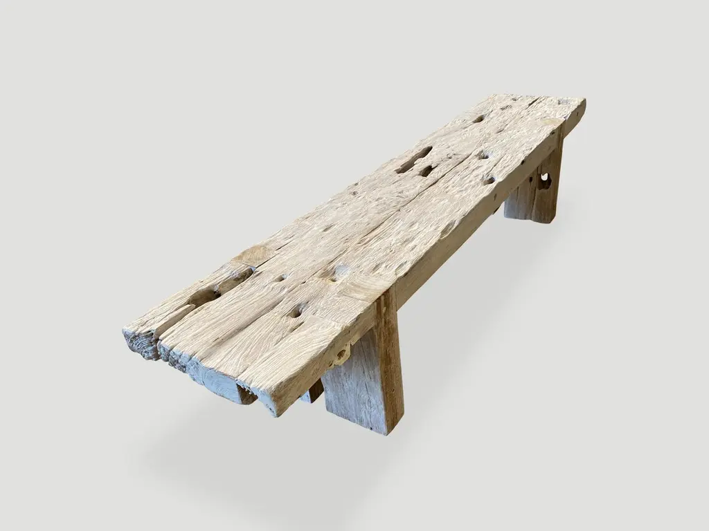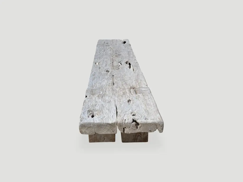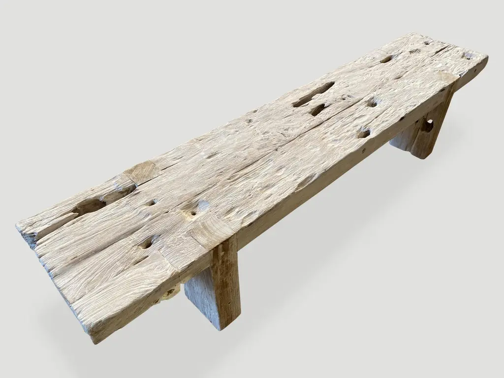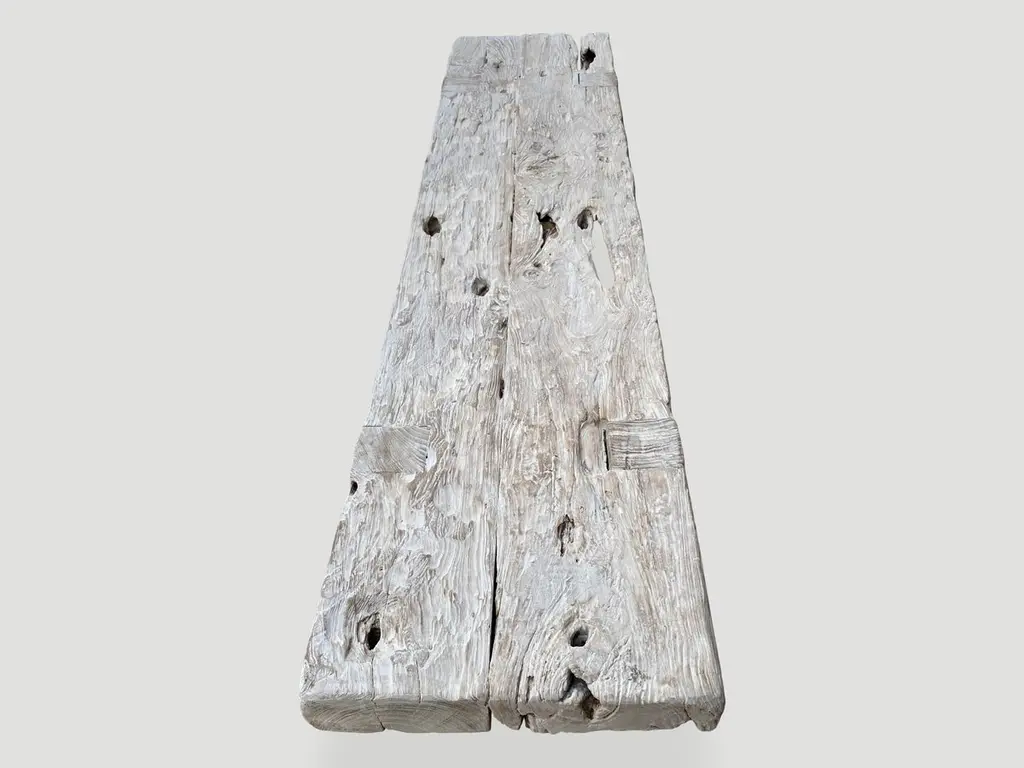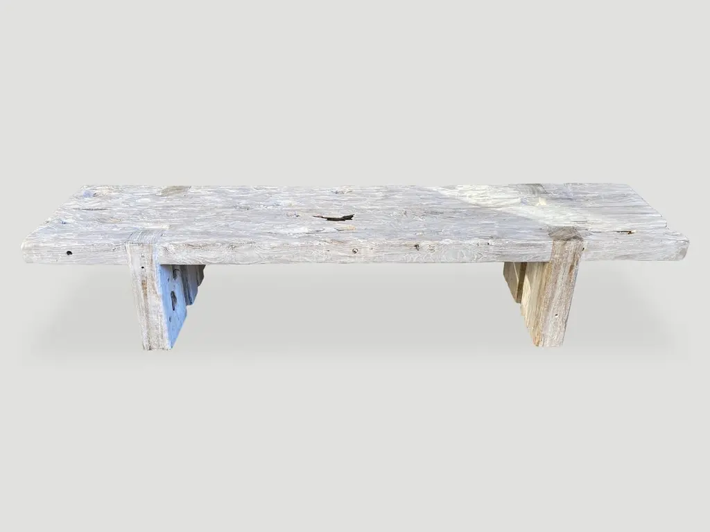 Beautiful reclaimed teak wood bench made from two 3” thick panels. We added the legs which are inlayed into the top, bleached the wood and then finished with a light white wash exposing the beautiful grain of this aged teak wood. The St. Barts Collection features an exciting new line of organic bleached, white wash and natural weathered teak furniture. The reclaimed teak is first bleached and then left to bake in the sun and sea salt air for over a year to achieve this unique finish. Select pieces are infused with a brilliant aqua or soft blue resin that is cracked to achieve a unique quartz crystal effect. The final result evokes imagery of the white sand beaches and brilliant aqua waters of the famous French Caribbean Island.Own an Andrianna Shamaris original.Andrianna Shamaris. The Leader In Modern Organic Design.