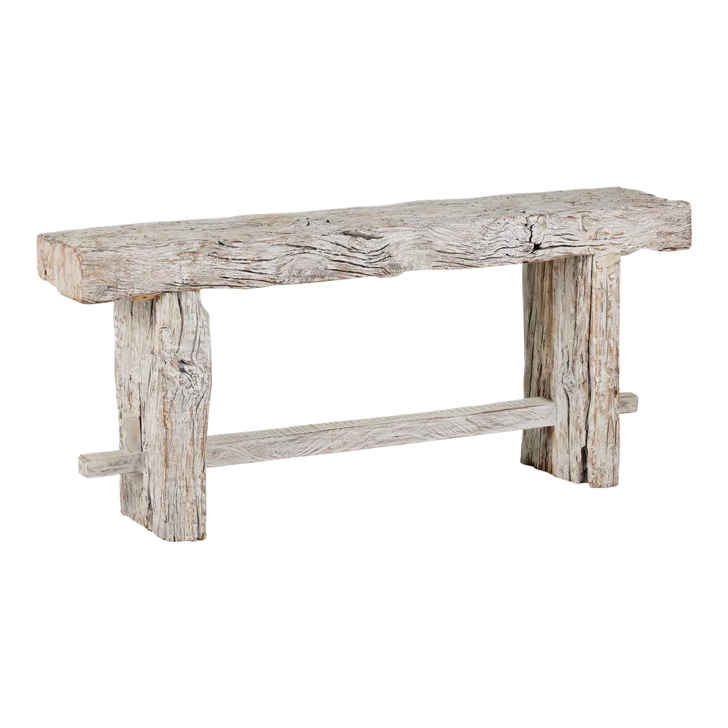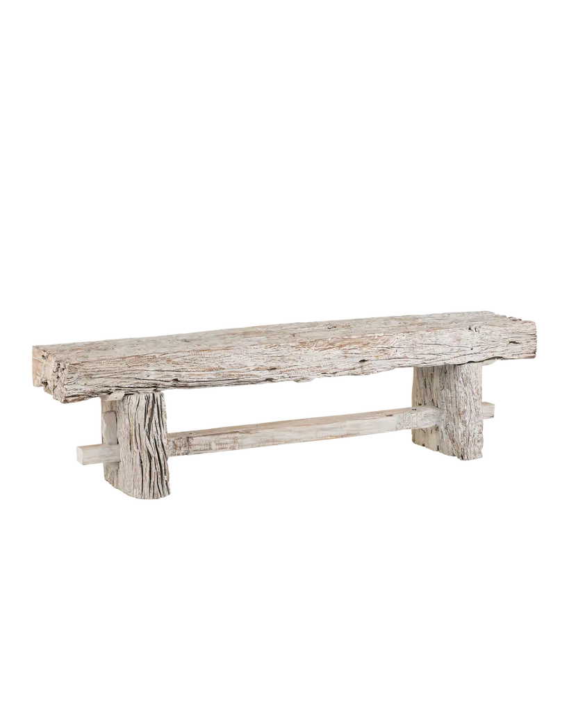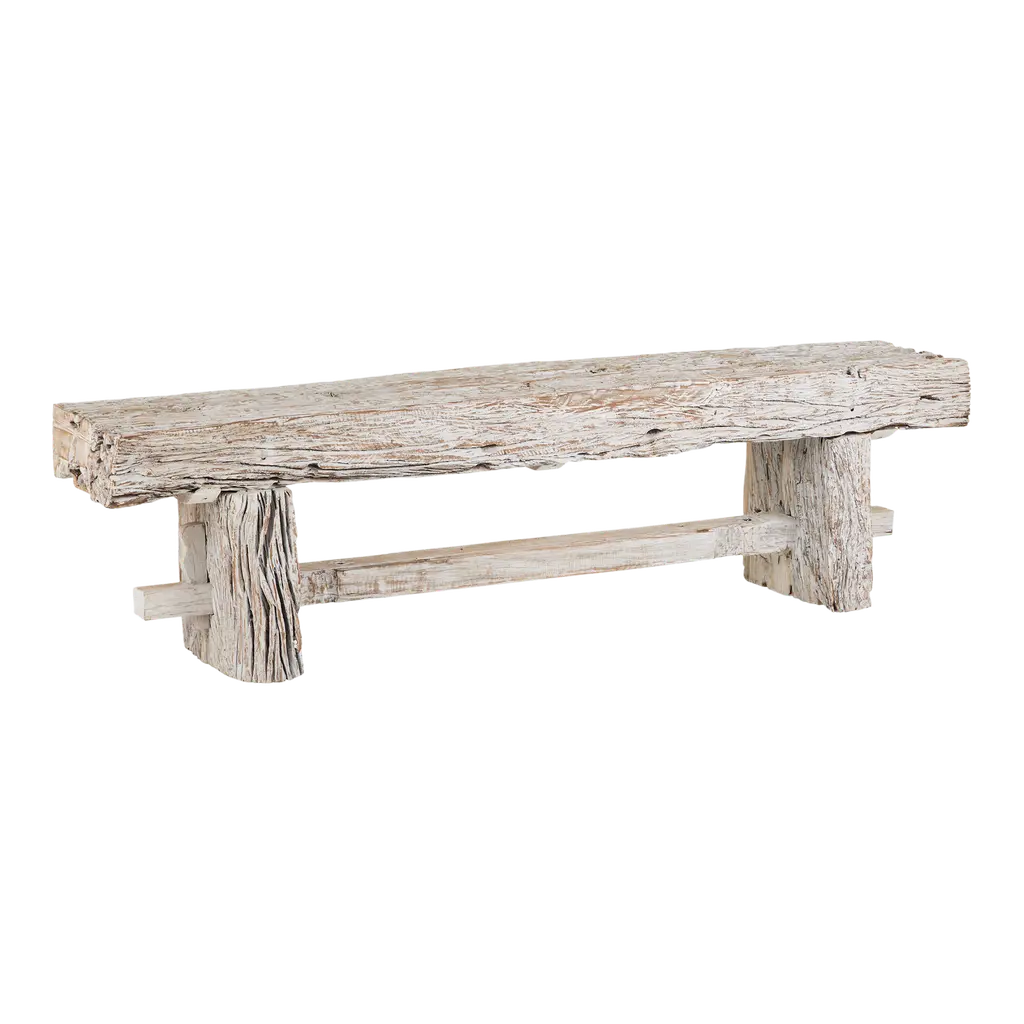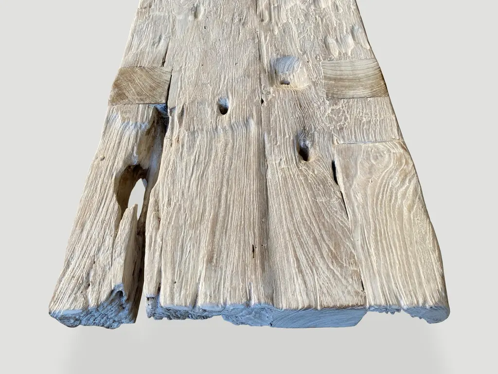 Beautiful reclaimed teak wood bench made from two 3” thick panels. We added the legs which are inlayed into the top, bleached the wood and then finished with a light white wash exposing the beautiful grain of this aged teak wood. The St. Barts Collection features an exciting new line of organic bleached, white wash and natural weathered teak furniture. The reclaimed teak is first bleached and then left to bake in the sun and sea salt air for over a year to achieve this unique finish. Select pieces are infused with a brilliant aqua or soft blue resin that is cracked to achieve a unique quartz crystal effect. The final result evokes imagery of the white sand beaches and brilliant aqua waters of the famous French Caribbean Island.Own an Andrianna Shamaris original.Andrianna Shamaris. The Leader In Modern Organic Design.