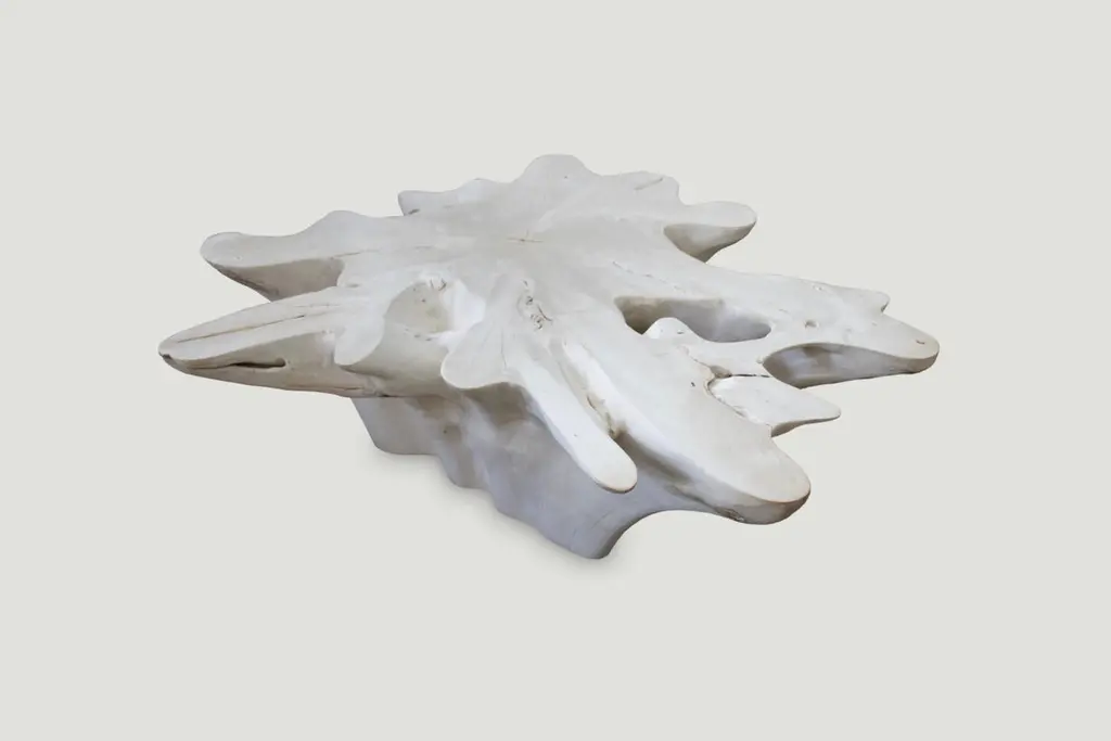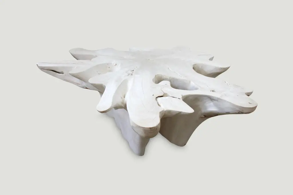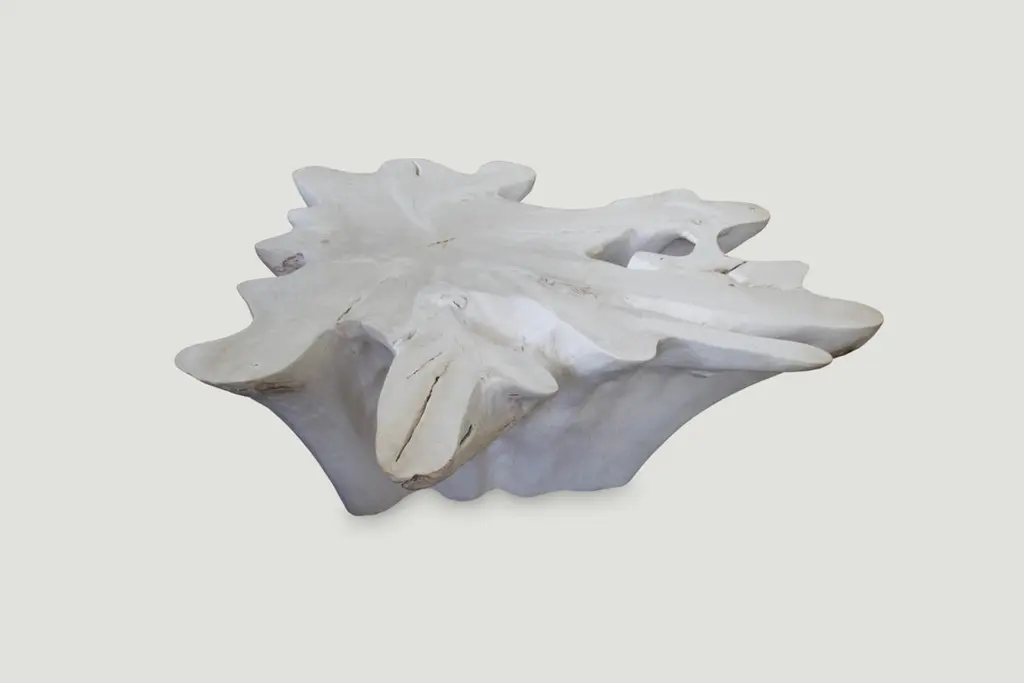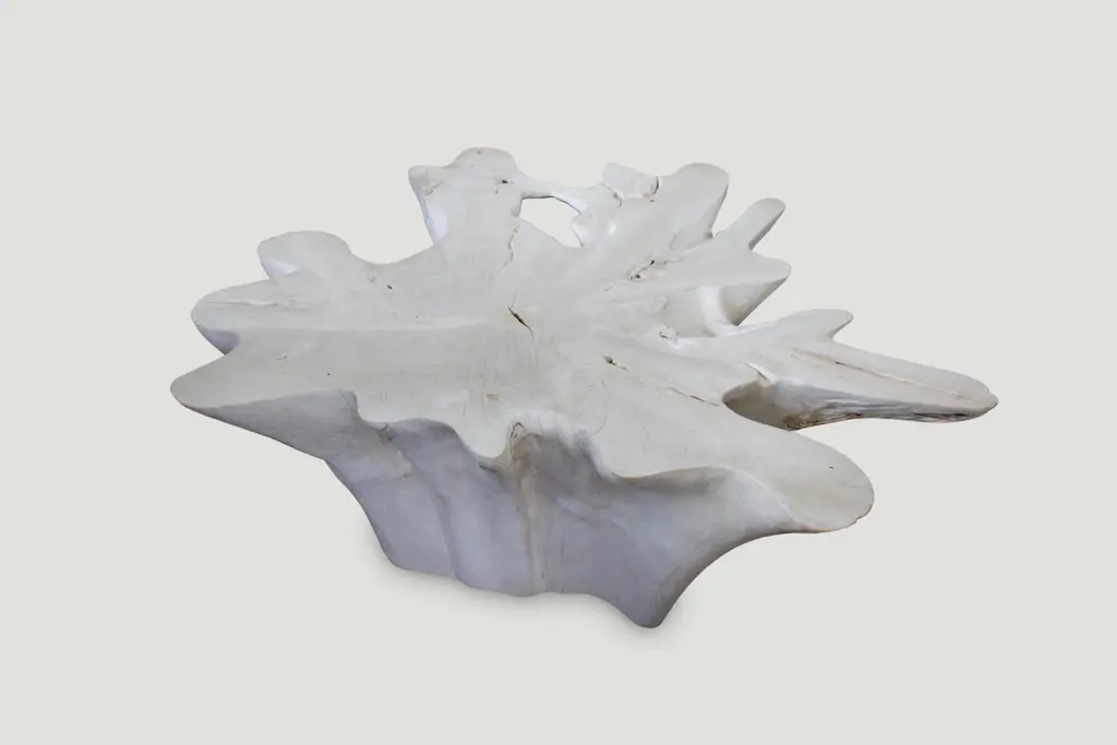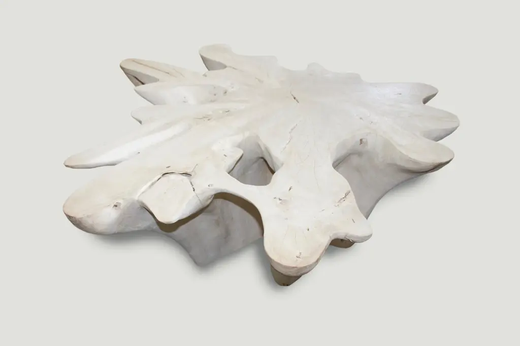 Impressive reclaimed bleached teak wood amorphous coffee table. A slight graduation from the bottom to the top. The St. Barts collection features an exciting new line of organic white wash and natural weathered teak furniture. The reclaimed teak is bleached and left to bake in the sun and sea salt air for over a year to achieve this unique finish. Select pieces are infused with a brilliant aqua or soft blue resin that is cracked to achieve a unique quartz crystal effect. The final result evokes imagery of the white sand beaches and brilliant aqua waters of the famous French Caribbean Island.Andrianna Shamaris. The Leader In Modern Organic Design.