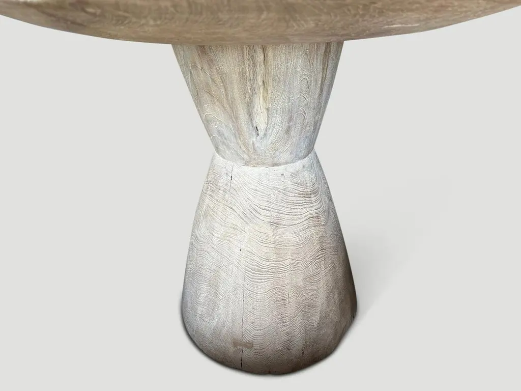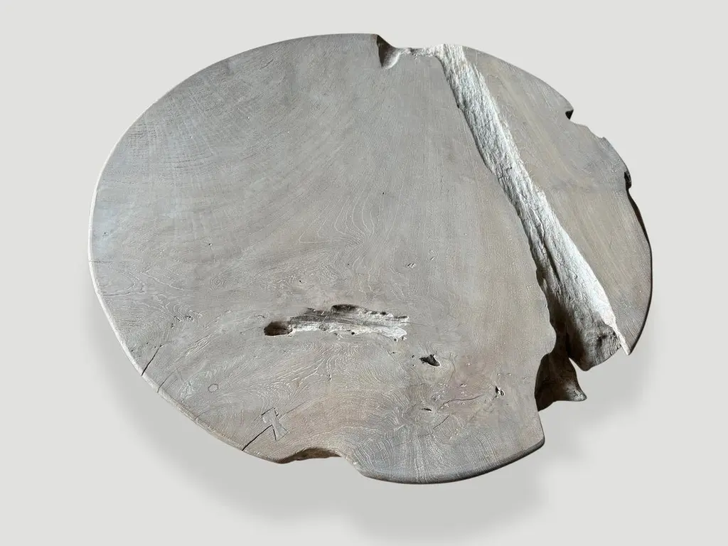A single aged organic slab of reclaimed teak wood taken from my finest collection, is turned into a one of a kind table. The top is originally five inches thick which we have carved by hand to a dramatic bevel with soft smooth rounded sides. Butterfly inlays are added to the top and to the beautiful antique cylinder base. Finished with our secret white wash revealing the stunning wood grain. It’s all in the details. The St. Barts Collection features an exciting new line of organic white wash, bleached and natural weathered teak furniture. The reclaimed teak is bleached and left to bake in the sun and sea salt air for over a year to achieve this unique finish. Select pieces are infused with a brilliant aqua or soft blue resin that is cracked to achieve a unique quartz crystal effect. The final result evokes imagery of the white sand beaches and brilliant aqua waters of the famous French Caribbean Island.Own an Andrianna Shamaris original.Andrianna Shamaris. The Leader In Modern Organic Design.