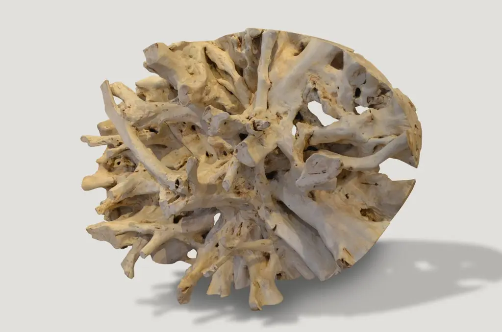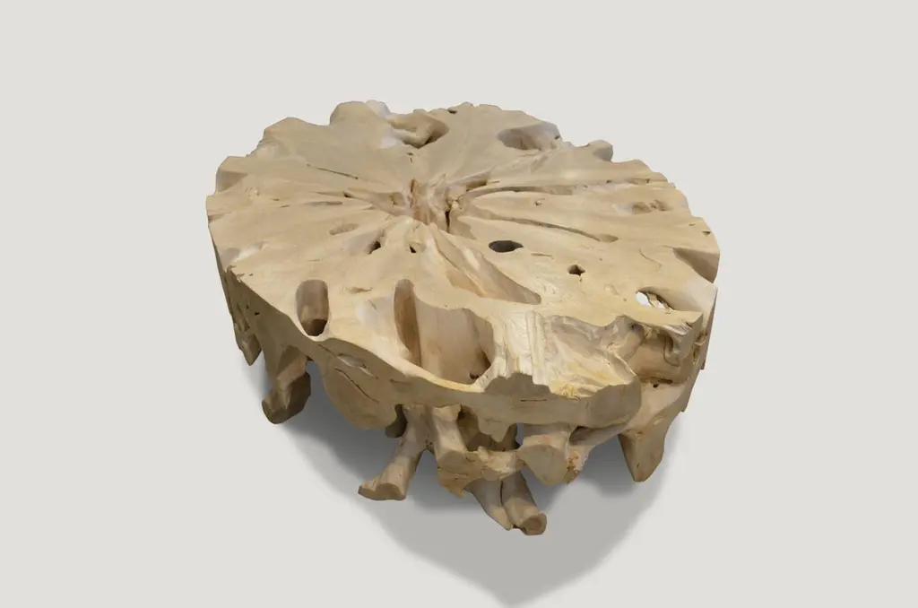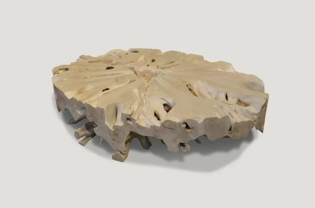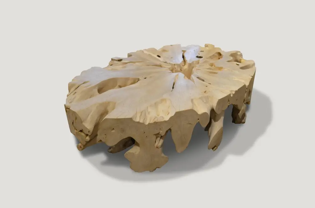 Impressive, single root teak wood coffee table. The reclaimed teak wood is bleached and left to bake in the sun and sea salt air for over a year to achieve this unique finish. We have added a light shellac to the top and flat side sections for a contrast and for added protection. Custom sizes and shapes available. The St. Barts Collection features an exciting line of organic white wash and natural weathered teak furniture. The reclaimed teak is left to bake in the sun and sea salt air for over a year to achieve this unique finish. Select pieces are infused with a brilliant aqua or soft blue resin that is cracked to achieve a unique quartz crystal effect. The final result evokes imagery of the white sand beaches and brilliant aqua waters of the famous French Caribbean Island.Own an Andrianna Shamaris original.Andrianna Shamaris. The Leader In Modern Organic Design™