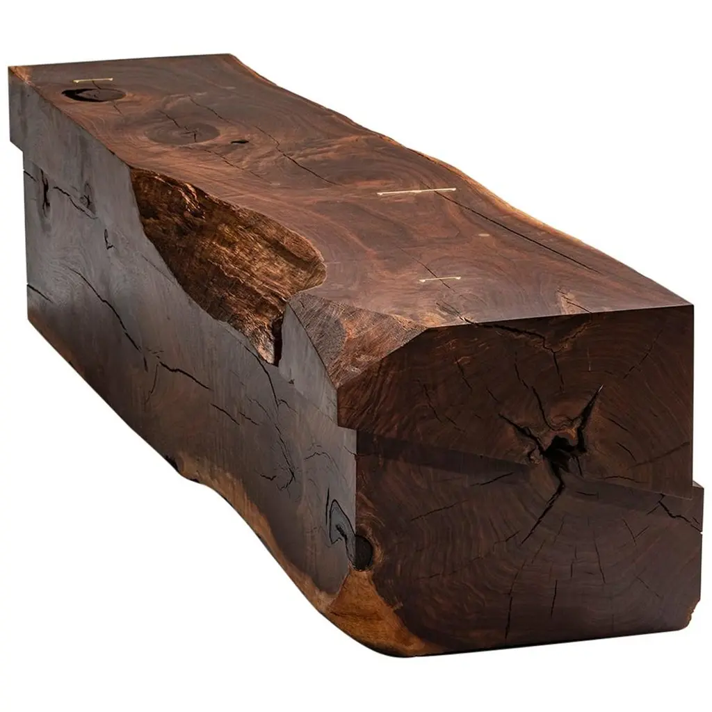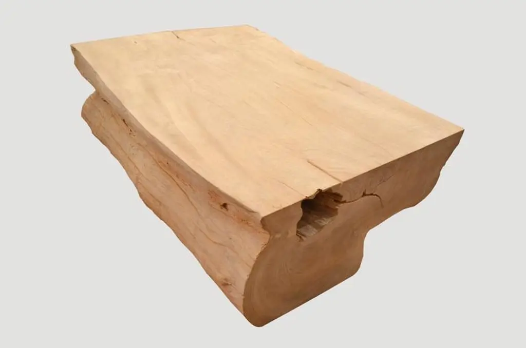 Impressive single slab coffee table made from a hundred year old reclaimed teak root. We have added a light shellack on the top section. Organic is the new modern. Custom sizes available.The St. Barts collection features an exciting line of organic white wash and natural weathered teak furniture. The reclaimed teak is left to bake in the sun and sea salt air for over a year to achieve this unique finish. Select pieces are infused with a brilliant aqua resin that is cracked to achieve a unique quartz crystal effect. The final result evokes imagery of the white sand beaches and brilliant aqua waters of the famous French Caribbean Island.Own an Andrianna Shamaris original.Andrianna Shamaris. The Leader In Modern Organic Design™