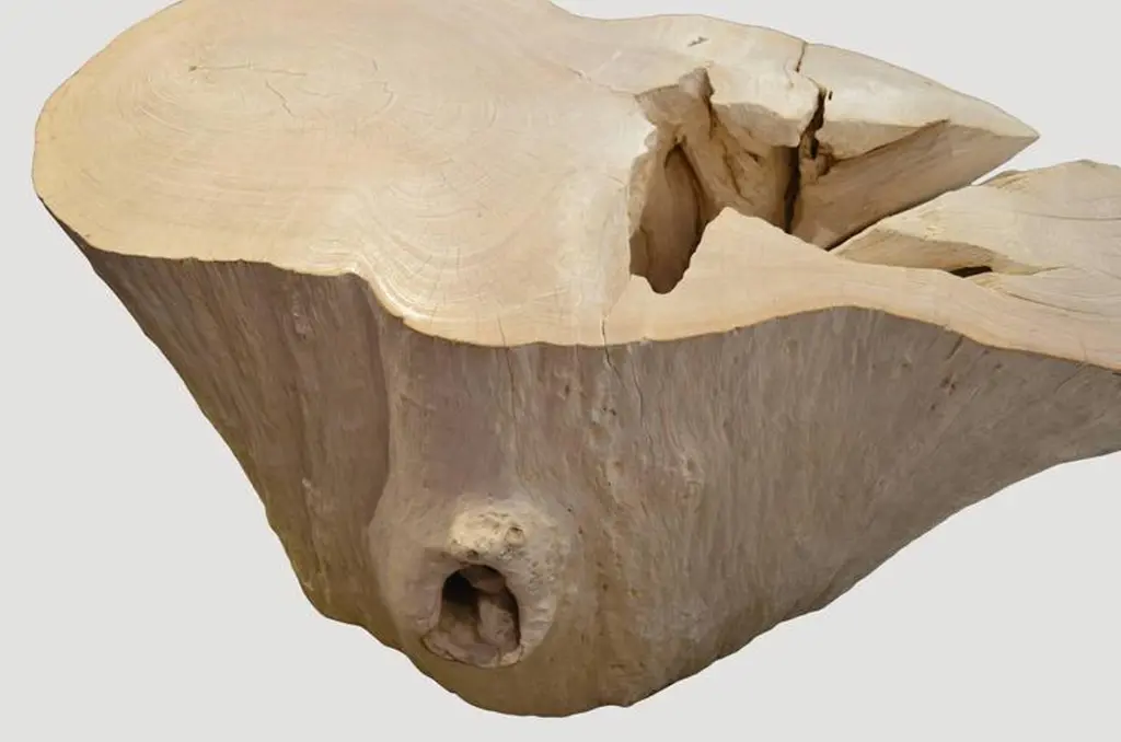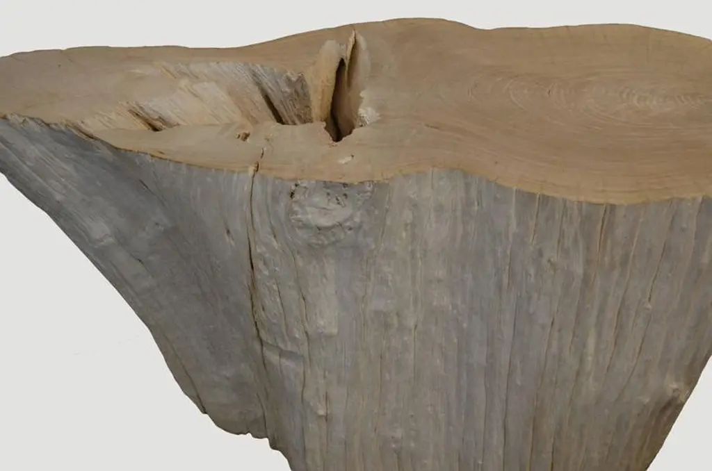 Impressive erosion teak console or table base carved from a single reclaimed root. Fabulous shape. Lucite or glass can be added if desired. A light shellack has been added to the top.The St. Barts Collection features an exciting new line of organic white wash, bleached and natural weathered teak furniture. The reclaimed teak is bleached and left to bake in the sun and sea salt air for over a year to achieve this unique finish. Select pieces are infused with a brilliant aqua resin that is cracked to achieve a unique quartz crystal effect. The final result evokes imagery of the white sand beaches and brilliant aqua waters of the famous French Caribbean Island.Own an Andrianna Shamaris original.Andrianna Shamaris. The Leader In Modern Organic Design™