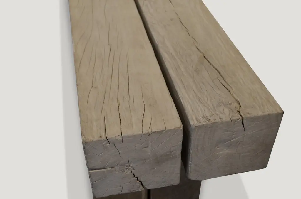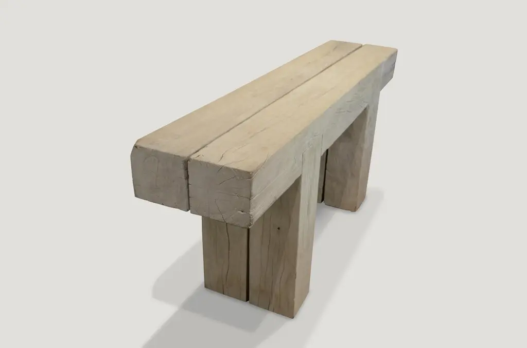 Reclaimed bleached teak log console with an added light white wash finish. The two top pieces rest on a minimalist teak base. Custom finishes available.The St. Barts Collection features an exciting new line of organic white wash, bleached and natural weathered teak furniture. The reclaimed teak is bleached and left to bake in the sun and sea salt air for over a year to achieve this unique finish. Select pieces are infused with a brilliant aqua resin that is cracked to achieve a unique quartz crystal effect. The final result evokes imagery of the white sand beaches and brilliant aqua waters of the famous French Caribbean Island.Own an Andrianna Shamaris original.Andrianna Shamaris. The Leader In Modern Organic Design.