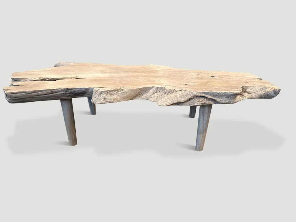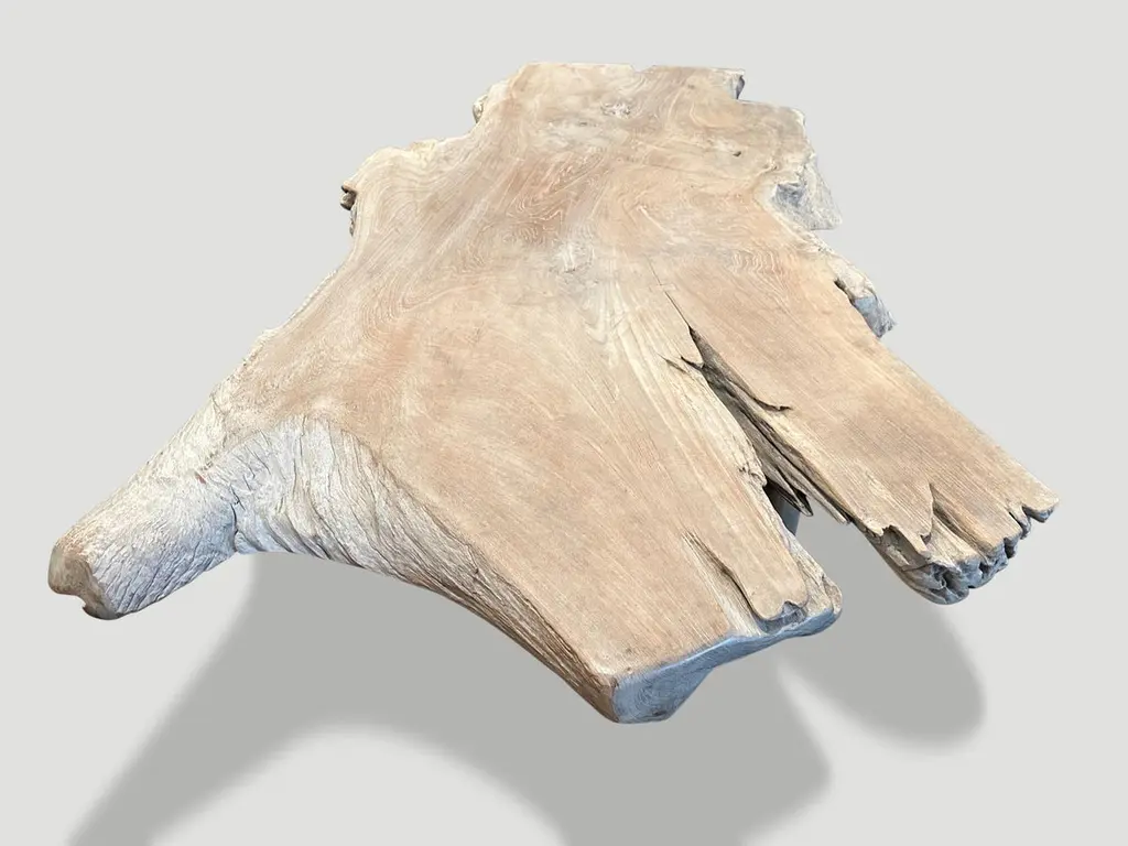 Impressive three inch single slab reclaimed teak wood coffee table with beautiful patina. We lightly bleached the beautiful teak to a bone finish and added a butterfly inlaid into the wood. Floating on mid century style legs. It’s all in the details.The St. Barts Collection features an exciting line of organic white wash, bleached and natural weathered teak furniture. The reclaimed teak is bleached and left to bake in the sun and sea salt air for over a year to achieve this unique finish. Select pieces are infused with a brilliant aqua resin that is cracked to achieve a unique quartz crystal effect. The final result evokes imagery of the white sand beaches and brilliant aqua waters of the famous French Caribbean Island.Own an Andrianna Shamaris original.Andrianna Shamaris. The Leader In Modern Organic Design.