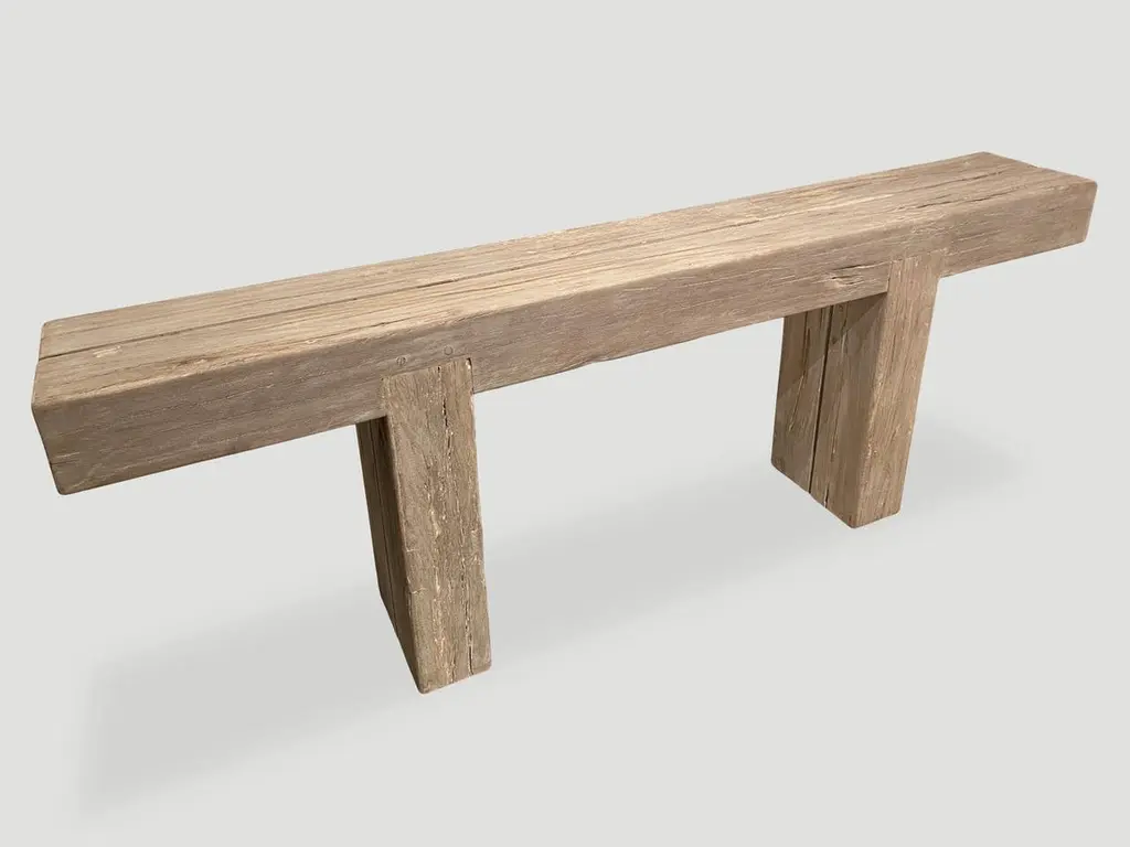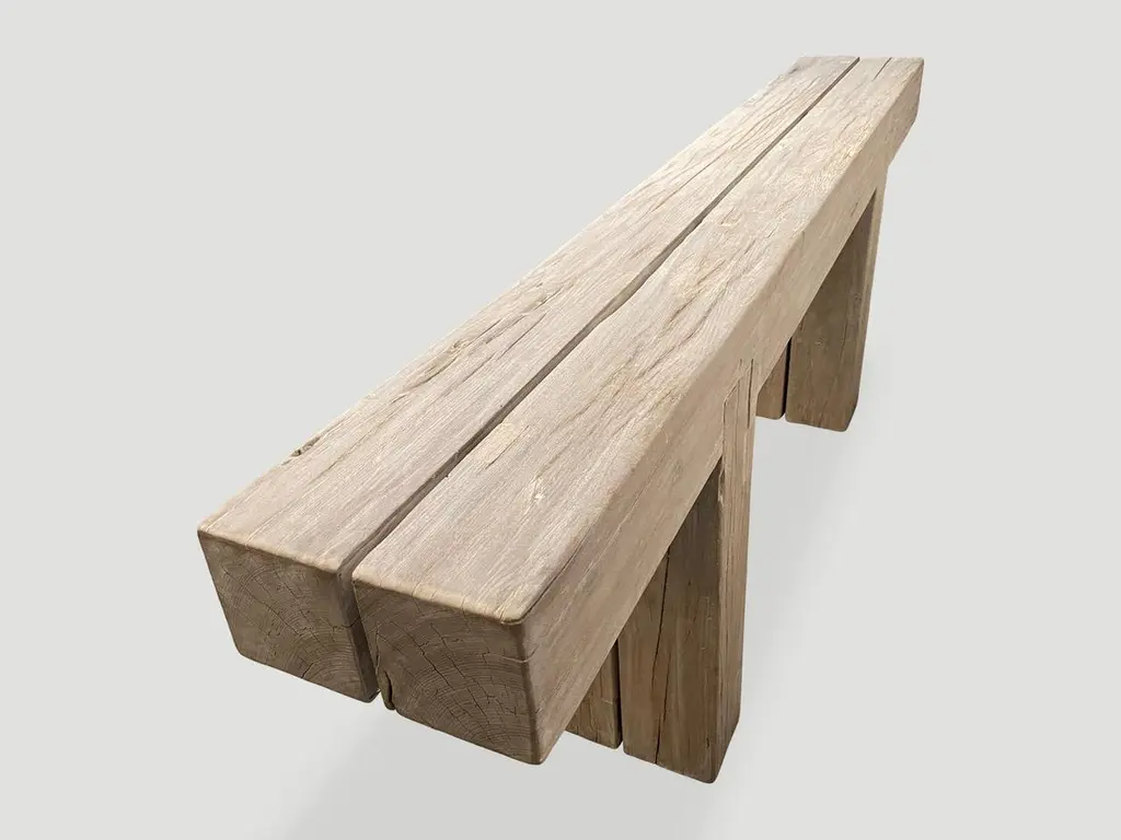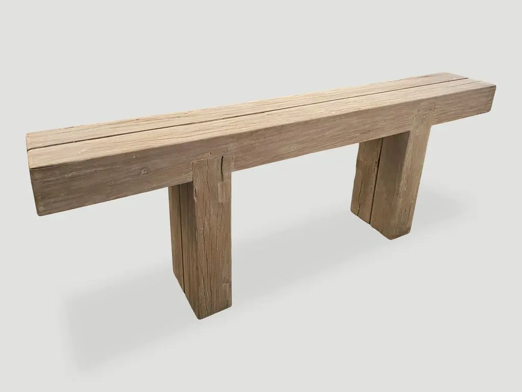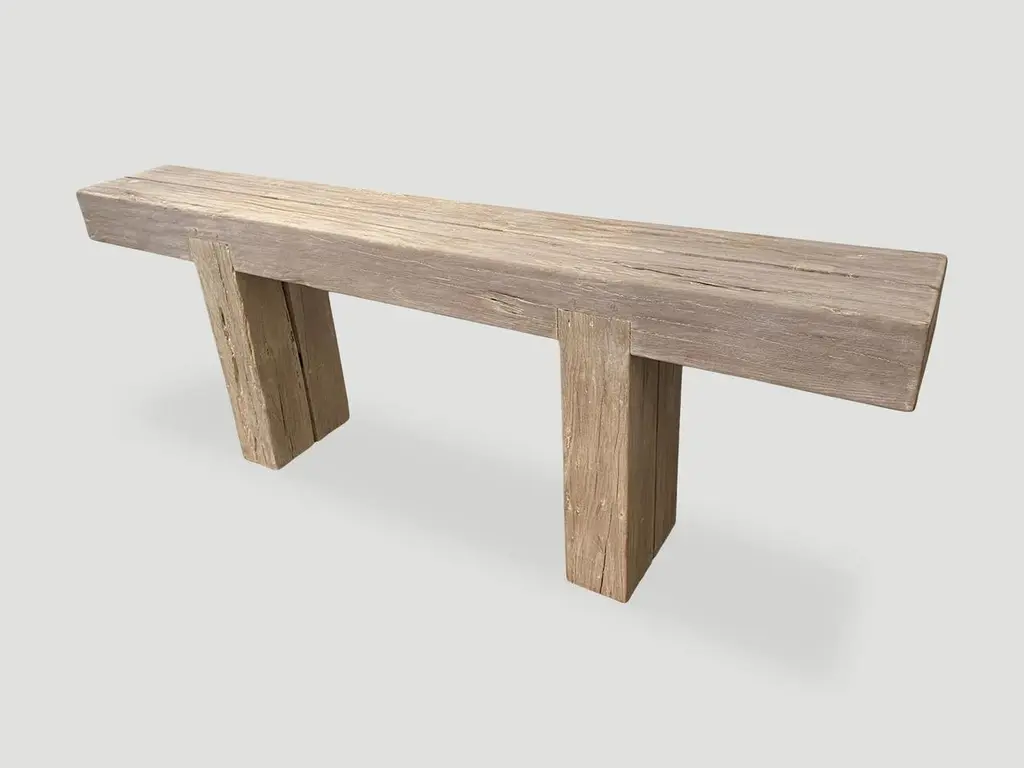 Reclaimed bleached teak log console with an added light white wash finish revealing the beautiful grain in this hundred year old teak wood. The two top logs at 6" x 6" rest on a minimalist teak log base also 6" x 6" and inset into the top. Custom finishes available.The St. Barts Collection features an exciting new line of organic white wash, bleached and natural weathered teak furniture. The reclaimed teak is bleached and left to bake in the sun and sea salt air for over a year to achieve this unique finish. Select pieces are infused with a brilliant aqua resin that is cracked to achieve a unique quartz crystal effect. The final result evokes imagery of the white sand beaches and brilliant aqua waters of the famous French Caribbean Island.Own an Andrianna Shamaris original.Andrianna Shamaris. The Leader In Modern Organic Design.