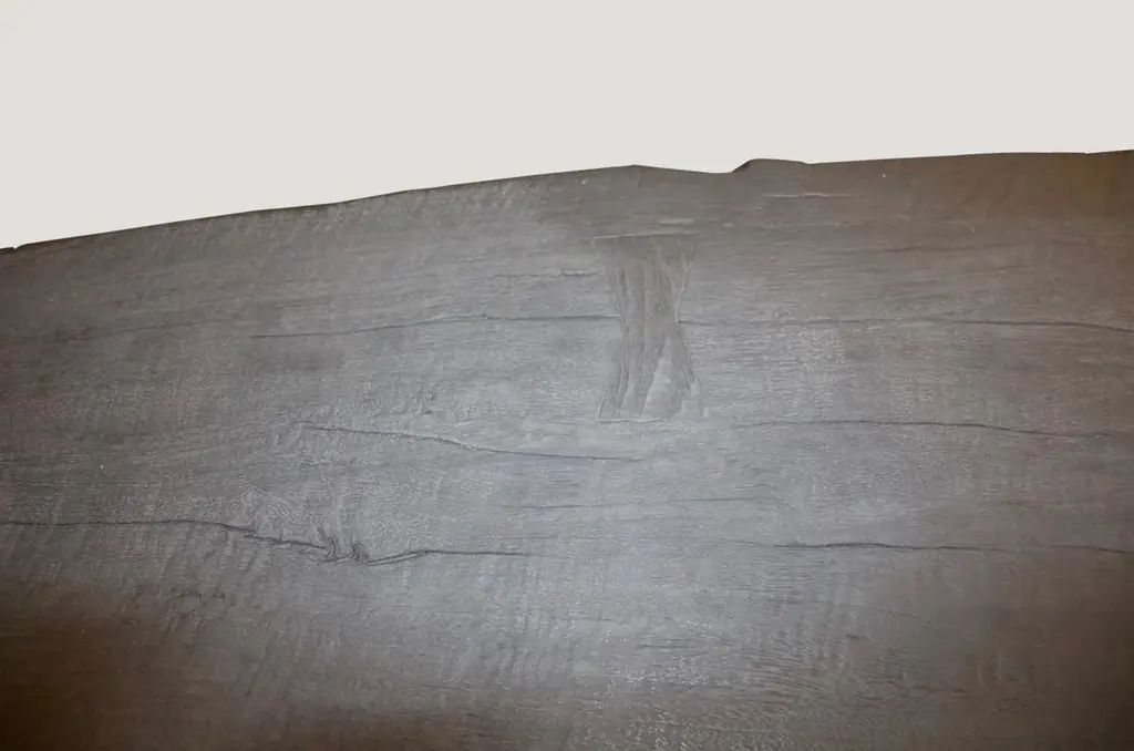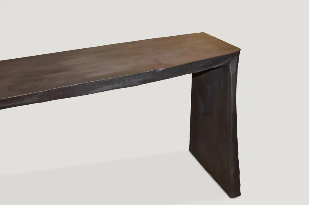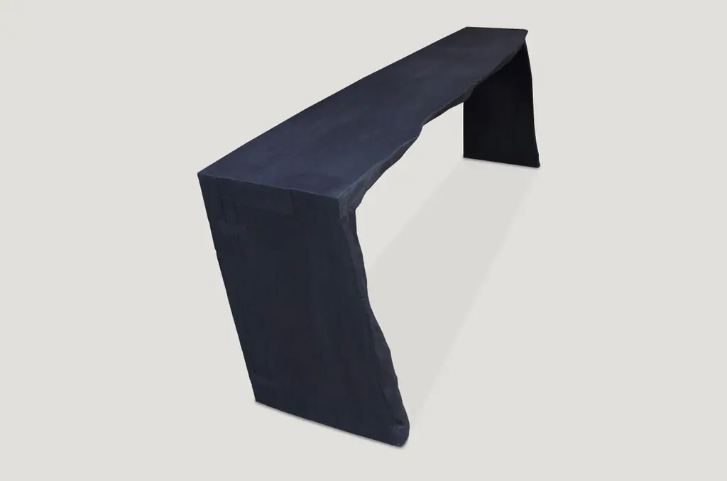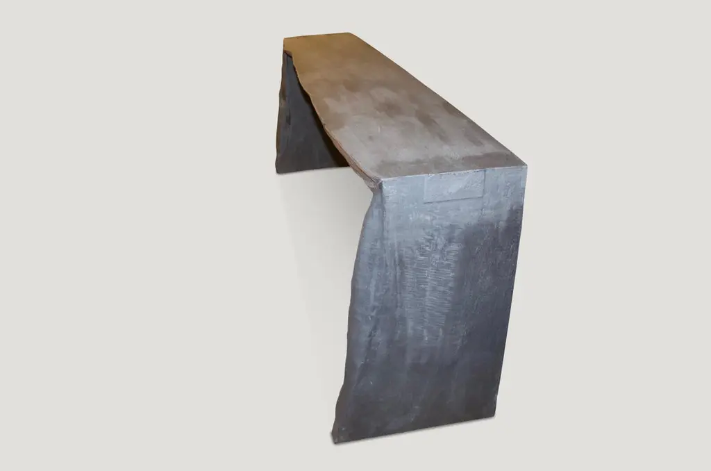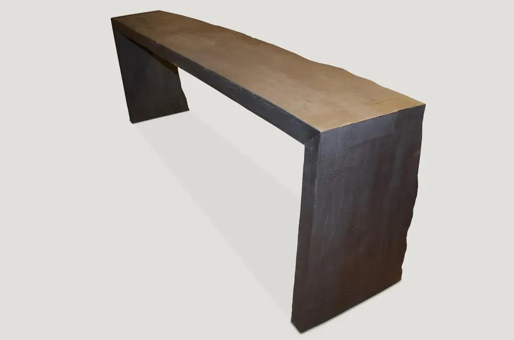Stunning charred teak wood console with butterfly detail and the legs joined by dovetail. The back of the console is cut straight to sit against a wall while the front section, including the legs are left with a live edge going up to 18″ wide. Organic is the new modern.The Triple Burnt Collection represents a unique line of modern furniture made from solid organic wood. Burnt three times to produce a rich, charcoal finish with impressive depth-a result unachievable using standard stains and finishes. A perfect combination of modern and organic.Own an Andrianna Shamaris original.Andrianna Shamaris. The Leader In Modern Organic Design™