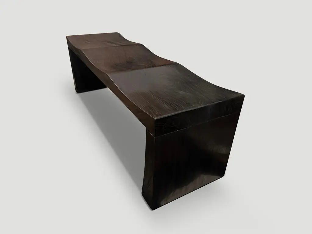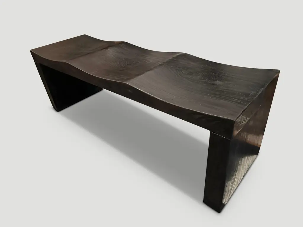 The wave bench represents a sleek, modern aesthetic, designed to provide comfort and durability. Solid reclaimed teak wood is hand carved from a single thick slab into a wave design. Burnt, sanded and sealed revealing the beautiful wood grain. Custom size, stains and finishes available. Please inquire.The Triple Burnt Collection represents a unique line of modern furniture made from solid organic wood. Burnt three times to produce a rich, charcoal finish with impressive depth-a result unachievable using standard stains and finishes. A perfect combination of modern and organic.Own an Andrianna Shamaris original.Andrianna Shamaris. The Leader In Modern Organic Design.