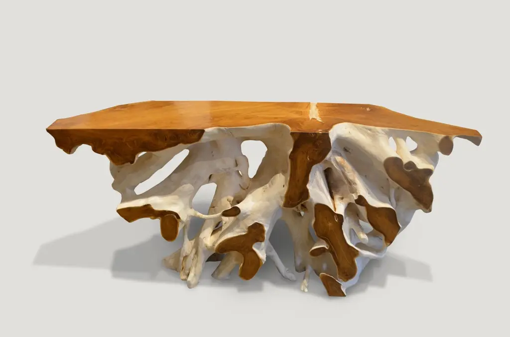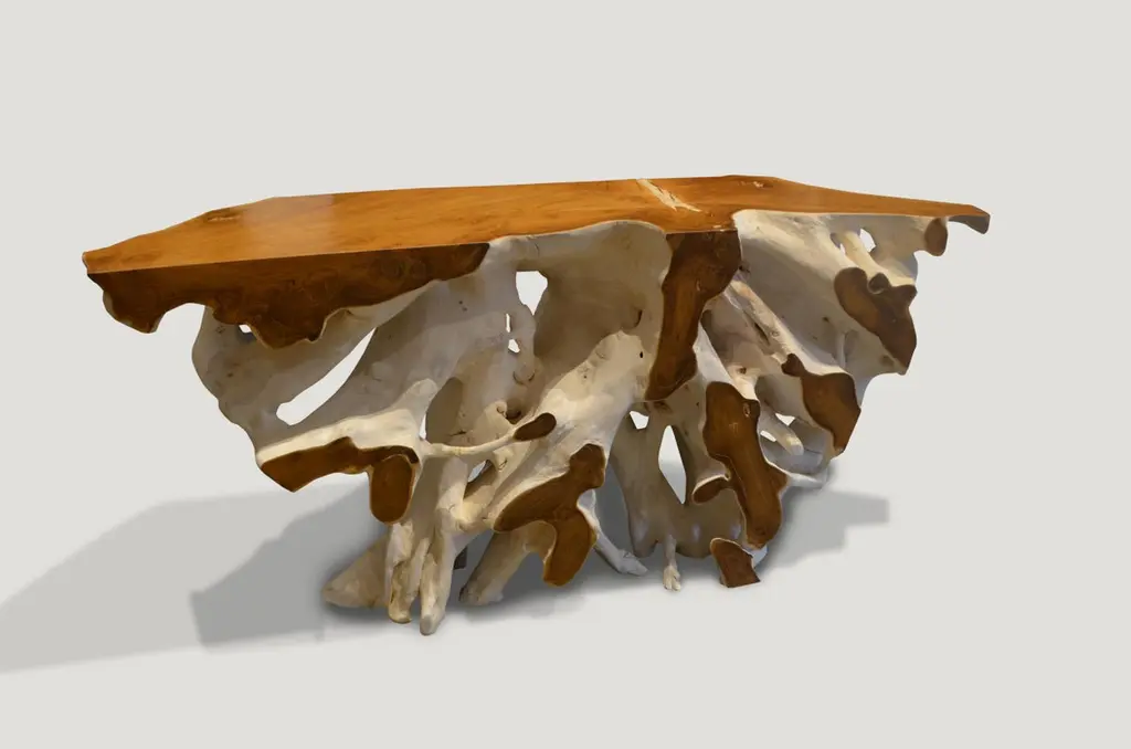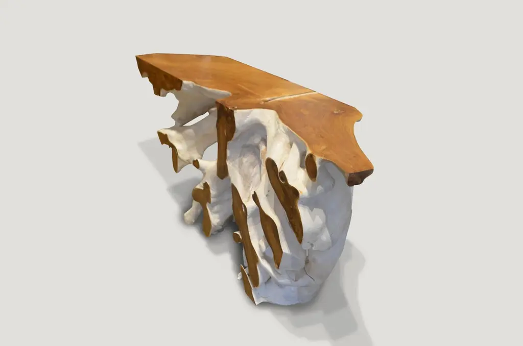 The flat sections of this beautiful teak wood console have been polished to enhance the natural reclaimed teak wood. The organic sections have been bleached revealing a stunning contrast.Andrianna Shamaris. The Leader In Modern Organic Design.