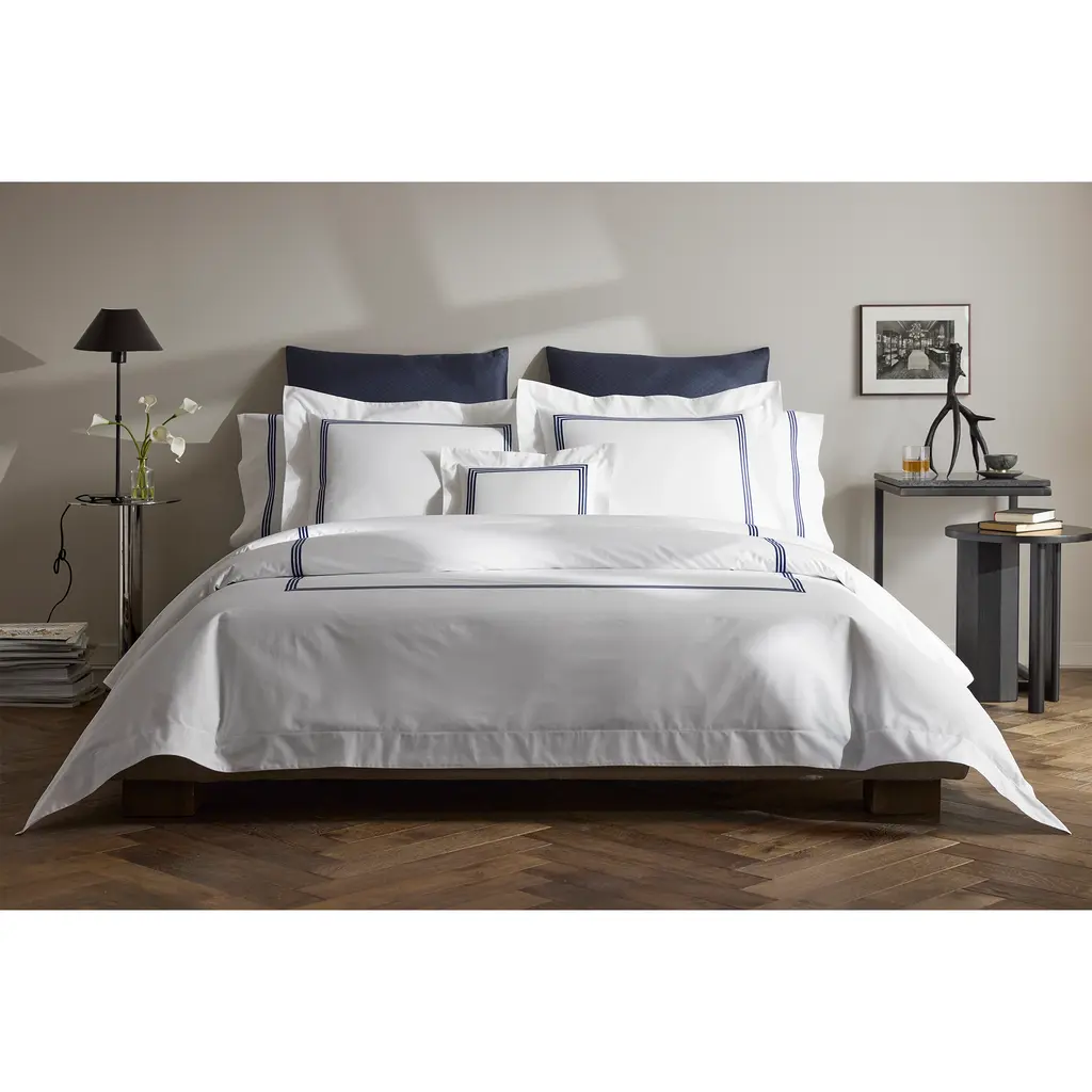 Inspired by classic hotel beds, the Bel Tempo Collection captures the essence of serenity in the form of three embroidered stripes on crisp, 520-thread count Ceylon percale. The result is a look that blends a contemporary appeal with heritage design. Pair Matouk's Bel Tempo bed linens with the matching Ceylon fitted sheet.