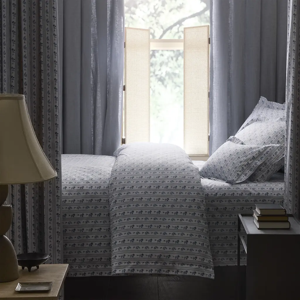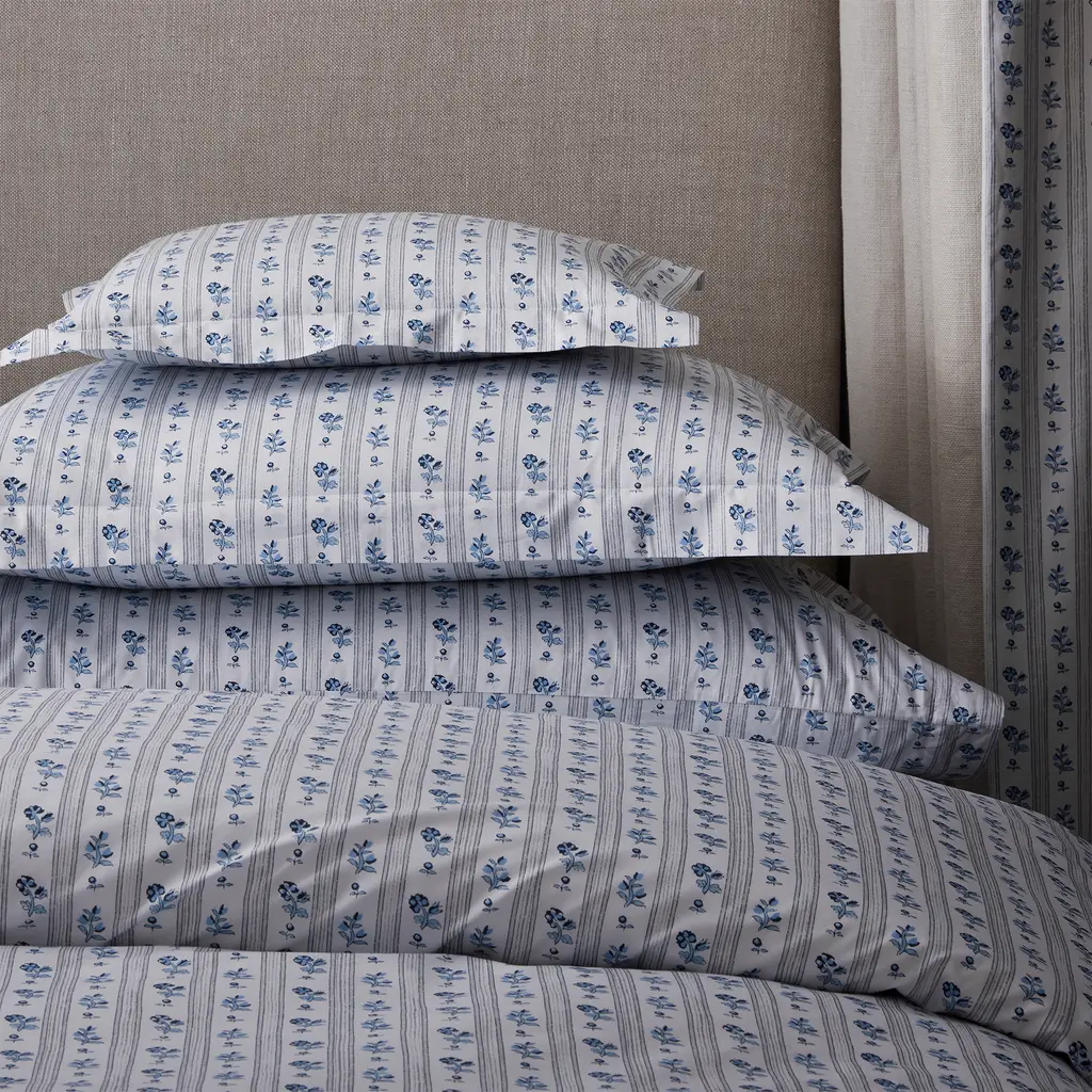 Cabanon Stripe is a Matouk Schumacher print with delicate stripes and small-scale florals that evoke a French Provincial sensibility. Crafted on crisp percale, its clean finish and refined detailing bring an airy elegance to any bed design.
