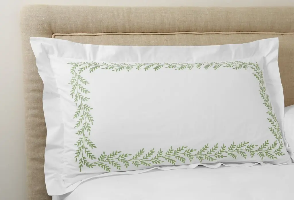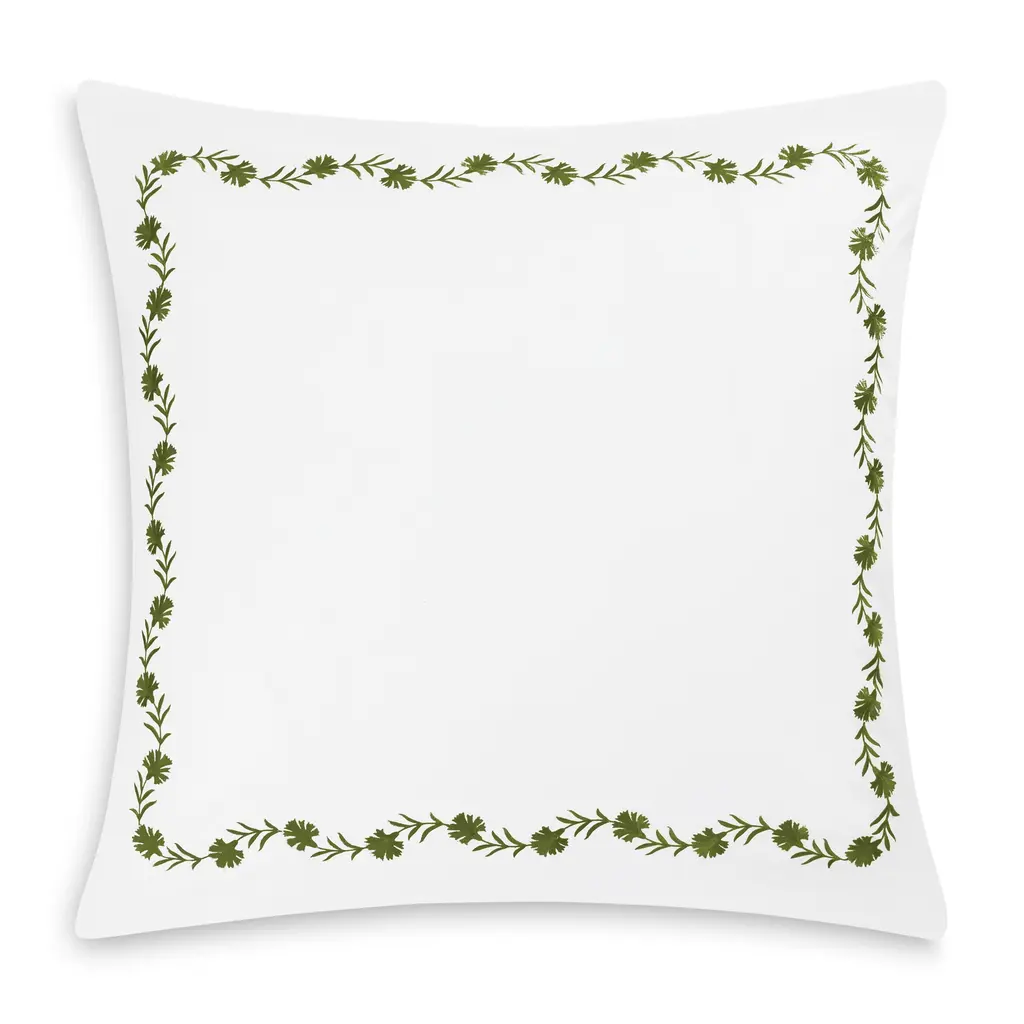 Adorned with a dancing frame of floral vines, Callista is the first decorative embroidery on the silky 500 thread count Bergamo Giza Egyptian cotton percale. With six colors to choose from, Callista adds a pop of character to any room and pairs beautifully with the whimsical Dominique print.