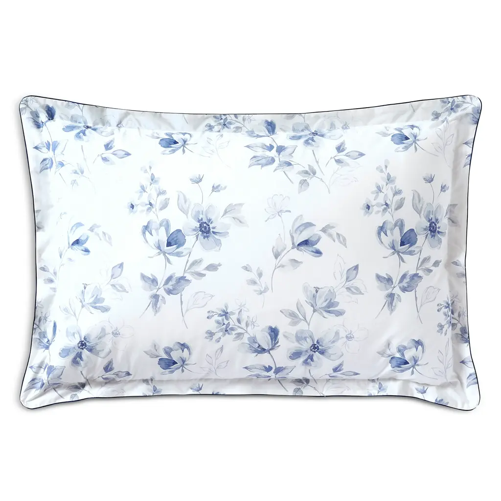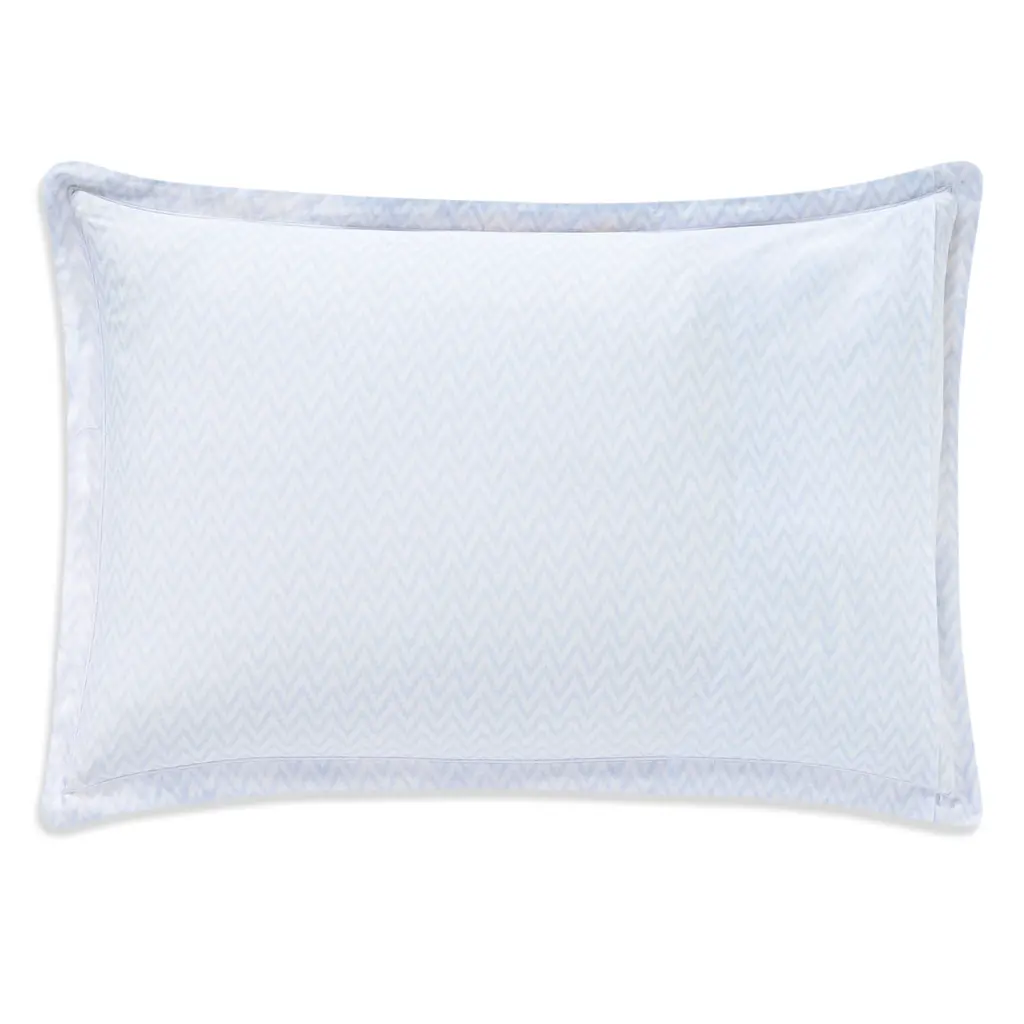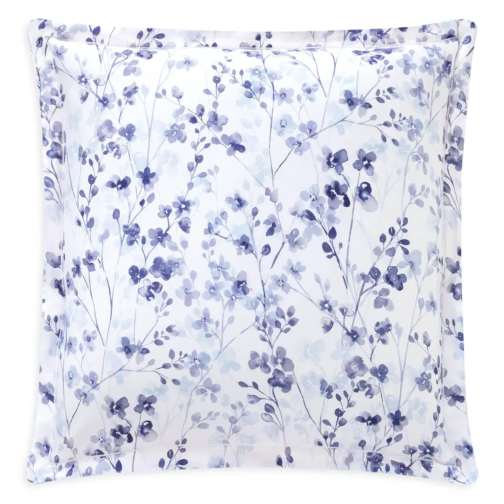 Calme is a modern blue-on-white design of flowering Japanese Quince water-colored flowers coordinated with a sophisticated textured blue-on-white chevron print. Together the two prints combine to make a most beautiful bedding design which speaks of ephemeral beauty. Calme offers one an architectural approach aimed at living a true emotional and spiritual experience by reconnecting with oneself and the environment. A place that promotes a meditative state and wonder in the face of landscapes, seasonal cycles, or living elements. Admire the snowpack of the garden and lull your imagination to the natural rhythm of the winter light. Japanese Quince (Chaenomeles japonica) start to bloom during the cold winter months, even in snow. Their delicate flowers stand out on the naked branches, offering a respite against the gloom of winter. In Art, the Japanese Quince flowers have significant cultural meaning and personify elegance and resilience. The Calme design of flowering branches shows great depth as there are branches in both the foreground and the background and the flowers themselves are depicted in multiple stages, from bud to full bloom. Calme duvet covers, printed coverlets, and shams have the flowering branches print on one side and the very modern textured chevron print on the other side. Calme flat sheets are in the Quince flowering branches print. Calme fitted sheets and pillowcases are in the blue-on-white textured chevron print.