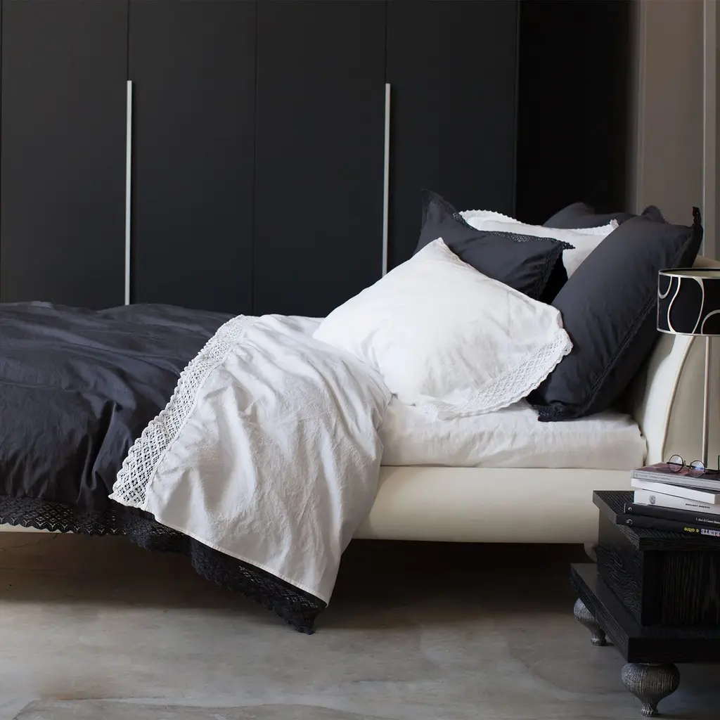 The Camilla Shams embody the timeless elegance of Italian craftsmanship, seamlessly blending tradition with modern refinement. Featuring an intricate 1-inch lace flange, these shams reimagine classic bed linens with a contemporary touch. Crafted from 100% extra long-staple cotton sateen with a luxurious 300 thread count, the Camilla Bedding Collection offers an exquisite softness and subtle sheen.A special garment-dyeing process ensures each piece is one-of-a-kind, while expert Italian finishing techniques create a vintage-inspired look that softens beautifully with every wash. Choose from Standard, Euro, or King sizes to pair effortlessly with your Camilla bedsheets or other bedding. Made in Italy for uncompromising quality and elegance. Available in two colors for infinite styling options, these shams are the perfect addition to complete your bedding ensemble.