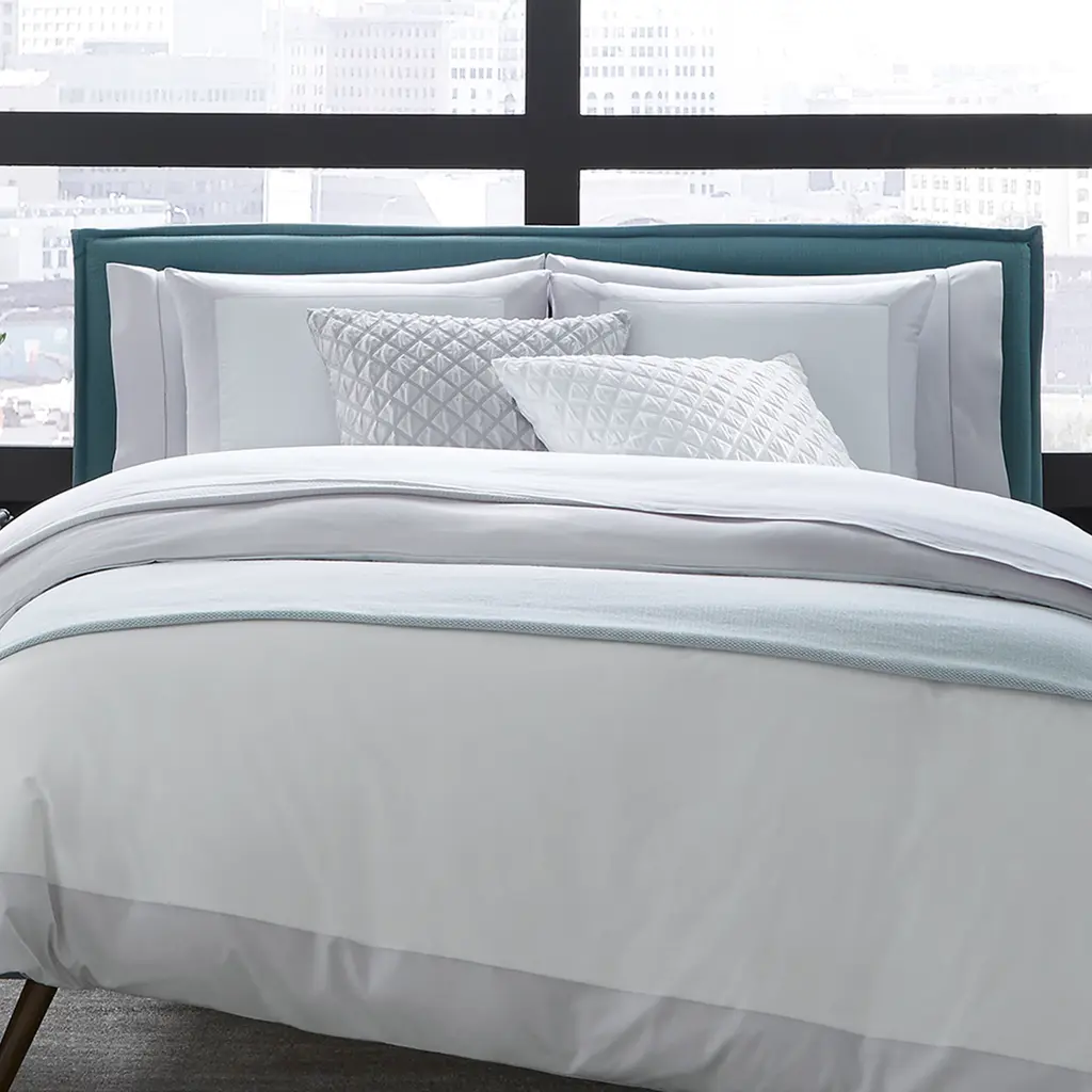 SFERRA's Casida bedding collection is minimal and modern, creating an impact with its contrast color border in sateen applique along one side, and solid sateen on the reverse for multiple ways to style.