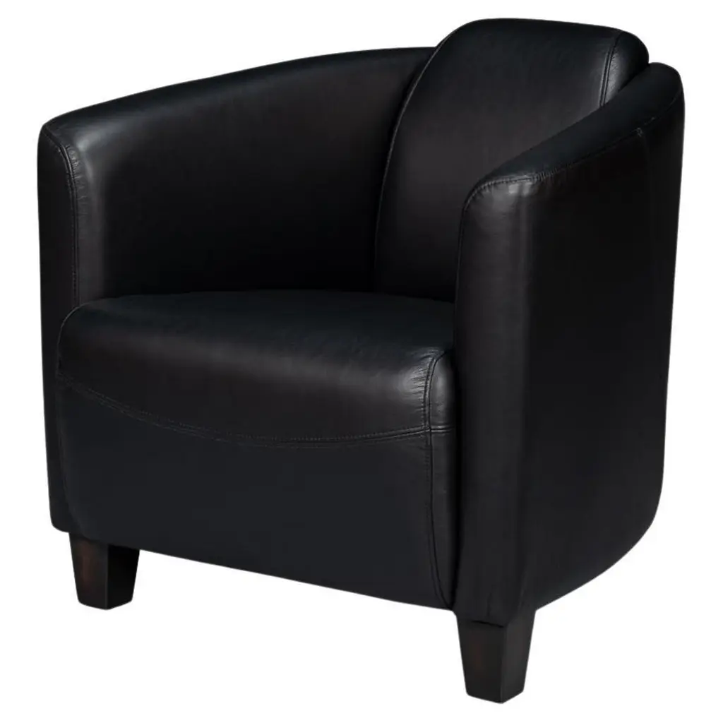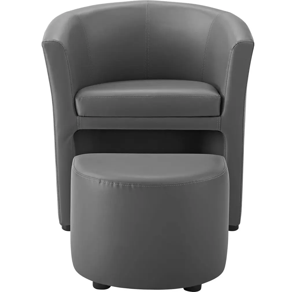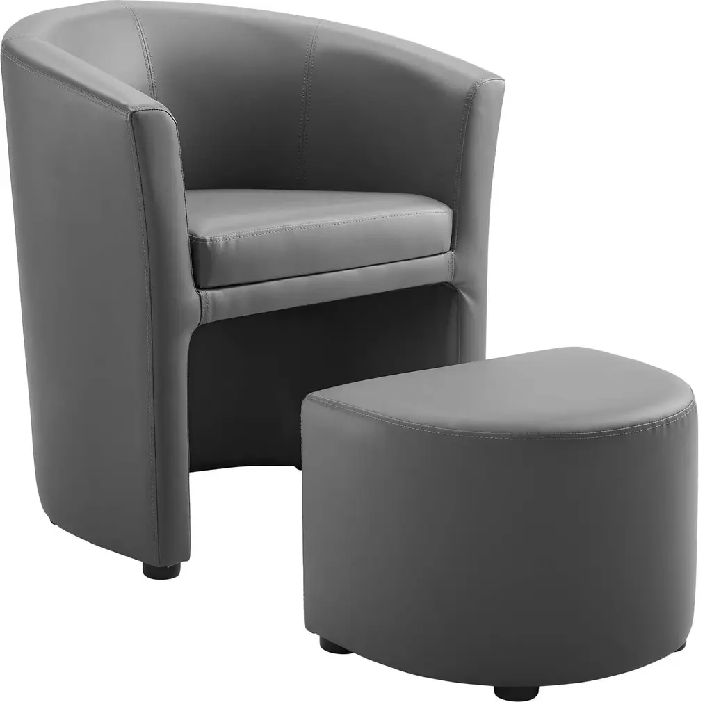 The Chesham Armchair and Ottoman from Evans & Londeen would be a great contemporary addition to your home. The design of this contemporary piece makes it a statement piece for years to come. The quality paired with the premium finish makes for a quality piece of furniture.Modern Arm ChairFoam Padded Faux LeatherTuck Away Self-Storage OttomanWooden Frame, Foot CapsWeight Capacity - 330 LbsSeat Height: 3