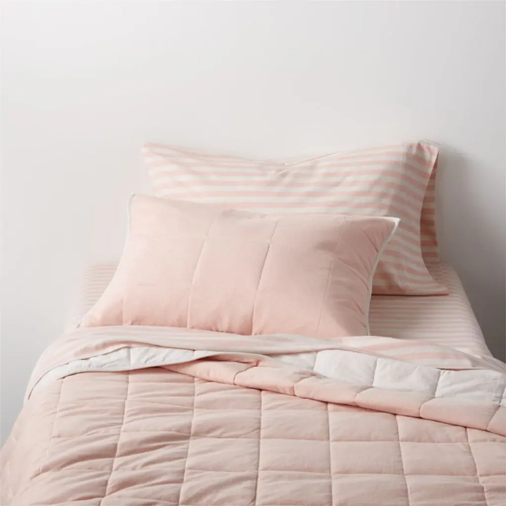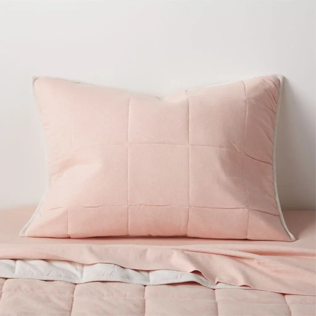 Softer than their favorite tee, cooler than the average cotton bedding and yarn-dyed for long-lasting color, our Cotton Jersey Pillow Sham just changed the bedding game. And by choosing organic cotton, you're helping create a better future for your kids: Compared to conventional cotton, it can reduce CO2 by 46%, energy consumption by 62% and irrigated water consumption by 90%. Cozy heathered light pink reverses to white to complement our matching Cotton Jersey Quilt.