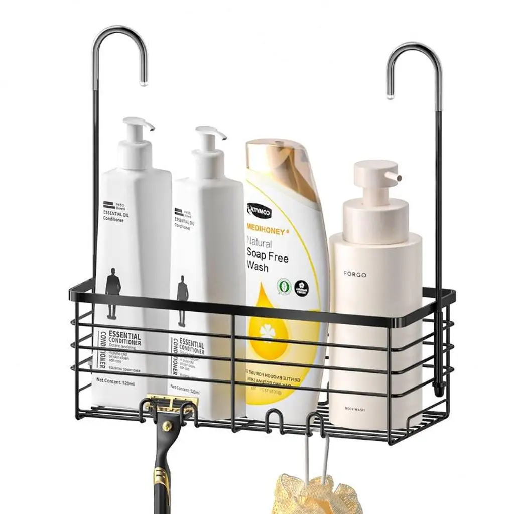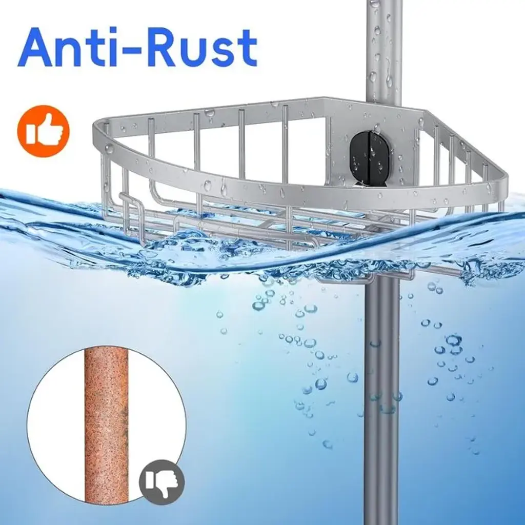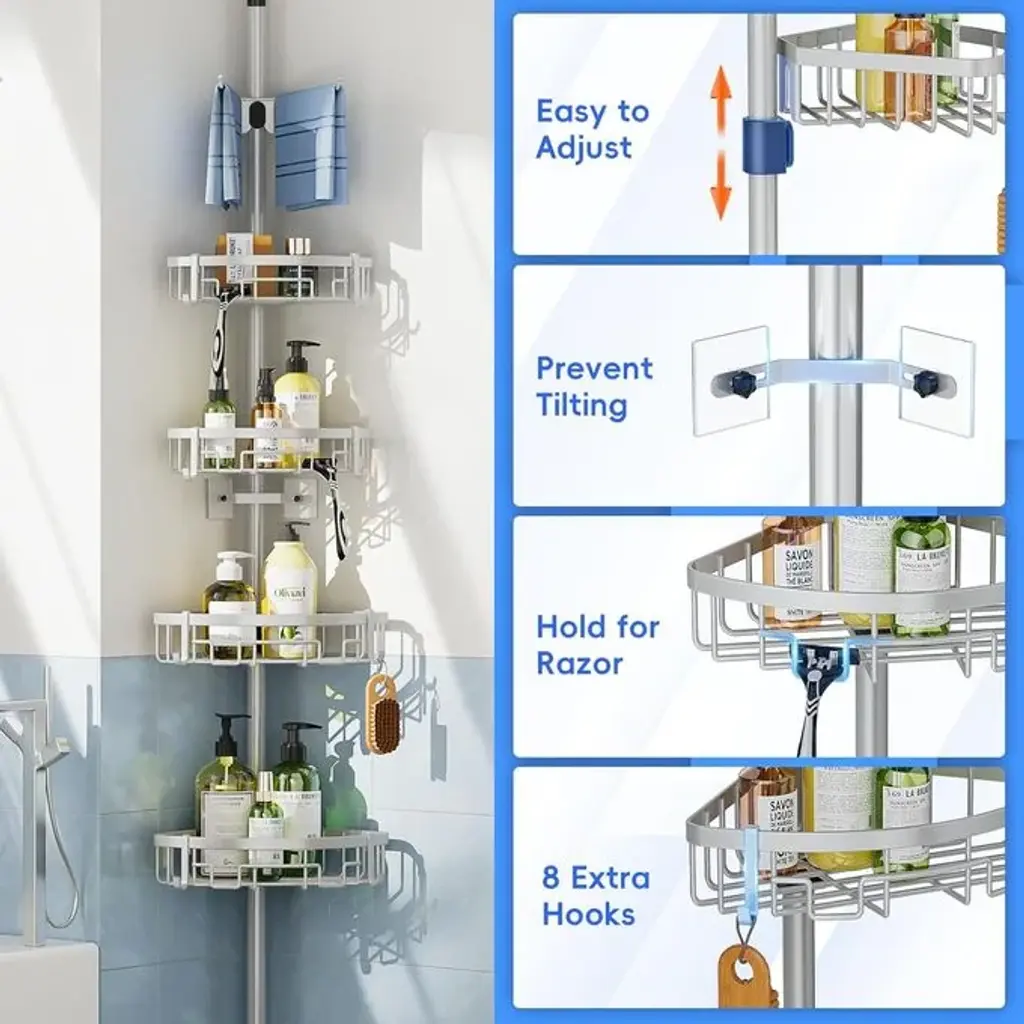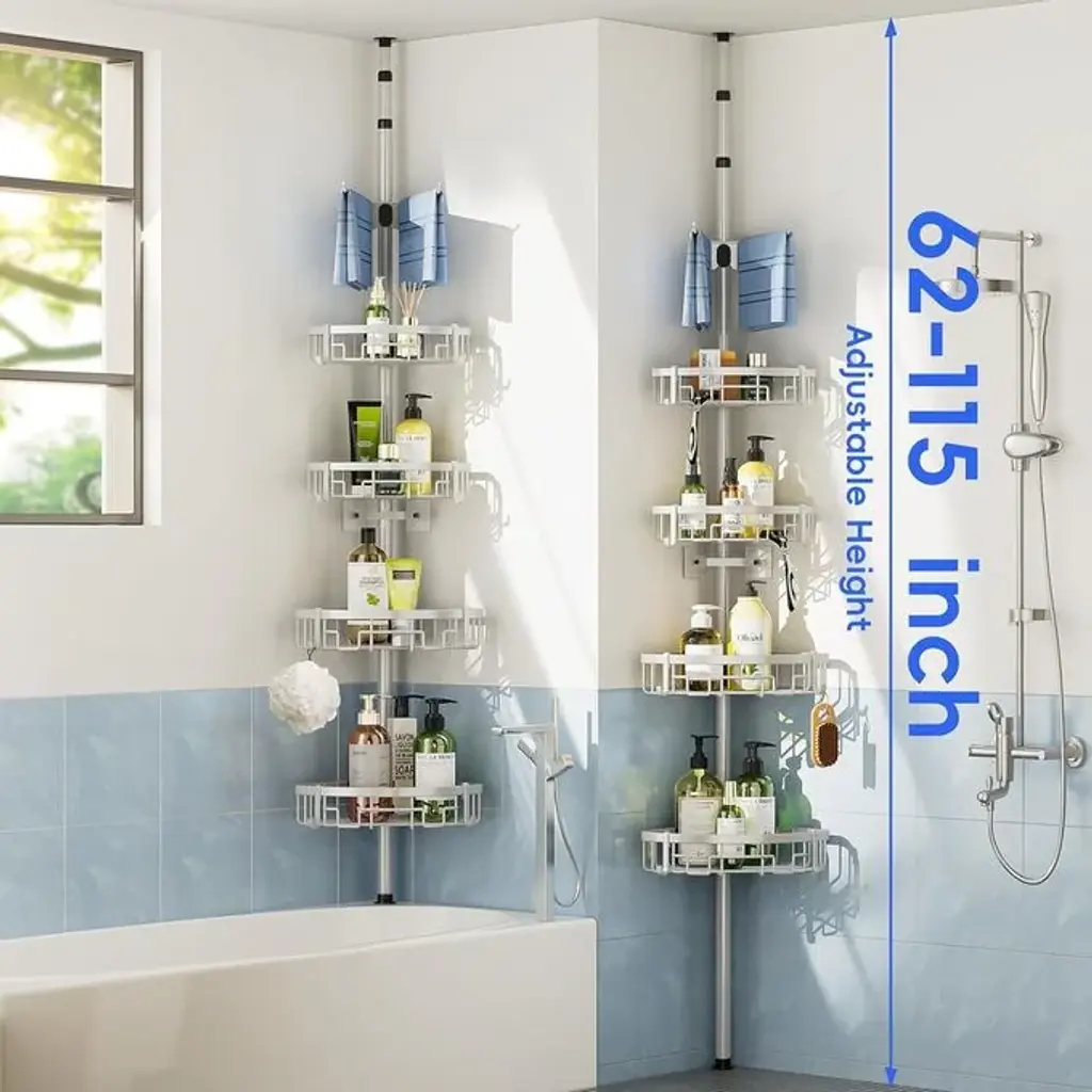 The poles throughout the shower box are 115 inches tall and you can adjust the height based on the number of sections spliced together. Each section is 15 inches and each pole has 8 sections with a 10-inch tie bar at the top, freeing you to secure the right spacing. All you need to do is attach the 4 baskets to the rubberized kit. You can conveniently adjust the height of the shelves to fit the size of your bottles to personalize your storage. The thick, rust-resistant black finish is durable enough for use in humid environments such as bathrooms and has a long service life. The shower shelf has a strong load-bearing capacity and can hold shampoo bottles, soaps, conditioners, shower gels and more. Equipped with fixing bar to correct the tilt, the bathroom organizer prevents the bathroom storage shelf from collapsing and keeps it stable and safe. 15 MINUTES ASSEMBLY - No drilling required, comes with installation manual, instructions and parts list, installing the shower storage shelf is very easy.