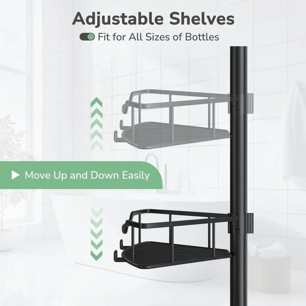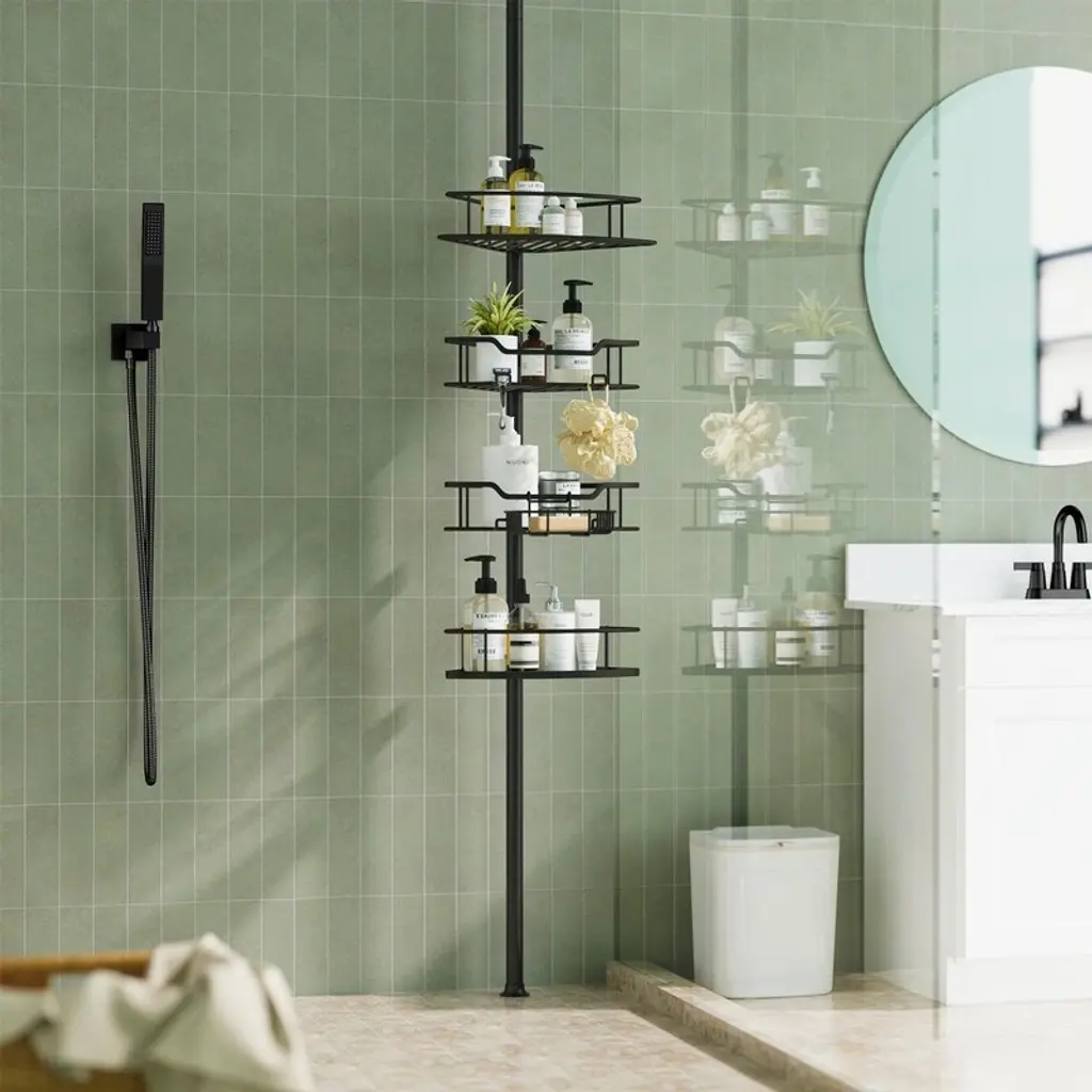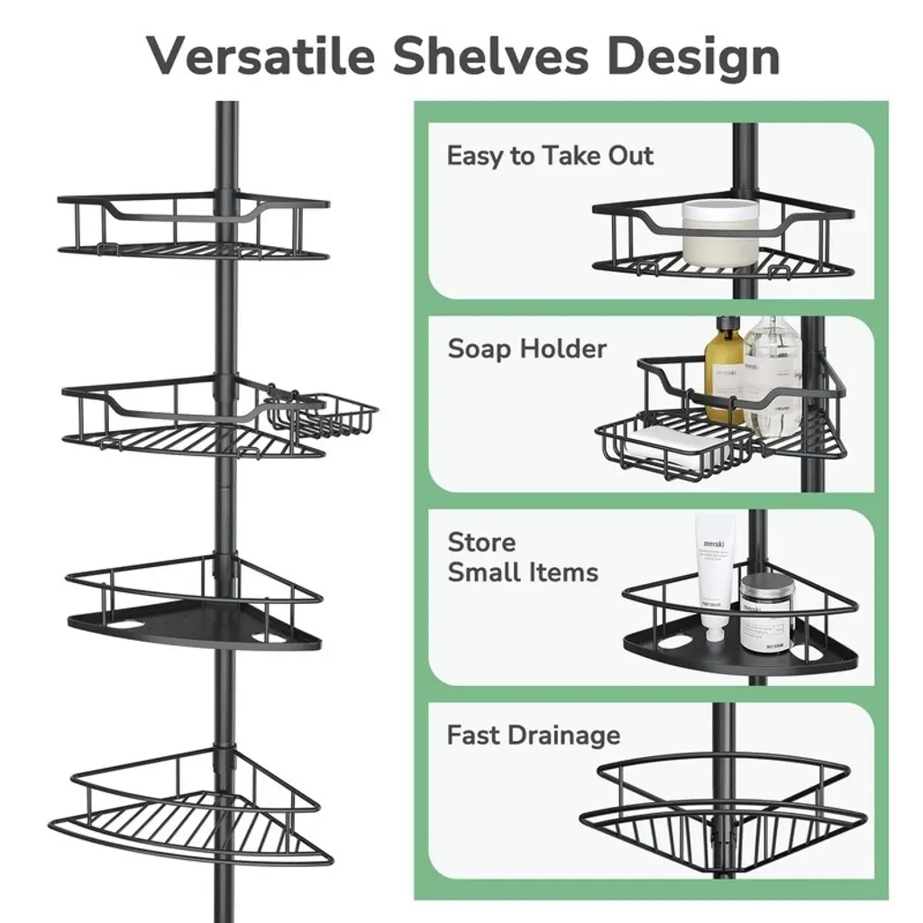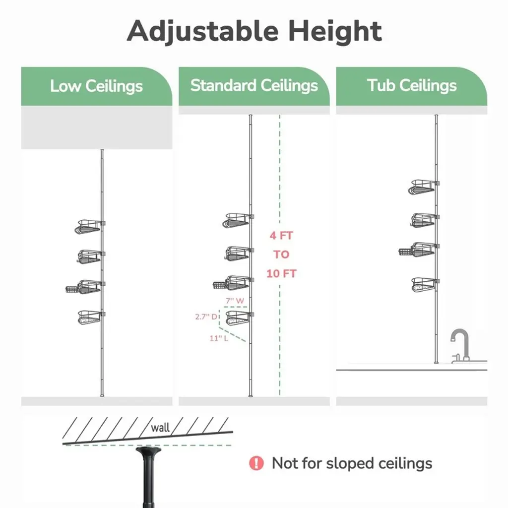 The shower caddy tension pole consists of multiple sections, with the upper end retractable from 0 to 10 inches. It is suitable for ceilings ranging from 4 to 10 feet in height.This corner shower organizer can be adjusted between 51 and 121 inches, fitting most bathrooms, bathtubs, and shower stalls. Removable shelves enable customizing the spacing to accommodate bottles of various heights.Equipped with 4 shelves and 1 soap holder, each basket can support up to 6.6 lbs. It is sturdy enough to store over 20 bottles of shampoo, soap, and other shower essentials, keeping everything organized and within easy reach.Made from high - quality stainless steel with a fine paint finish, the tension shower caddy is durable and waterproof, ideal for humid environments. Its open wire design ensures rapid drainage, maintaining a clean and dry shower area.Featuring a built - in spring tension rod, a 1 - inch diameter tube, and large anti - slip rubber pads, the corner shower caddy creates a strong pulling force to stand upright between the floor and ceiling. Clips firmly hold the shelves in place.The corner shower shelves use a splicing and telescoping design. Simply rotate the shower caddy pole for quick installation or disassembly without the need for tools, and it won't damage the walls.