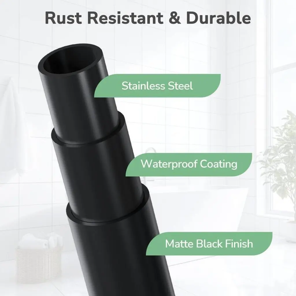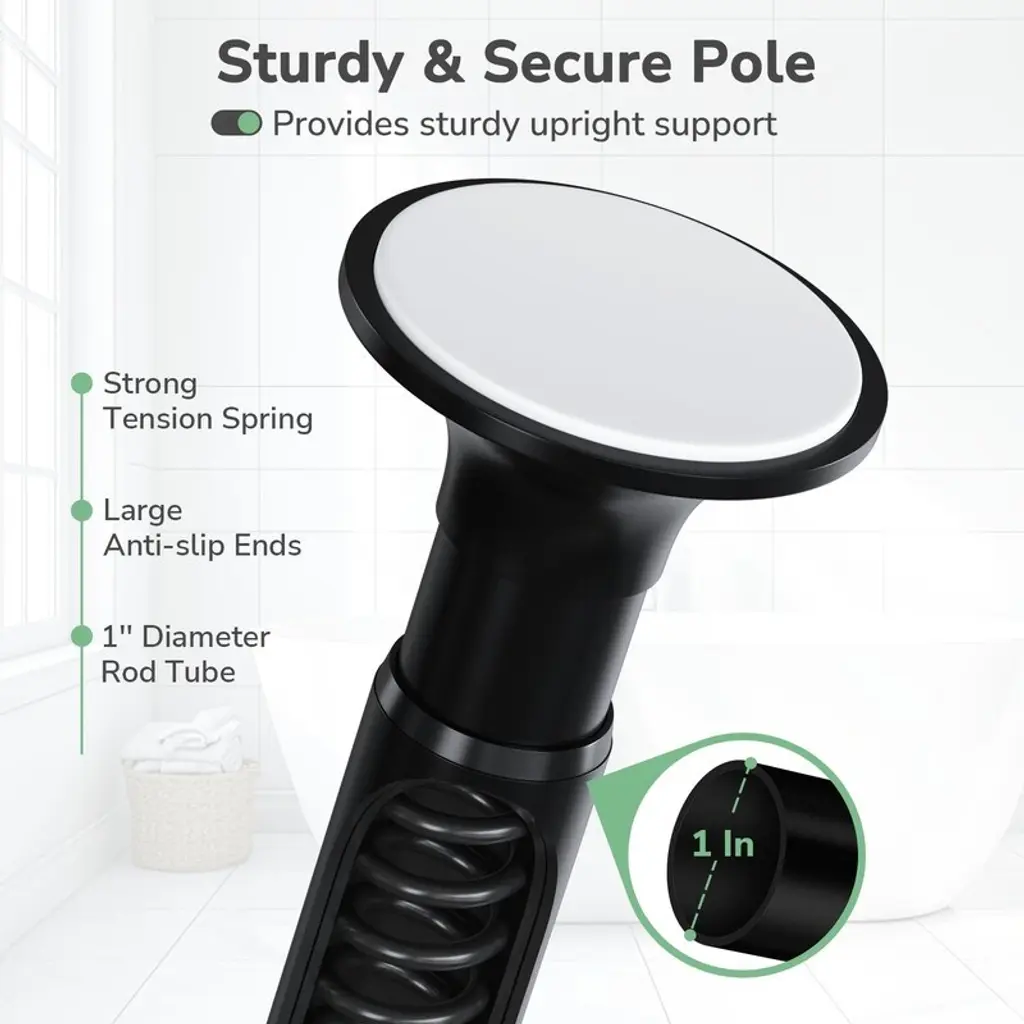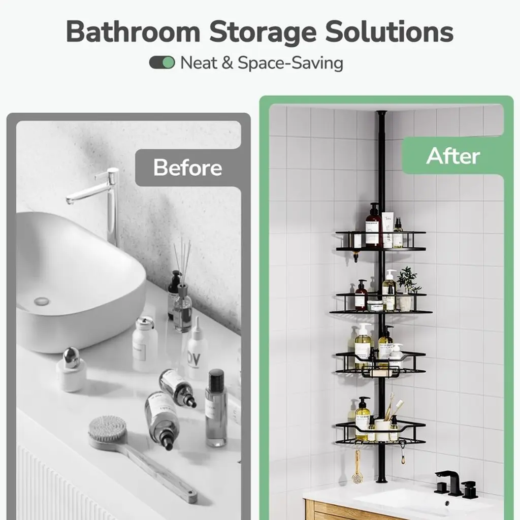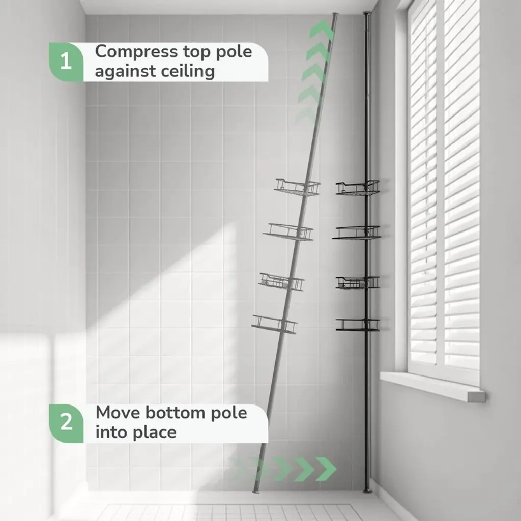 The shower caddy tension pole consists of multiple sections, with the upper end retractable from 0 to 10 inches. It is suitable for ceilings ranging from 4 to 10 feet in height.This corner shower organizer can be adjusted between 51 and 121 inches, fitting most bathrooms, bathtubs, and shower stalls. Removable shelves enable customizing the spacing to accommodate bottles of various heights.Equipped with 4 shelves and 1 soap holder, each basket can support up to 6.6 lbs. It is sturdy enough to store over 20 bottles of shampoo, soap, and other shower essentials, keeping everything organized and within easy reach.Made from high - quality stainless steel with a fine paint finish, the tension shower caddy is durable and waterproof, ideal for humid environments. Its open wire design ensures rapid drainage, maintaining a clean and dry shower area.Featuring a built - in spring tension rod, a 1 - inch diameter tube, and large anti - slip rubber pads, the corner shower caddy creates a strong pulling force to stand upright between the floor and ceiling. Clips firmly hold the shelves in place.The corner shower shelves use a splicing and telescoping design. Simply rotate the shower caddy pole for quick installation or disassembly without the need for tools, and it won't damage the walls.
