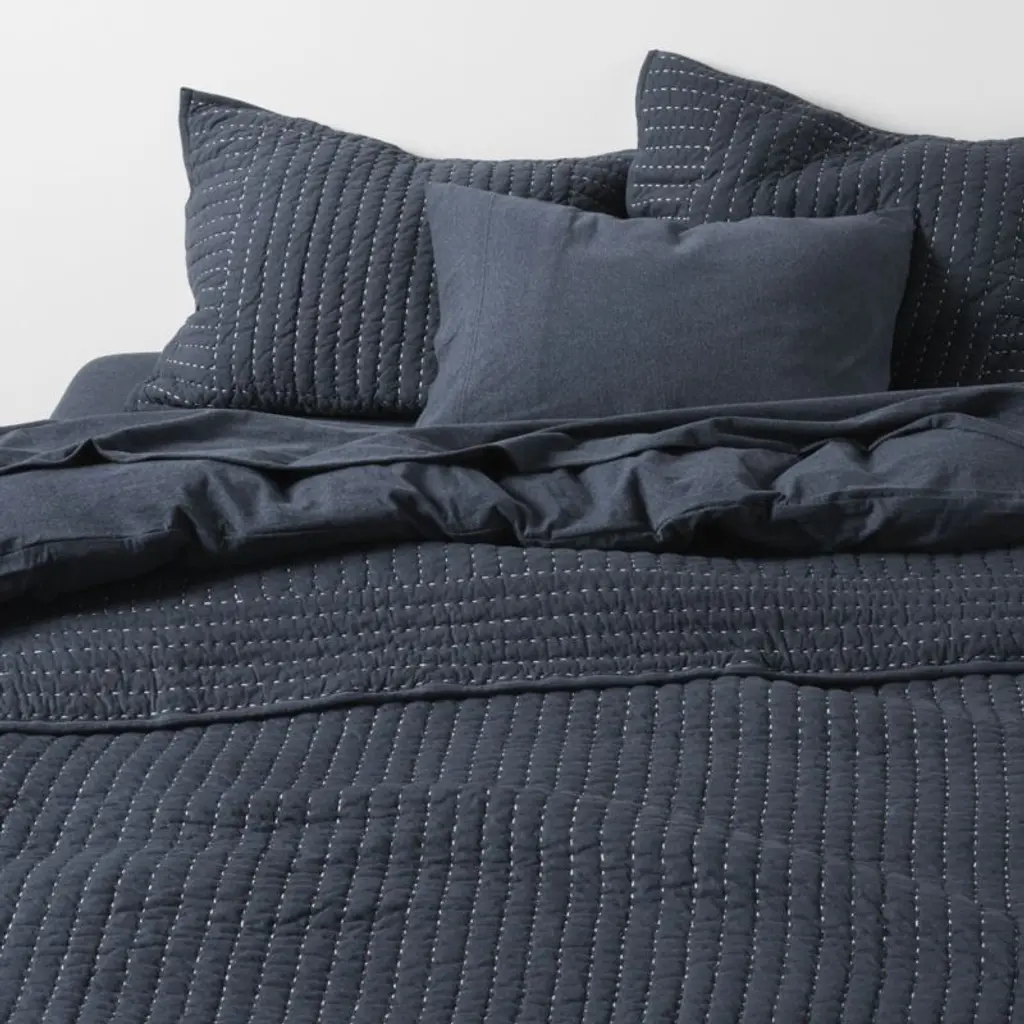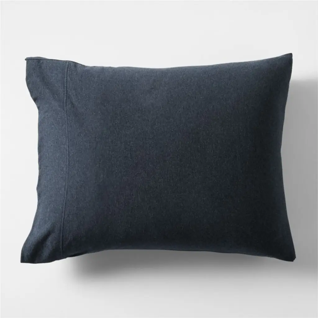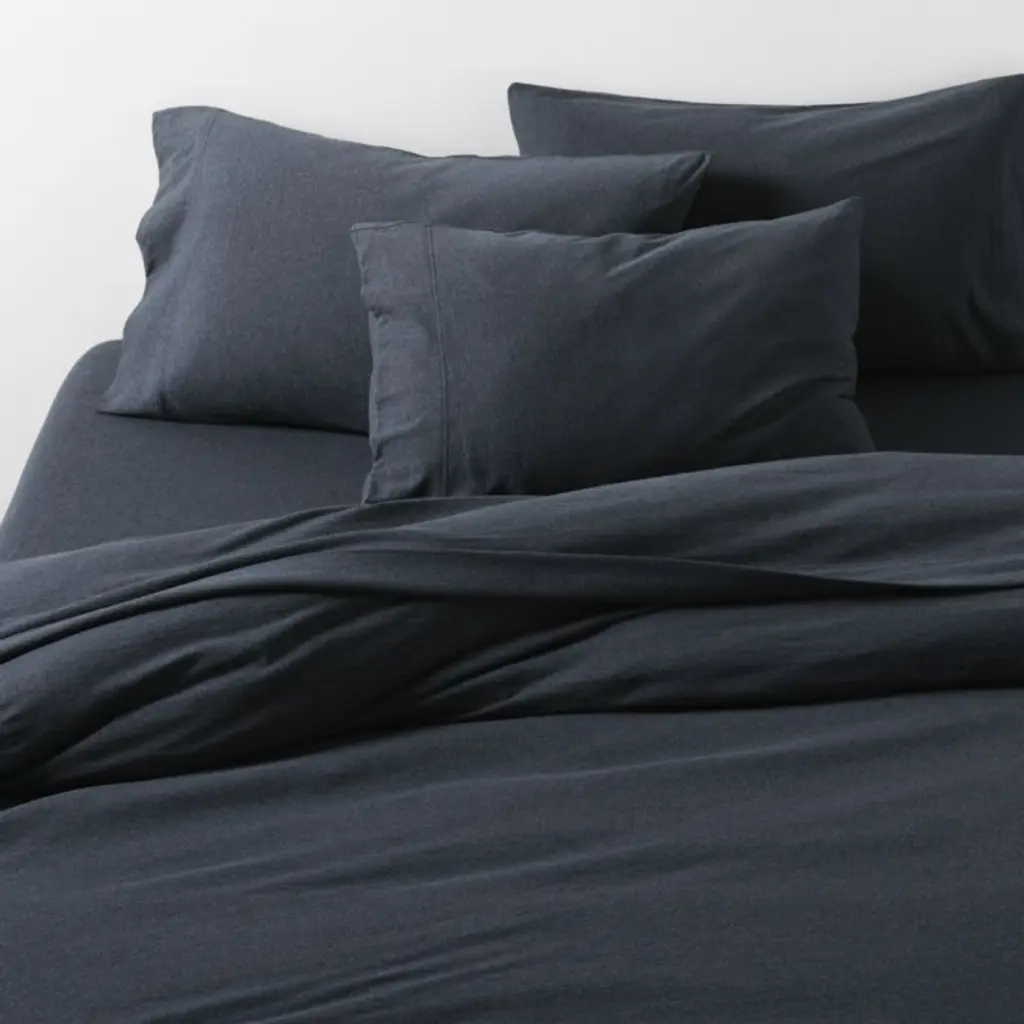 Softer than your favorite t-shirtand just as casual-classicour Cozysoft collection makes a bed you won't want to get out of. Organic cotton knits breathable jersey bedding that's supersoft and irresistibly cozy. Heathered for a dark blue with depth, the midnight navy pillow sham layers with the coordinating sheets, pillowcases and duvet covers for a modern look that's understated and inviting.Bed pillows also available.