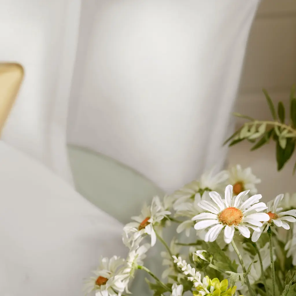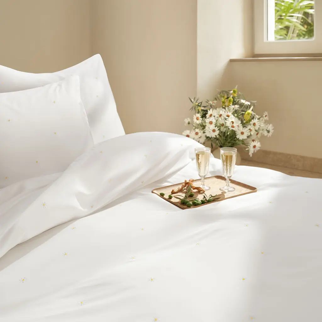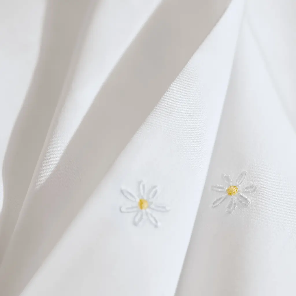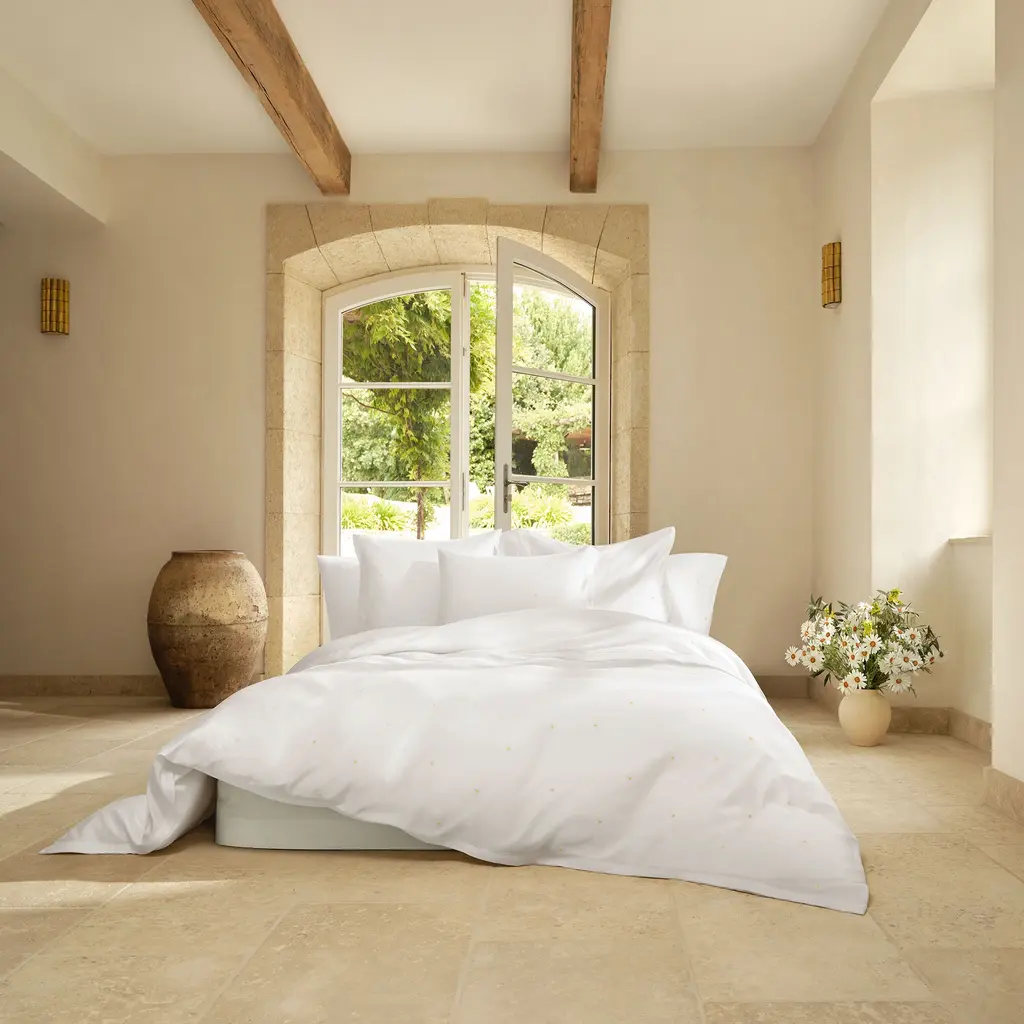 The Schlossberg Daisy Bedding Collection enchants so sweetly, delicately and wonderfully light. Small embroidered daisies, dainty and sublime, dance across pure white sateen on the top of the bed linen to bring a beautiful garden meadow to your room.
