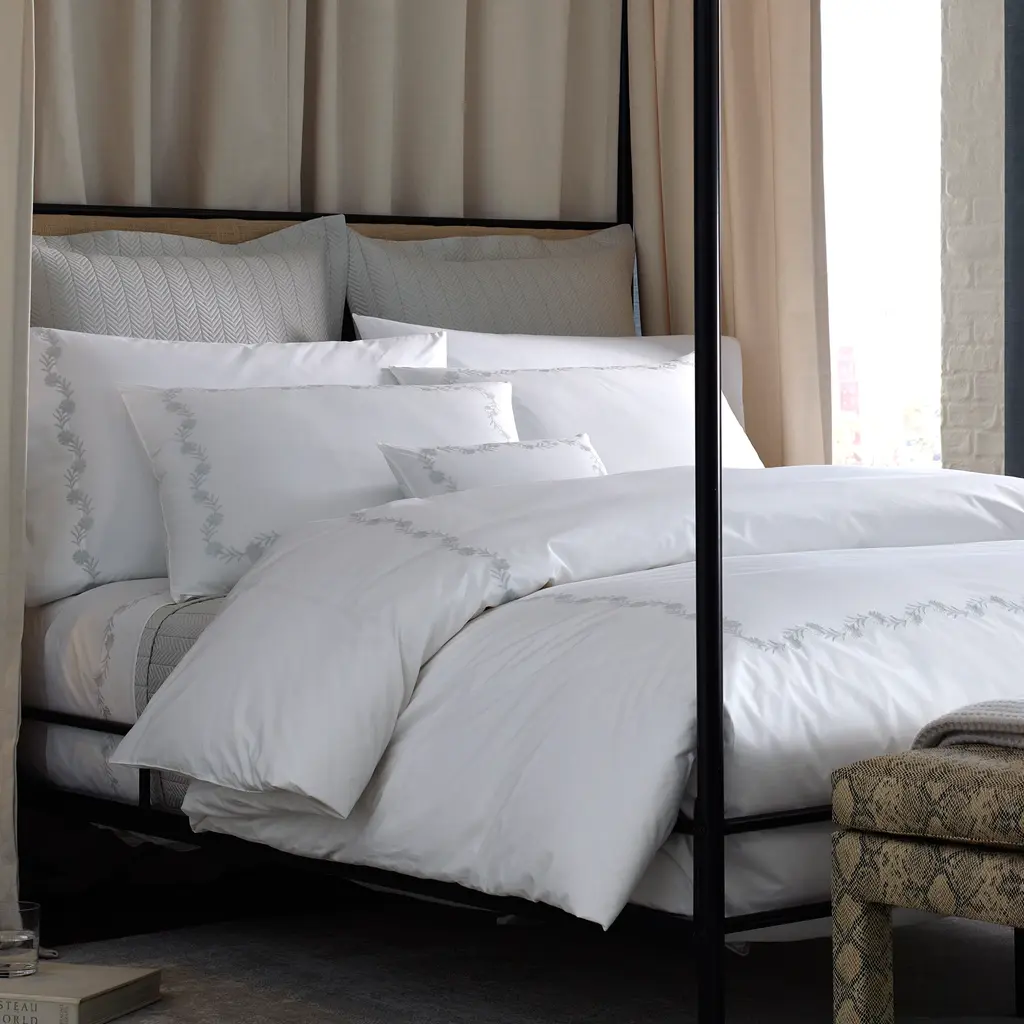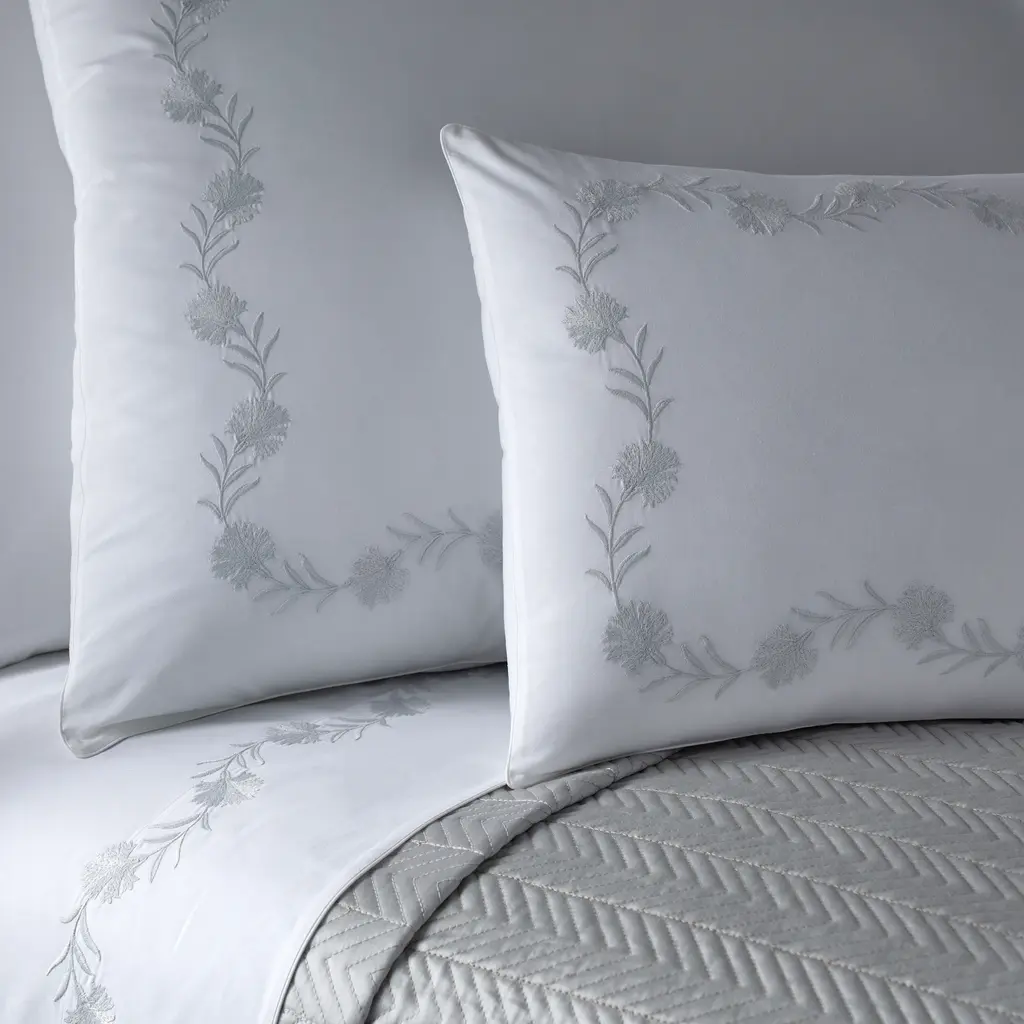 Beautifully embroidered floral vines on white percale bring a classic look with vibrant notes to the Daphne Collection from Matouk.