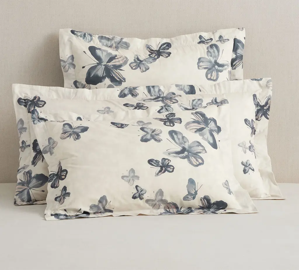 The Farfalle Sateen Bedding Collection from DEA Luxury Linens features a multi-color butterfly print on soft cotton sateen fabric.