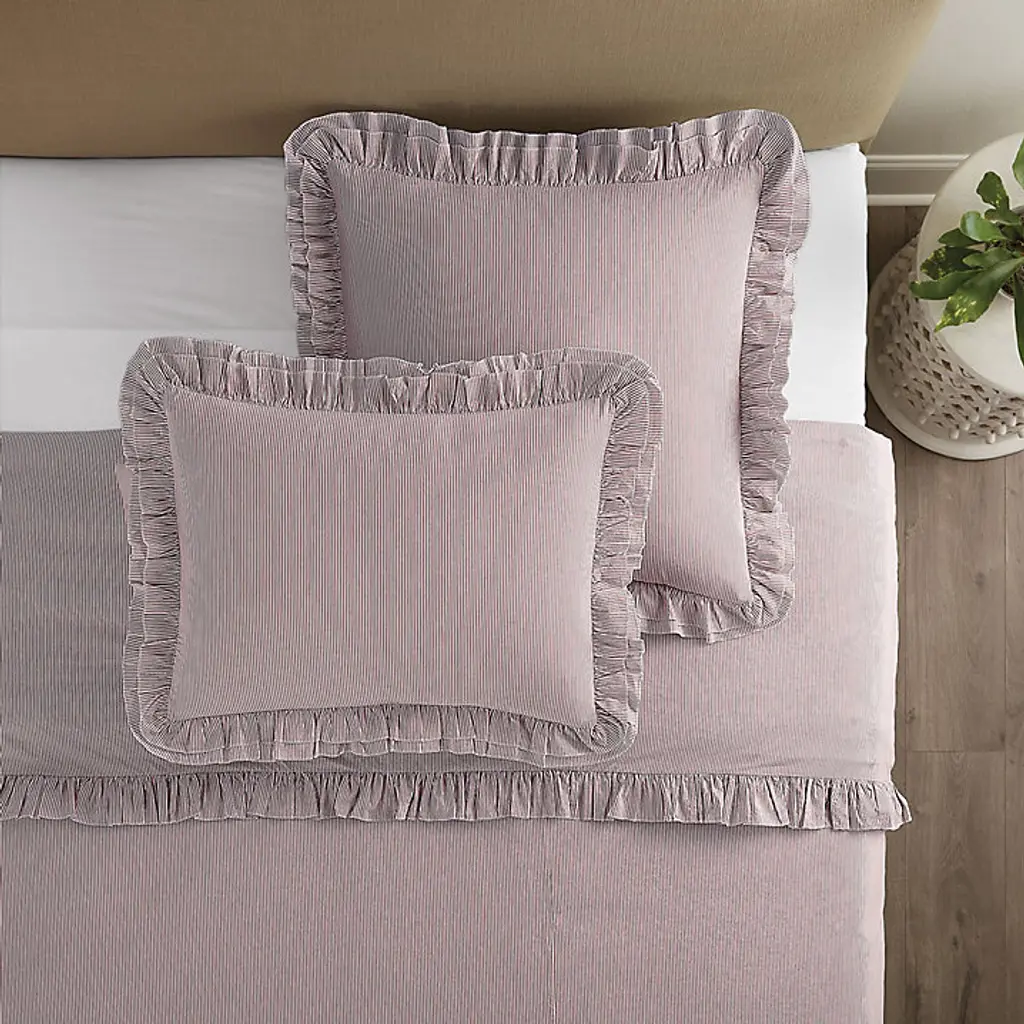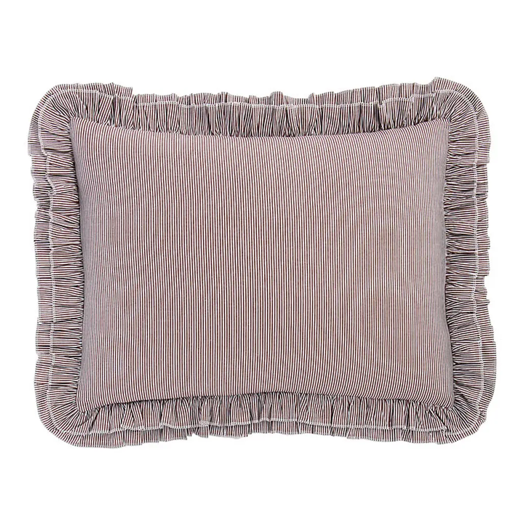 With its fun ruffles and tomboyish ticking stripes, our Effie Ruffled Bedding is a trendy blend of feminine looks and playful attitude. The Sham is made of breathable, slightly slubby cotton percale, and trimmed on all four sides with a layered, double-ruffle flange, so one peeks out from beneath the other for twice the decorative punch. The petite stripes add just enough color and pattern to layer effortlessly with many of our favorite sheeting and bedding ensembles. Effie Ruffled Sham features: