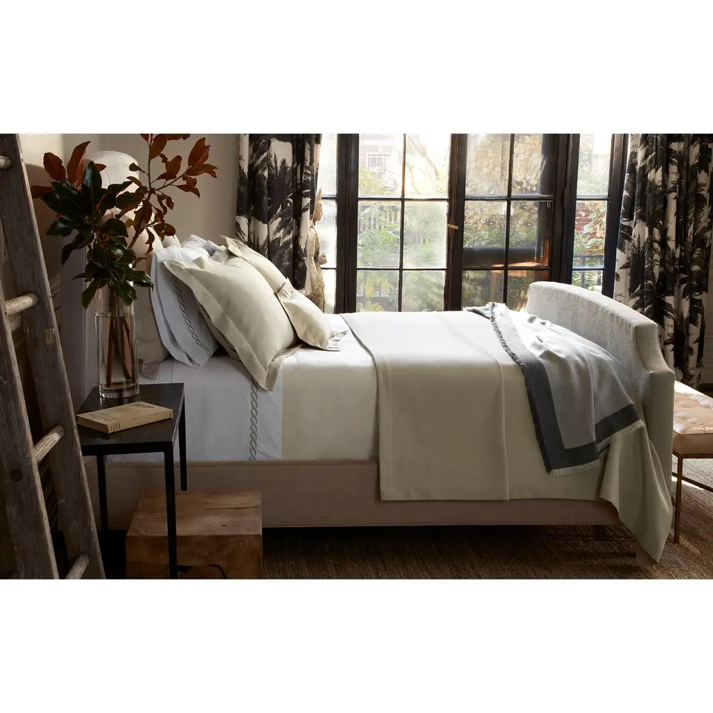 A contemporary, luxurious statement in solid hues, the coverlet and shams of the Matouk Elliot collection feature a soft, pique texture.